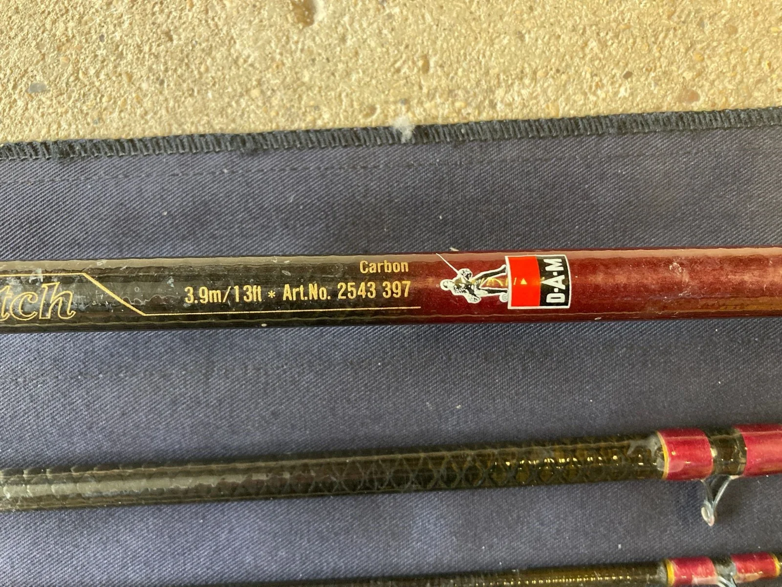 The Vintage DAM Carbomesh Carp Match 13ft float match rod is a classic piece of sporting equipment that harkens back to a bygone era of fishing. Made by DAM this 13ft rod is designed specifically for match fishing. With its durable construction and precise design, this rod is sure to provide hours of enjoyment for anglers looking to recreate the nostalgic experience of fishing in the 1990s.Comes with a rod bag as shown, and is in good condition with only the odd minor lacquer blemish on a few of the rod rings as shown in the pictures, its nicely progressive throughout with power yet still soft in the tip to avoid bumping silvers. I'd never really rated DAM rods, but this one surprised me and so I bought it and it served me well. It's not had much use and now its your turn to be pleasantly surprised, but for much less money than I paid!It will be posted in a sturdy tube.