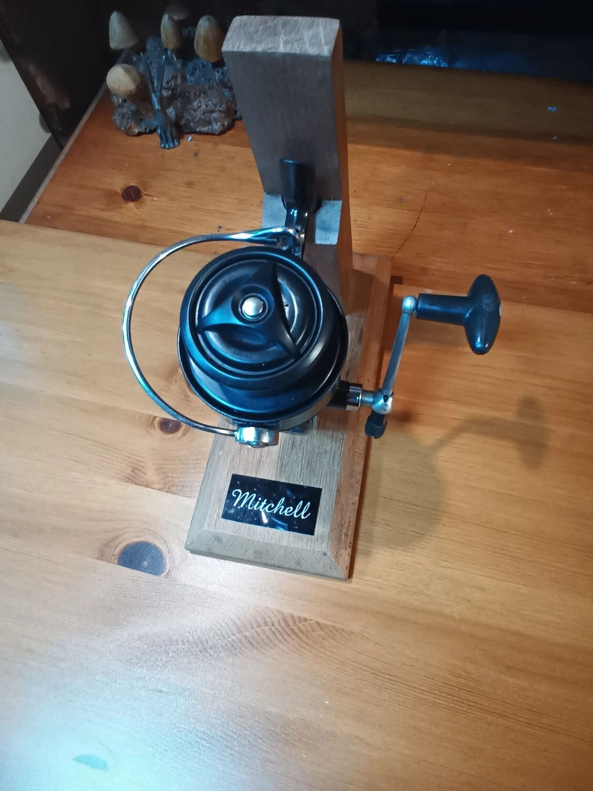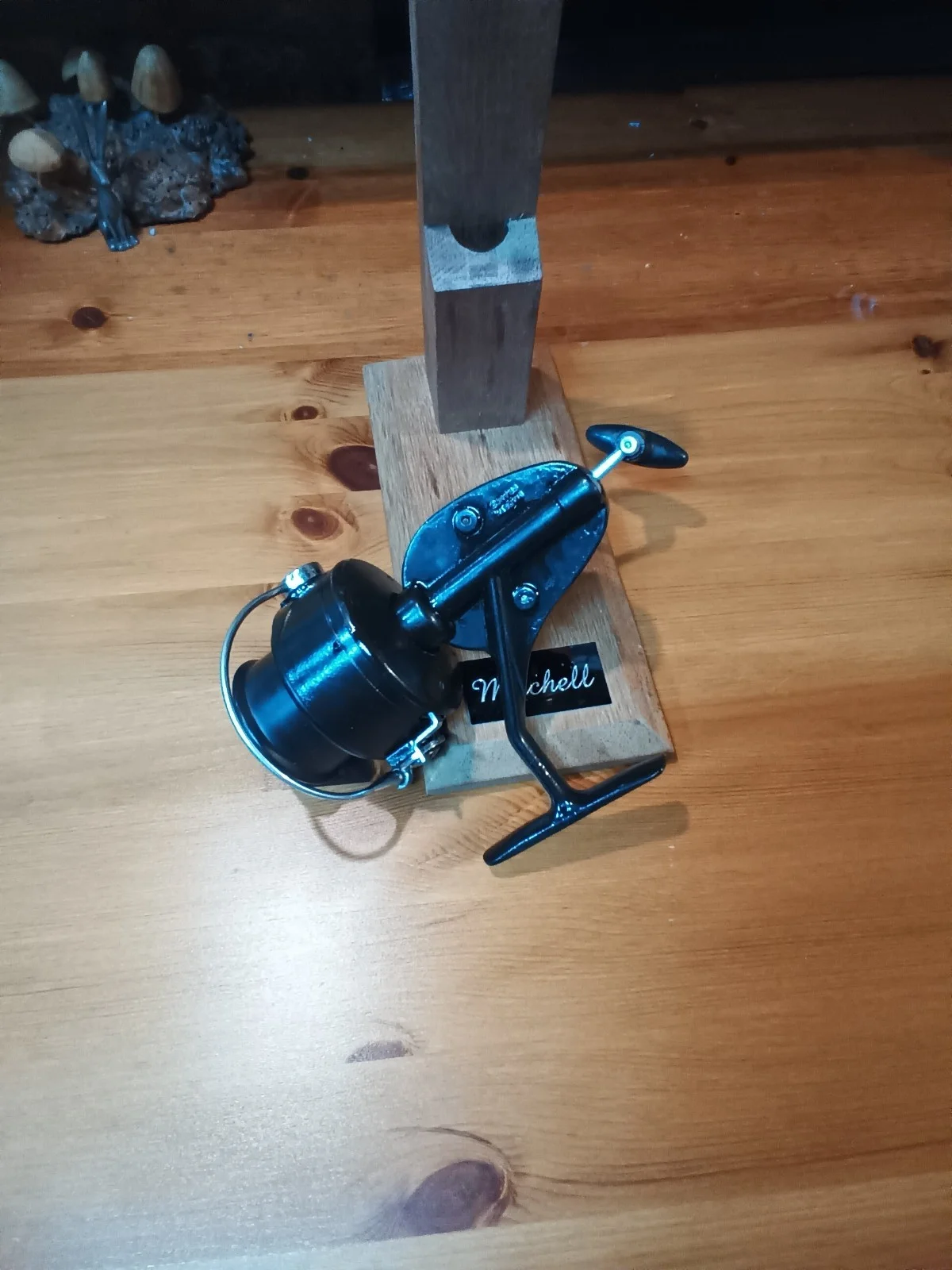 Mitchell 810A this reel has the red gasket and bigger gearing from it's sister the 810 and reinforced foot at body check photos for part of description and in dark brown colour . It has been revamped but is missing the band around head