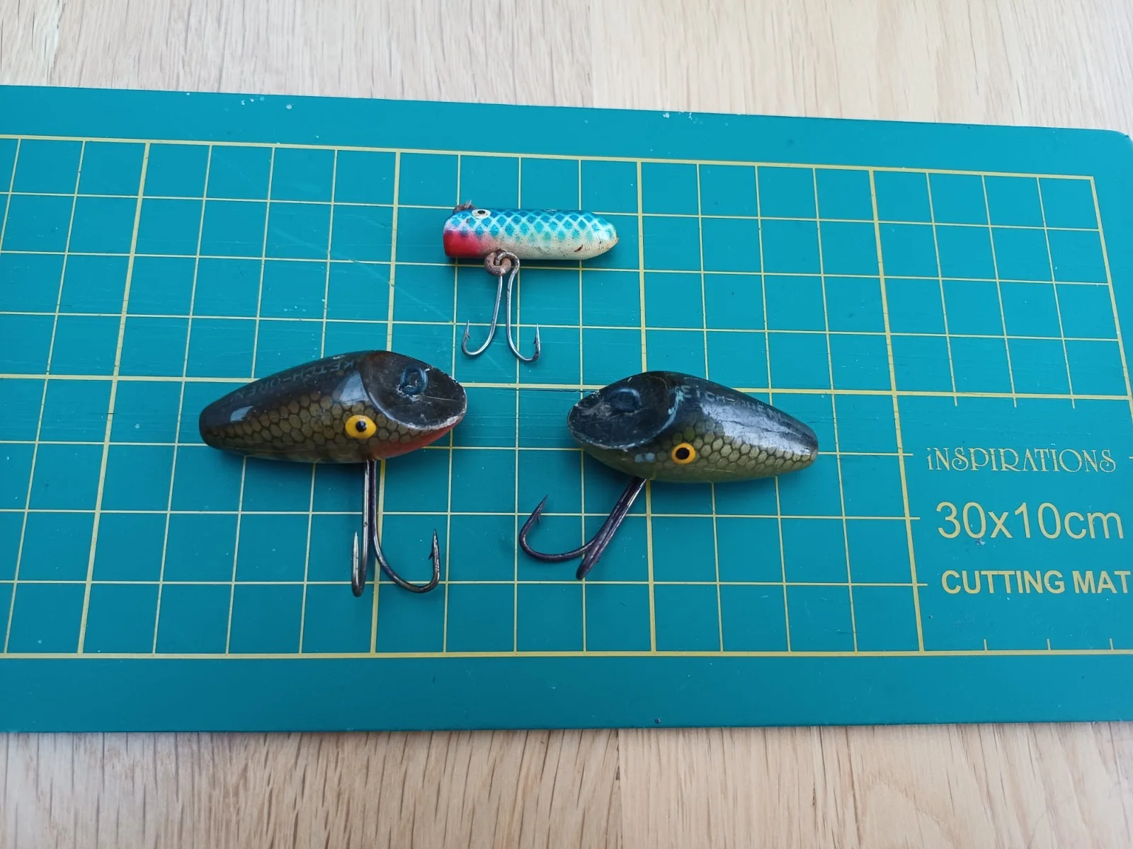 PAIR OF VINTAGE SOUTH-BEND, KETCH-ORENO PLUG LURES & ANOTHER SIMILAR LURE All purchases are well packed & despatched with Royal Mail tracked service & I am always willing to combine postage costs wherever feasible, CLEARLY STAMPED KETCH ORENO ON THEIR BACKS AND IN 2 DIFFERENT DESIGNS THE LENGTH OF EACH LURE IS APPROX 1.5”. BOTH ARE IN USED CONDITION#ONE OF THE EYES OF THE STRIPED EXAMPLE HAS ITS PAINTED BLACK DOT MISSING I HAVE ALSO INCLUDED A TINY 1 1/8” PLUG LURE OF A SIMILAR DESIGN Please study all photos carefully to ascertain both detail & condition of the item, as they form an integral part of the description.