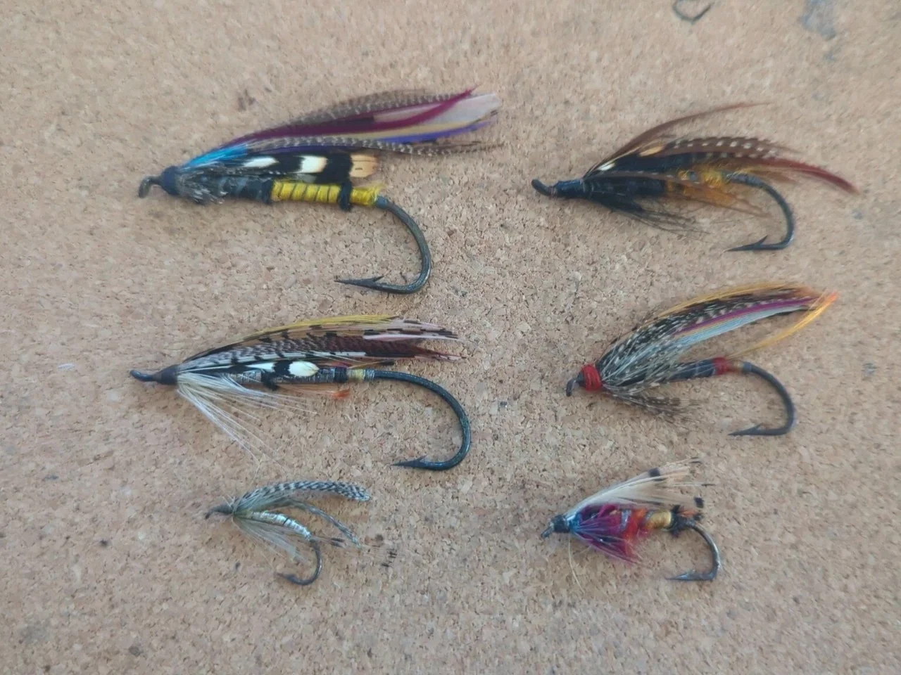 A JOB LOT OF SIX ASSORTED VINTAGE METAL EYED SALMON FLIES IN GOOD LIGHTLY USED CONDITION. SIZES 5/0 TO 8.