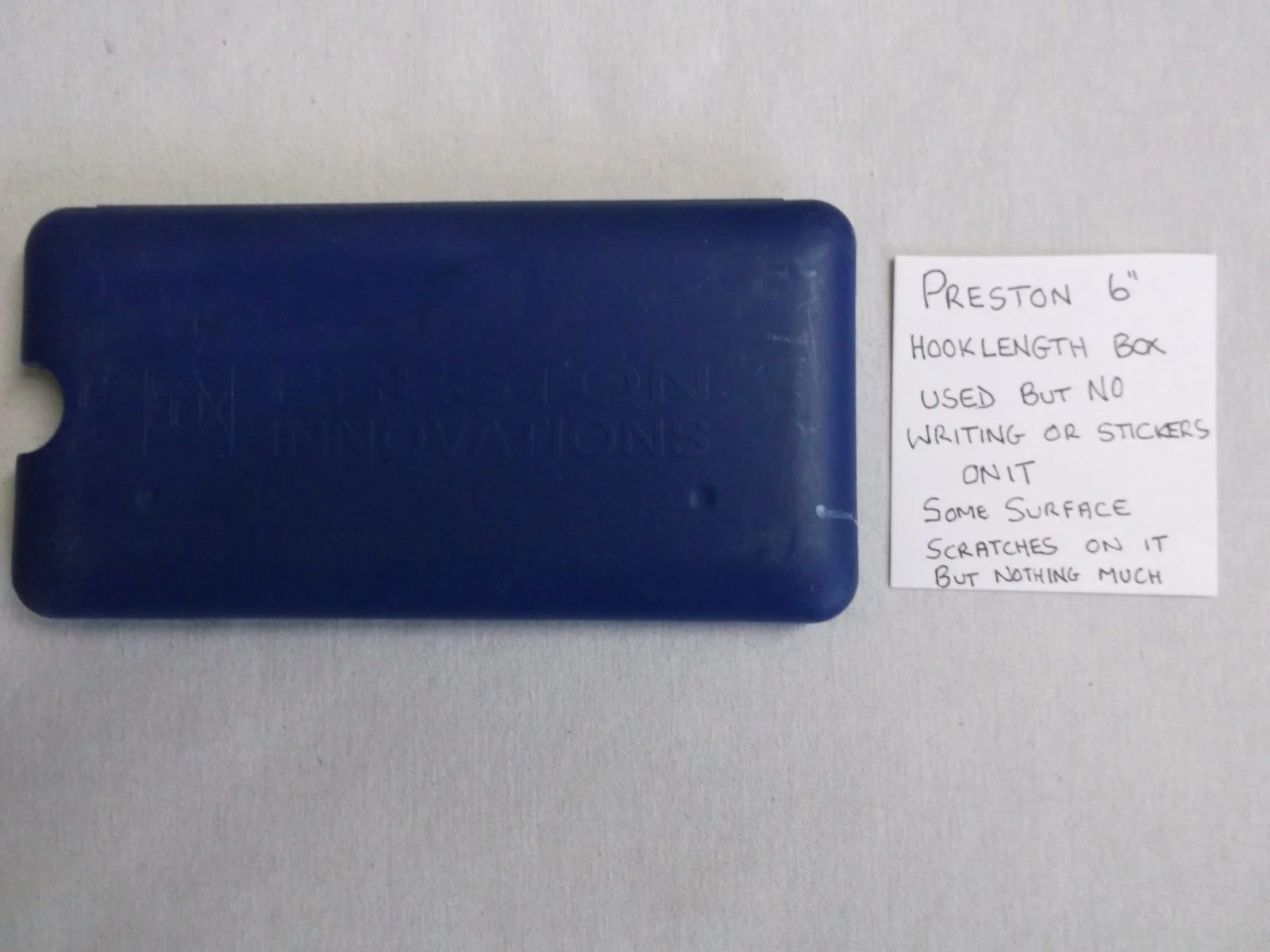 here i have a 6" preston hook length box it is used but is in good condition.it does have some minor surface scratches on it but nothing major