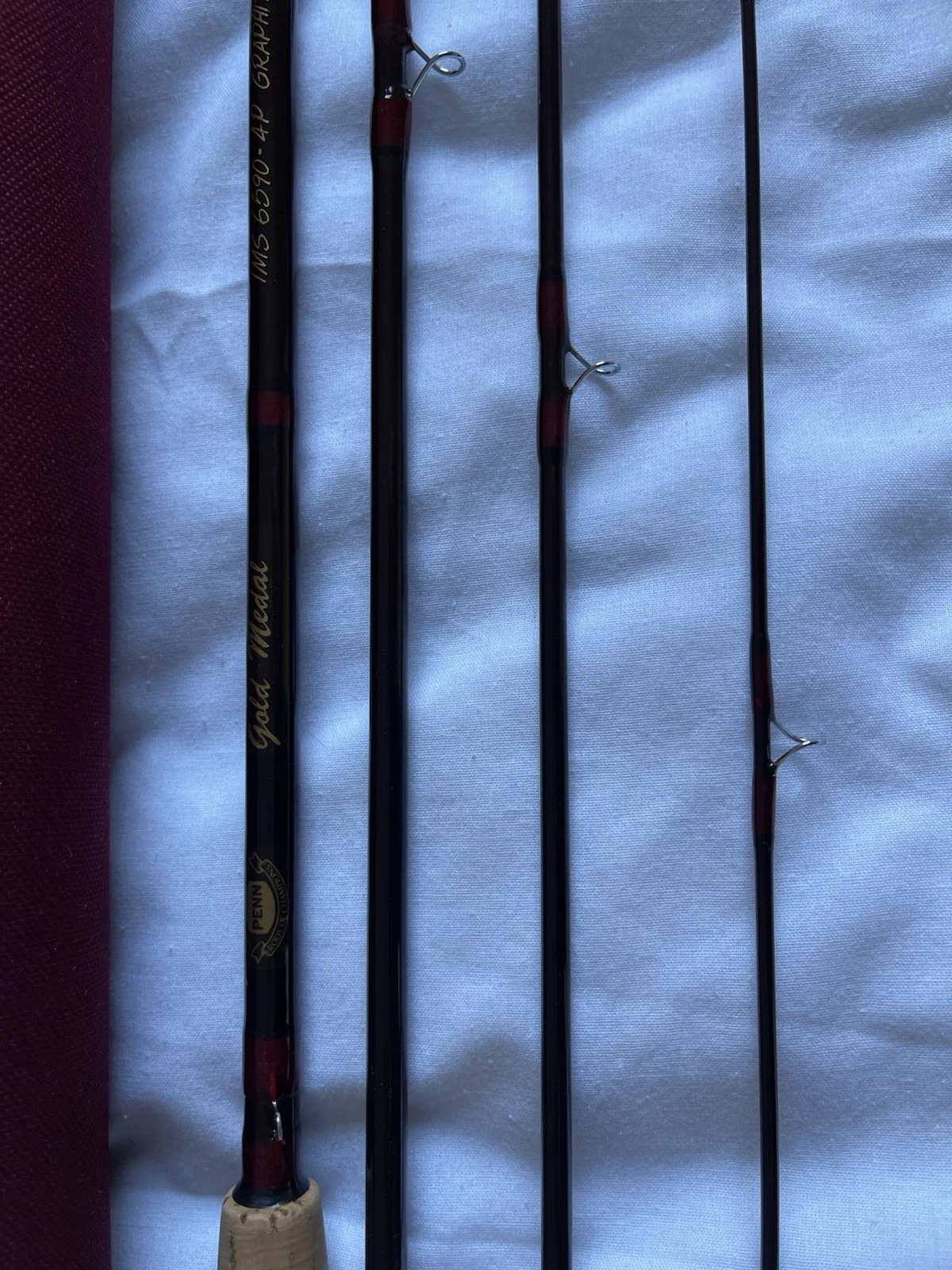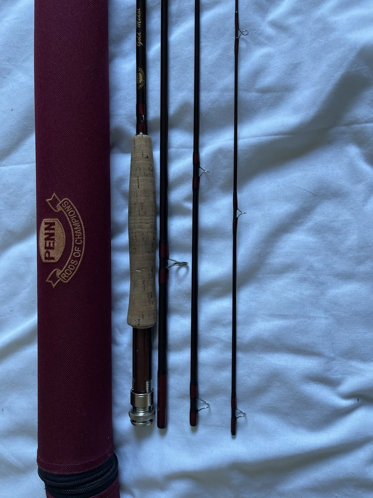 Penn gold medal 9’ 5 weight line 4 piece. Good used condition, very little marks on blank , slightly soiled handle. 4 piece with tube but no bag. Will be sent well packaged.