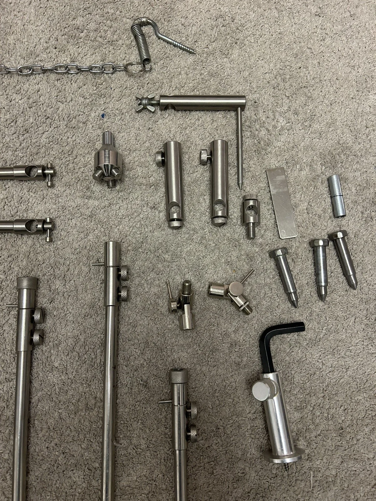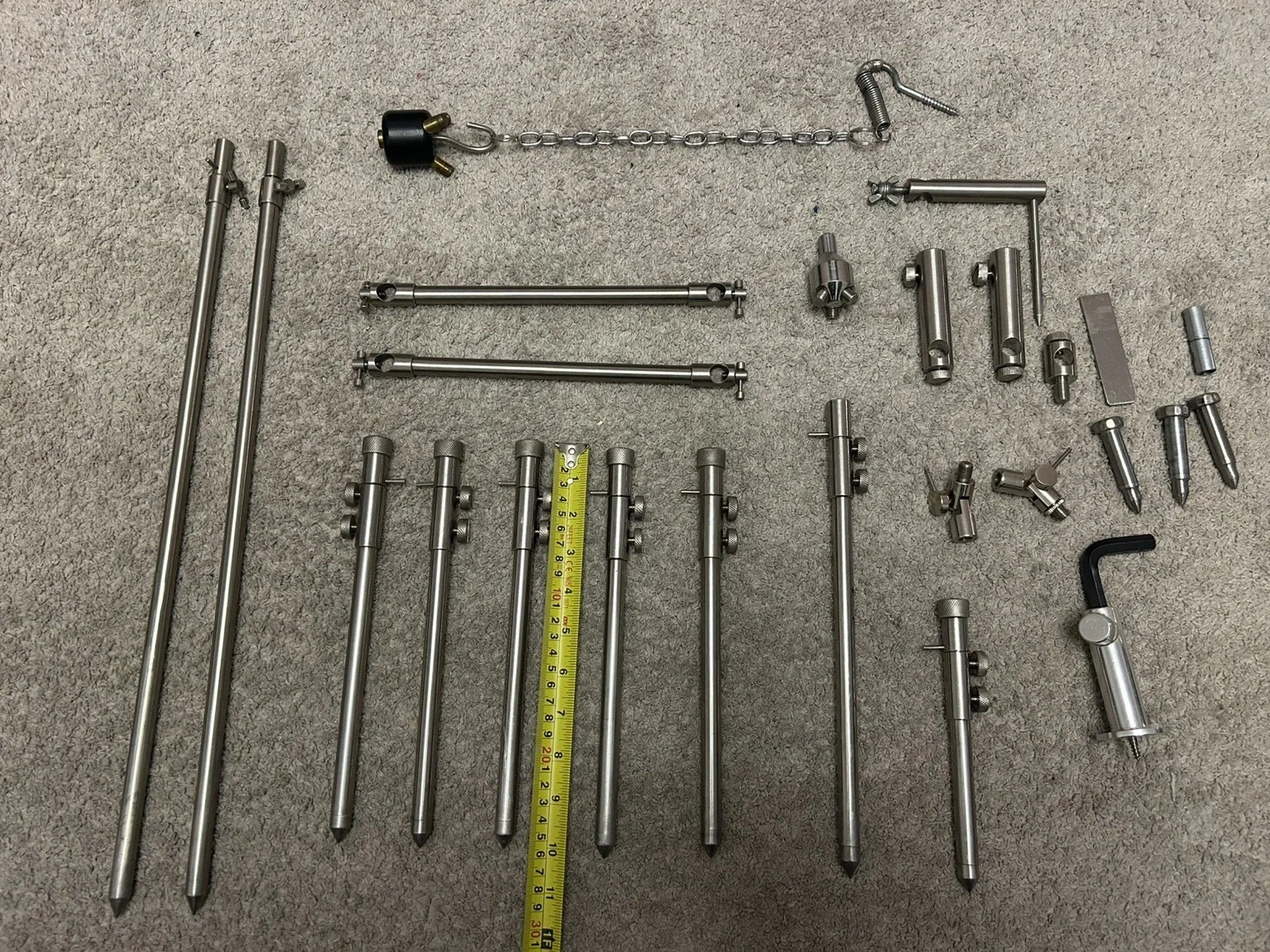 These are my dads who is no longer around. I’m unsure what brand these are. There were some solar parts in there but also NGT, and some other parts are bison, so think there’s a bit of a combination or brands. Please study the photos and try determine this for yourself before Bidding. They are all really good quality though. My dad was a bit of an inventor and so the chain, spring and Allen key is a system he came up with for when fishing on a wooden platform. There’s a small screw at the bottom of the piece that has the Allen key in, that screws into the platform and then the chain/spring keeps the tripod firmly held down to the ground to make it all stable. It can be made into either a rodpod (with the longer rod rests connecting the front and back frames, or a tripod. however there is a part missing (labeled no.1 on the last photo), which would be needed to complete that set up. I’ve done a google image search on that part and it appears to be a part from ‘bison’ which can be bought in sets of 2 for £6/7 and so this could be baught afterwards.Includes 10 and 20” bank sticks.Any other questions please ask. The Stainless Steel Bank Sticks Rod + Tri Pod adaptors stabilisers are a must-have for any angler. Made from durable stainless steel, these bank sticks are 30cm in height
