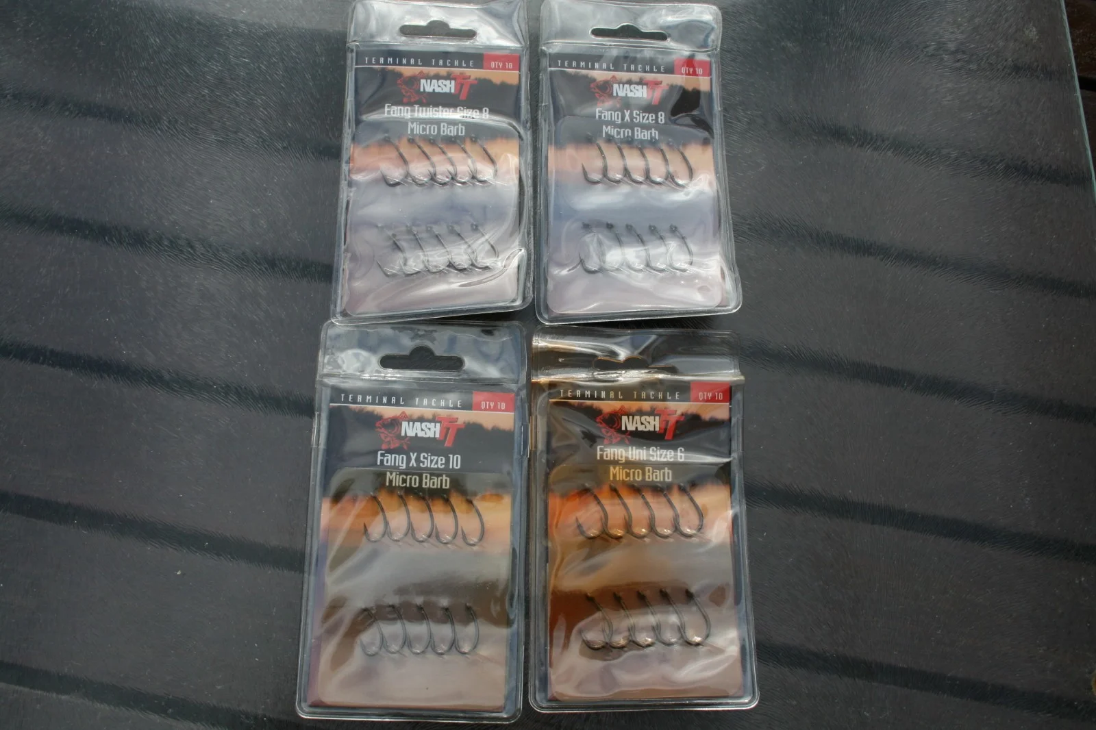 NASH FISHING TACKLE JOBLOT.1 PK 10 FANG UNI SIZE 6 MICRO BARB HOOKS1 PK 10 FANG X SIZE 8 MICRO BARB HOOKS1 PK 10 FANG TWISTER SIZE 8 MICRO BARB HOOKS1 PK 10 FANG X SIZE 10 MICRO BARB HOOKS1 HELICOPTER RIG SYSTEM TUBE STYLE BLACK1 SILICONE TUBING GREEN 2.0mm1 SAFETY BOLT BEAD BLACK1 RUN RINGS MONO BLACKALL ARE PRE-OWNED, NEVER BEEN USED.POST UK ONLY.