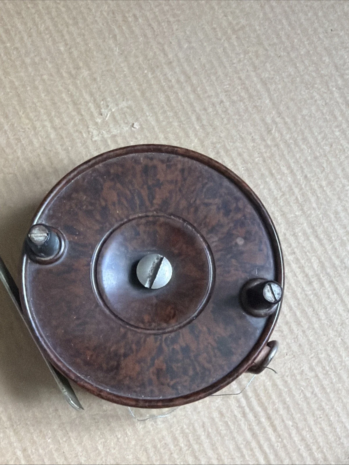 vintage 2.5 inches /6cm dia brass reel with what appears to be wooden handle