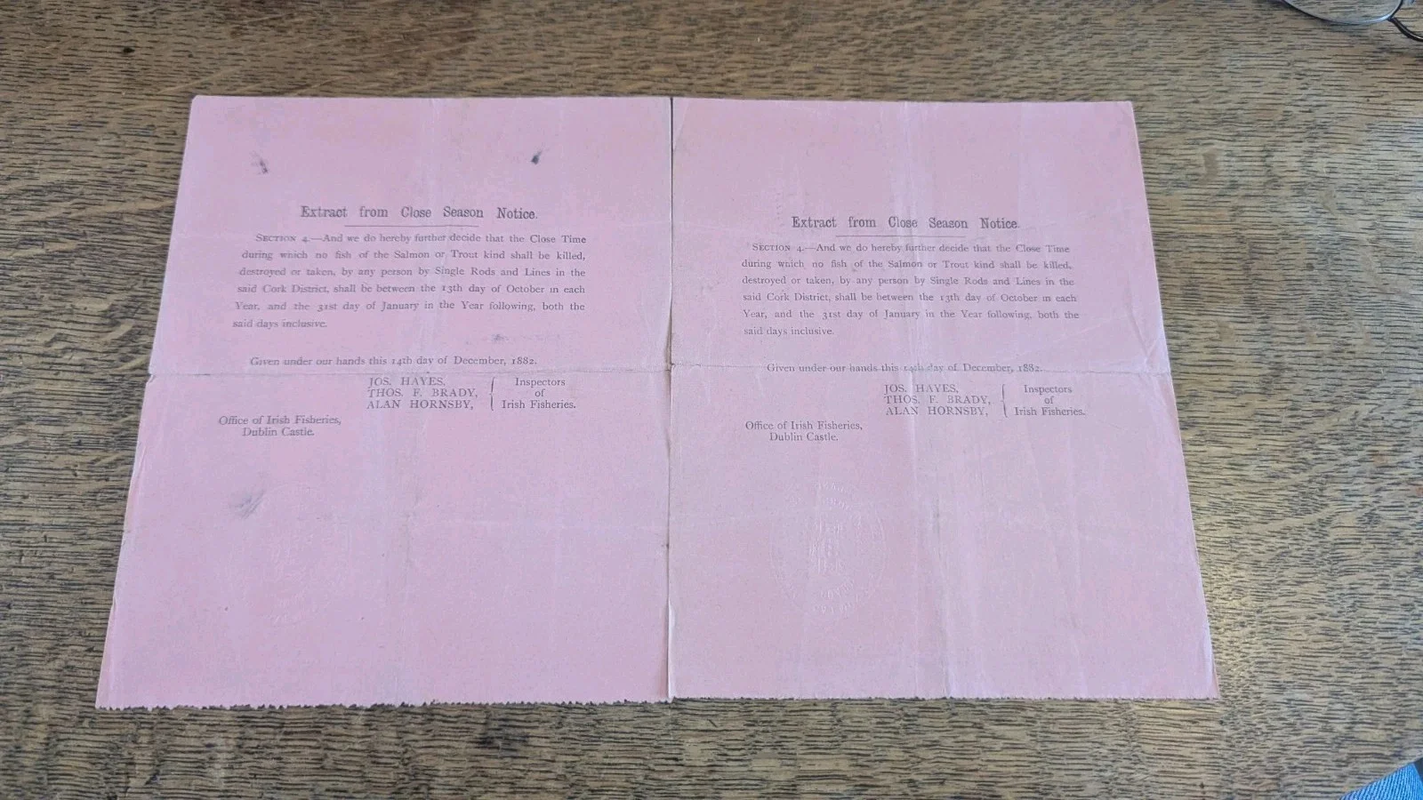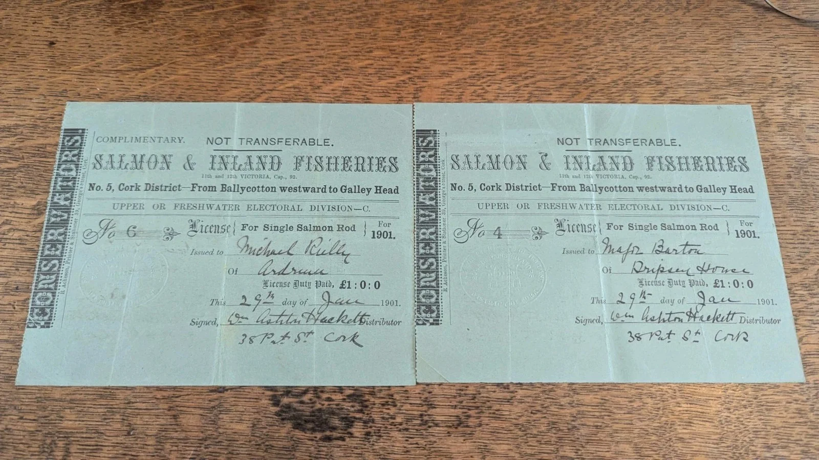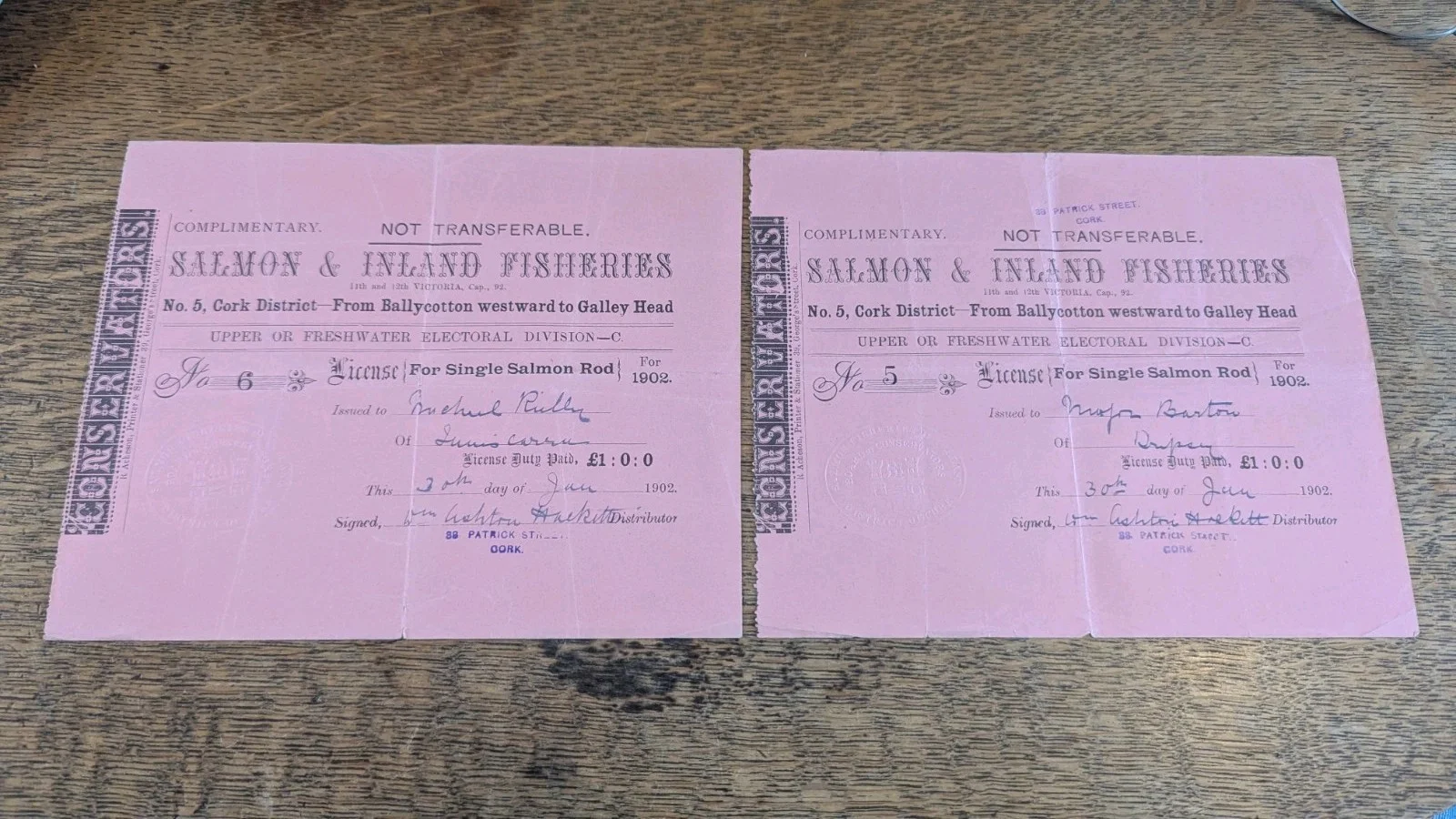 A set of five Irish Salmon and Inland Fisheries Salmon rod licences for County Cork. One from 1901 and two each from 1902 and 1903. All in very nice condition.