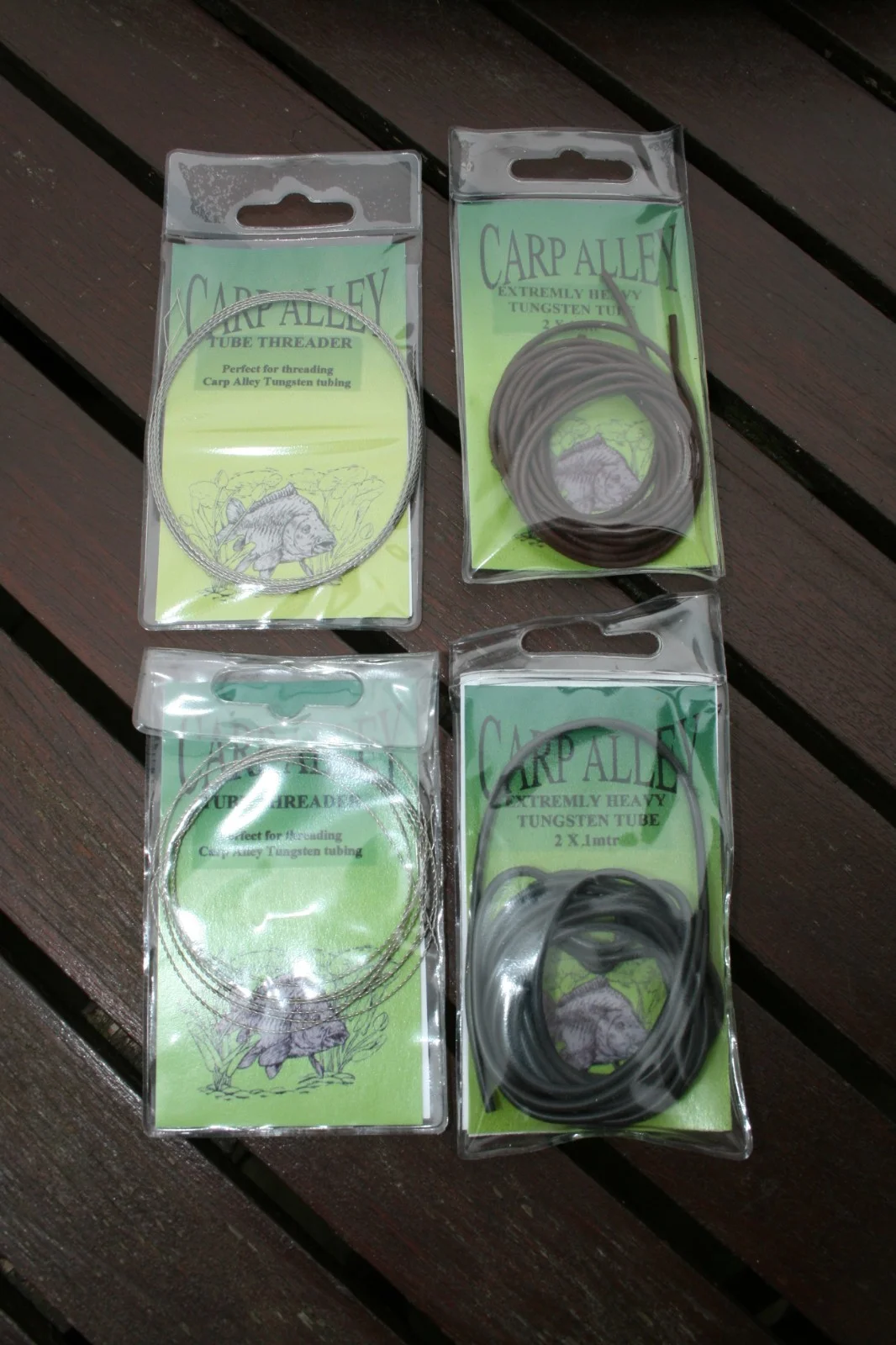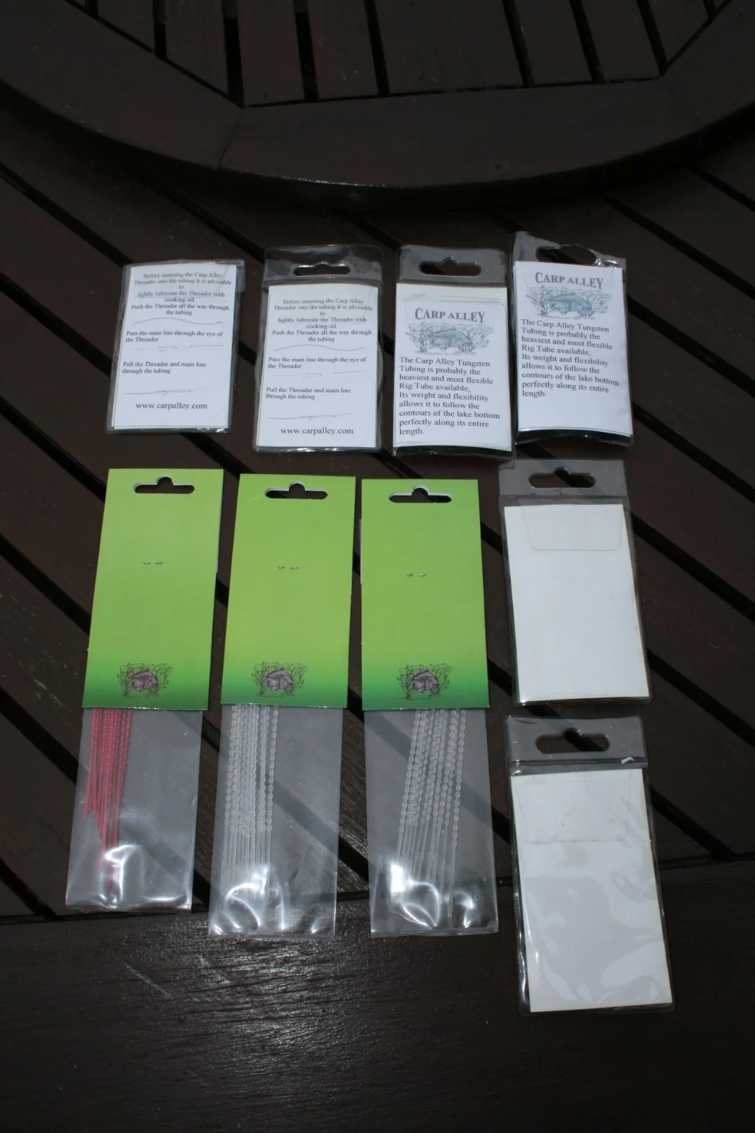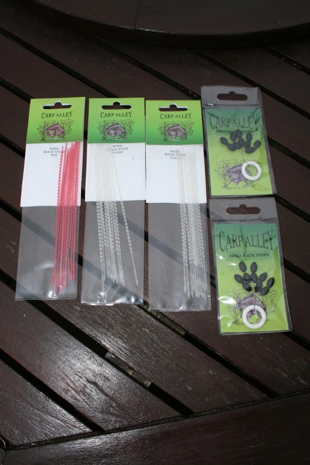 FISHING TACKLE JOBLOT BY CARP ALLEY.1 PACK OF BOILIE STOPS RED.2 PACKS OF BOILIE STOPS CLEAR.2 PACKS OF MEGA BACK STOPS.2 PACKS OF TUBE THREADERS.2 PACKS OF EXTREMELY HEAVY TUNGSTEN TUBES, 1 GREEN, 1 BROWN.ALL PRE-OWNED BUT NEVER BEEN USED.POST UK ONLY.