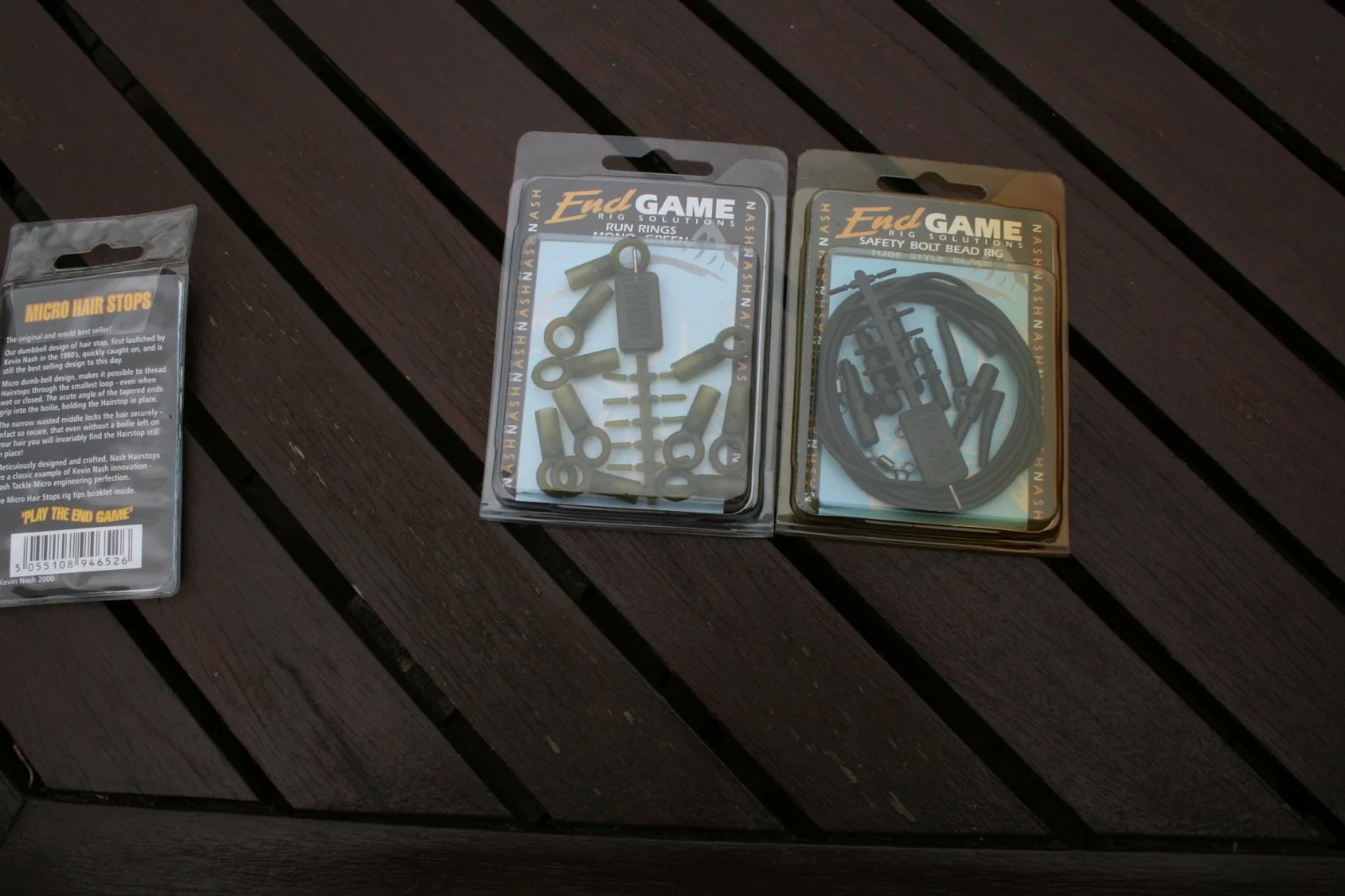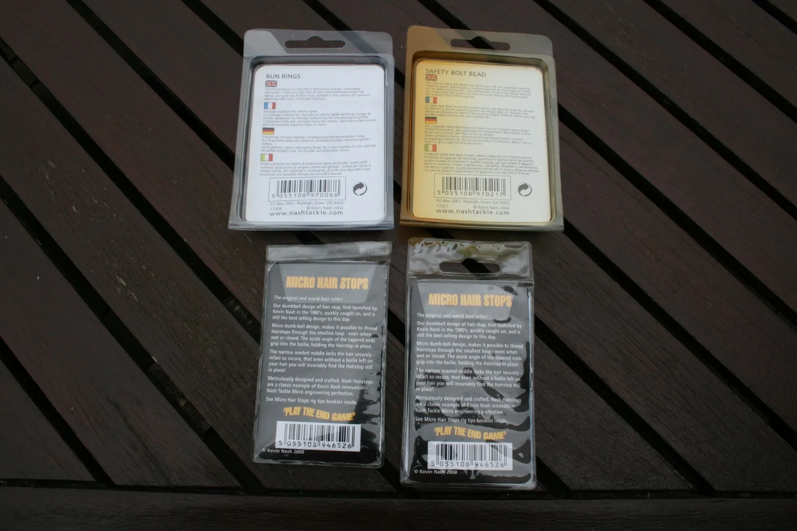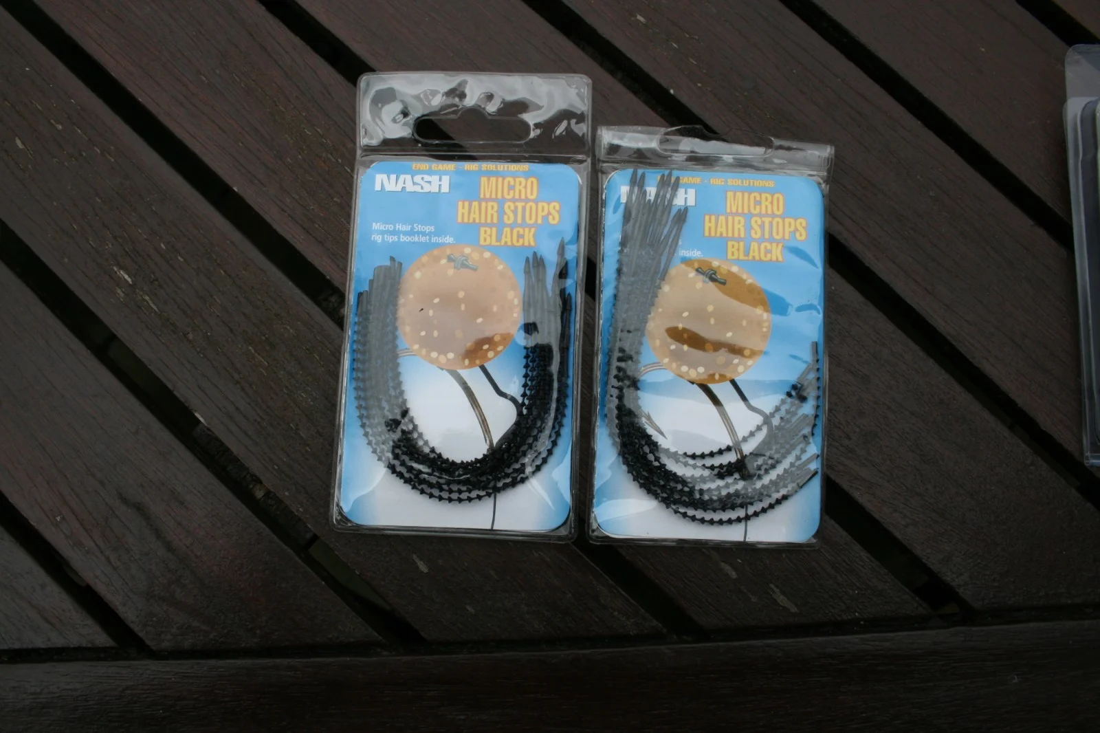 NASH FISHING ITEMS.2 PACKS OF MICRO HAIR STOPS, BLACK.1 PACK OF RUN RINGS MONO GREEN.1 PACK OF SAFETY BOLT BEAD RIG TUBE STYLE BLACK. ( PACKAGE IS MARKED.)ALL ARE PRE-OWNED NEVER BEEN USED.POST UK ONLY.