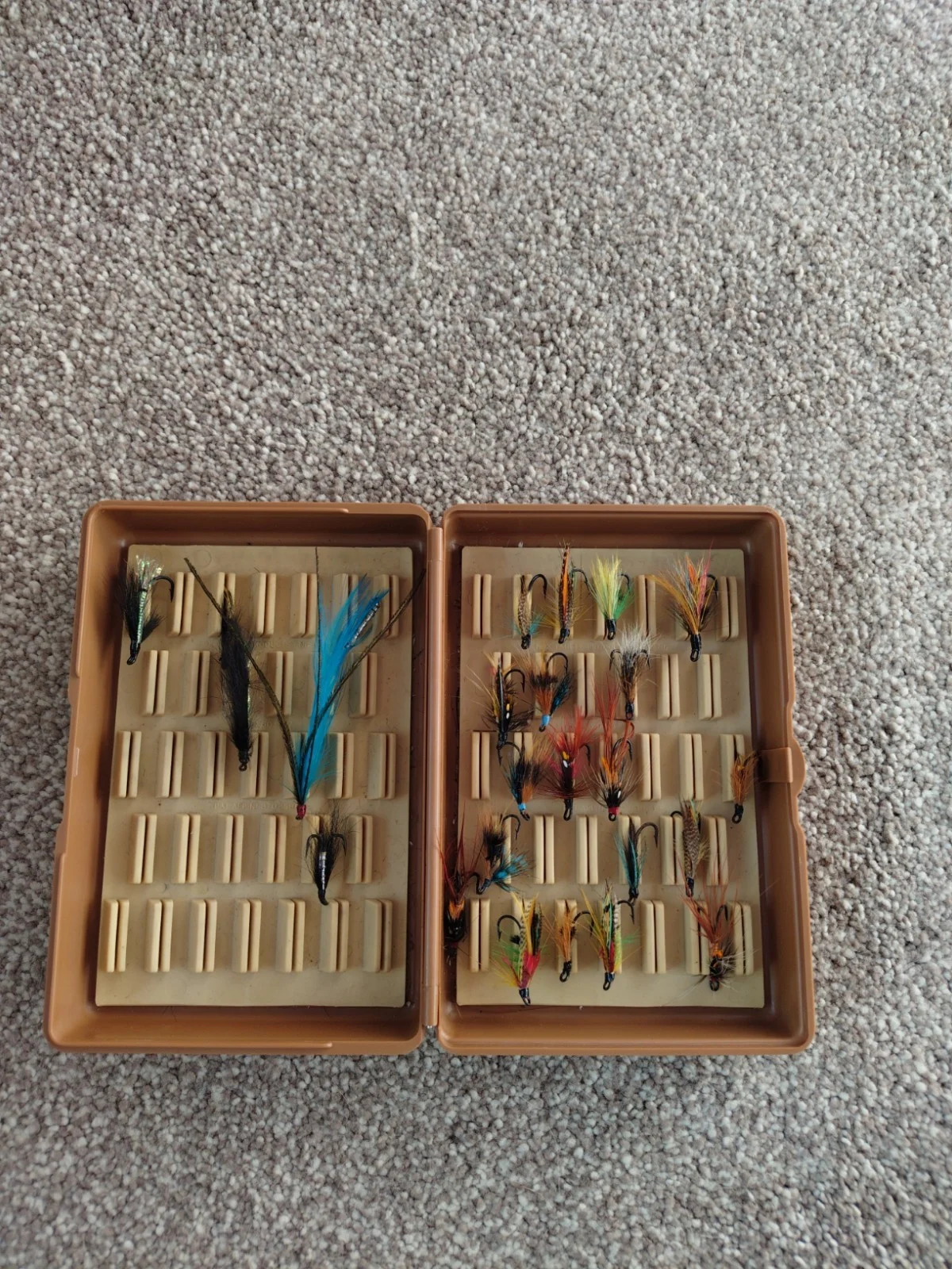Salmon & Sea Trout fly fishing box, measures 15cm x 10cm x 4.5cm. This box is plastic, it floats and holds a maximum of 66 flies.There are a total of 23 flies in the box for sale as one lot. The flies are of various sizes and comprise of 1 tandem, 2 single, 2 triple and 18 doubles. Some have been lightly used, the others haven't.Reluctant sale as my fishing days are now over.