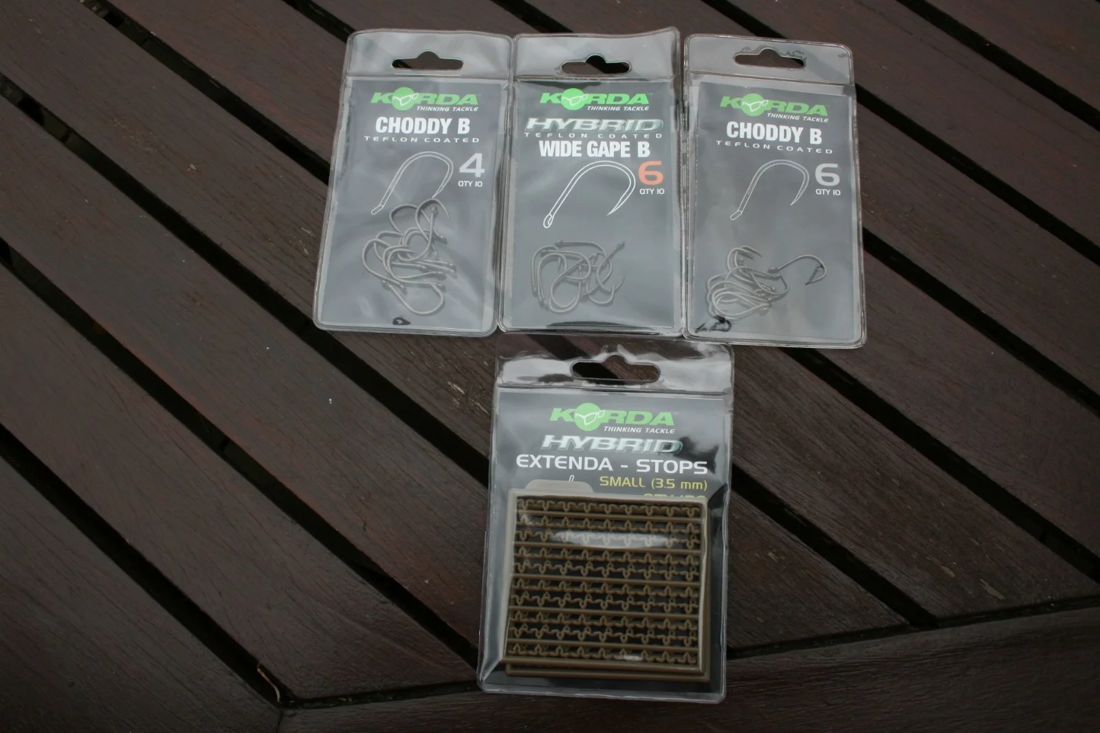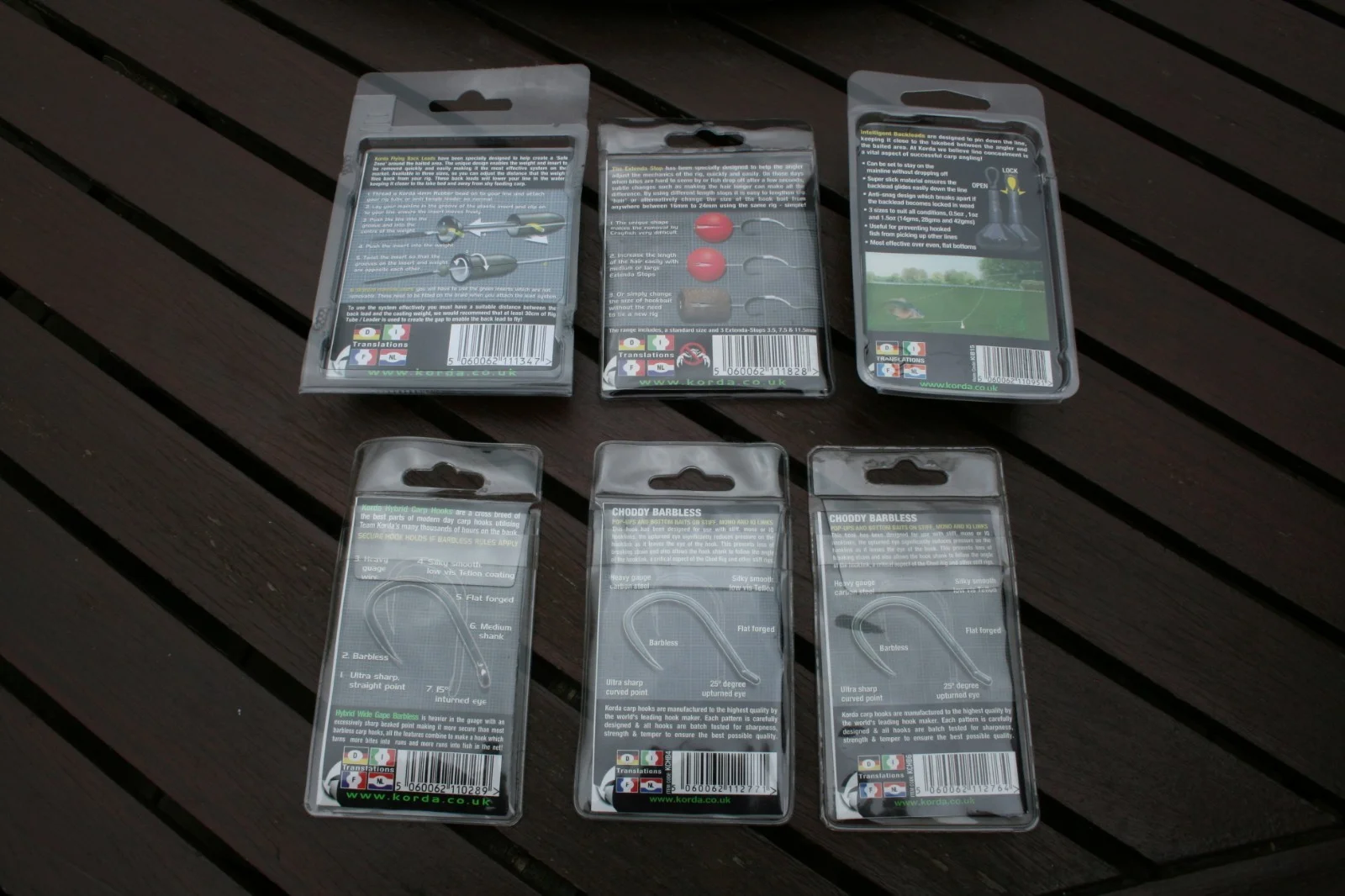 KORDA JOBLOT1 PACK OF INTELLIGENT BACKLEADS, 42gms/1.5oz. QTY 3.1 PACK OF SAFETY ZONE FLYING BACK LEADS, KWIK CHANGE SYSTEM, QTY 6, INC 10 4mm RUBBER BEADS.1 PACK OF 10 TEFLON COATED WIDE GAPE B SIZE 6 HOOKS.1 PACK OF 10 CHODDY B TEFLON COATED , SIZE 4 HOOKS.1 PACK OF 10 CHODDY B TEFLON COATED , SIZE 6 HOOKS.1 PACK OF HYBRID EXTENDER STOPS SMALL (3.5mm ) ALL ARE PRE-OWNED, NEVER BEEN USED.POST UK ONLY.