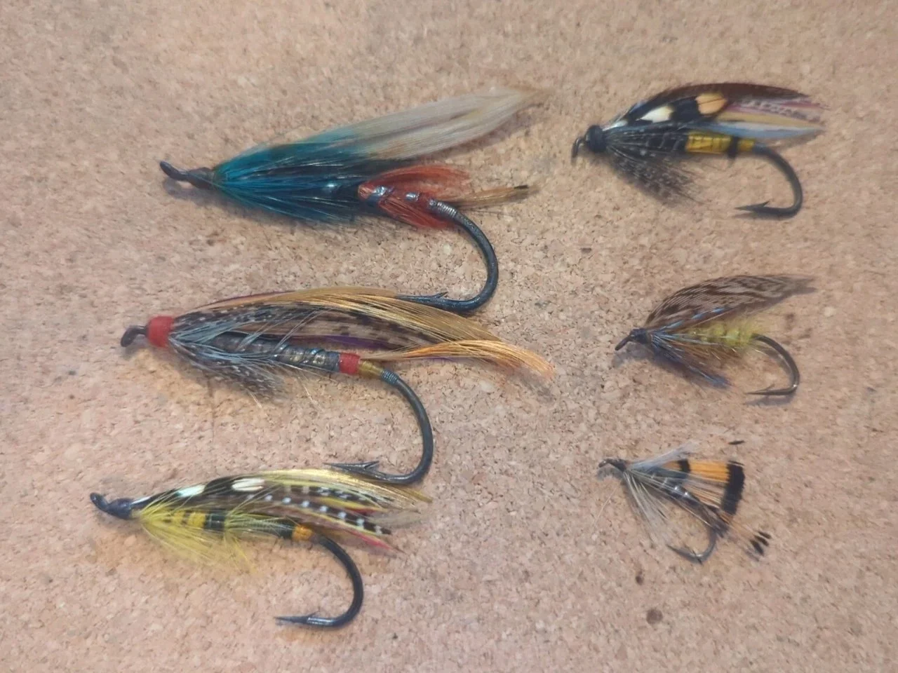 JOB LOT OF SIX ASSORTED VINTAGE METAL EYED SALMON FLIES, SIZES 7 TO 5/0