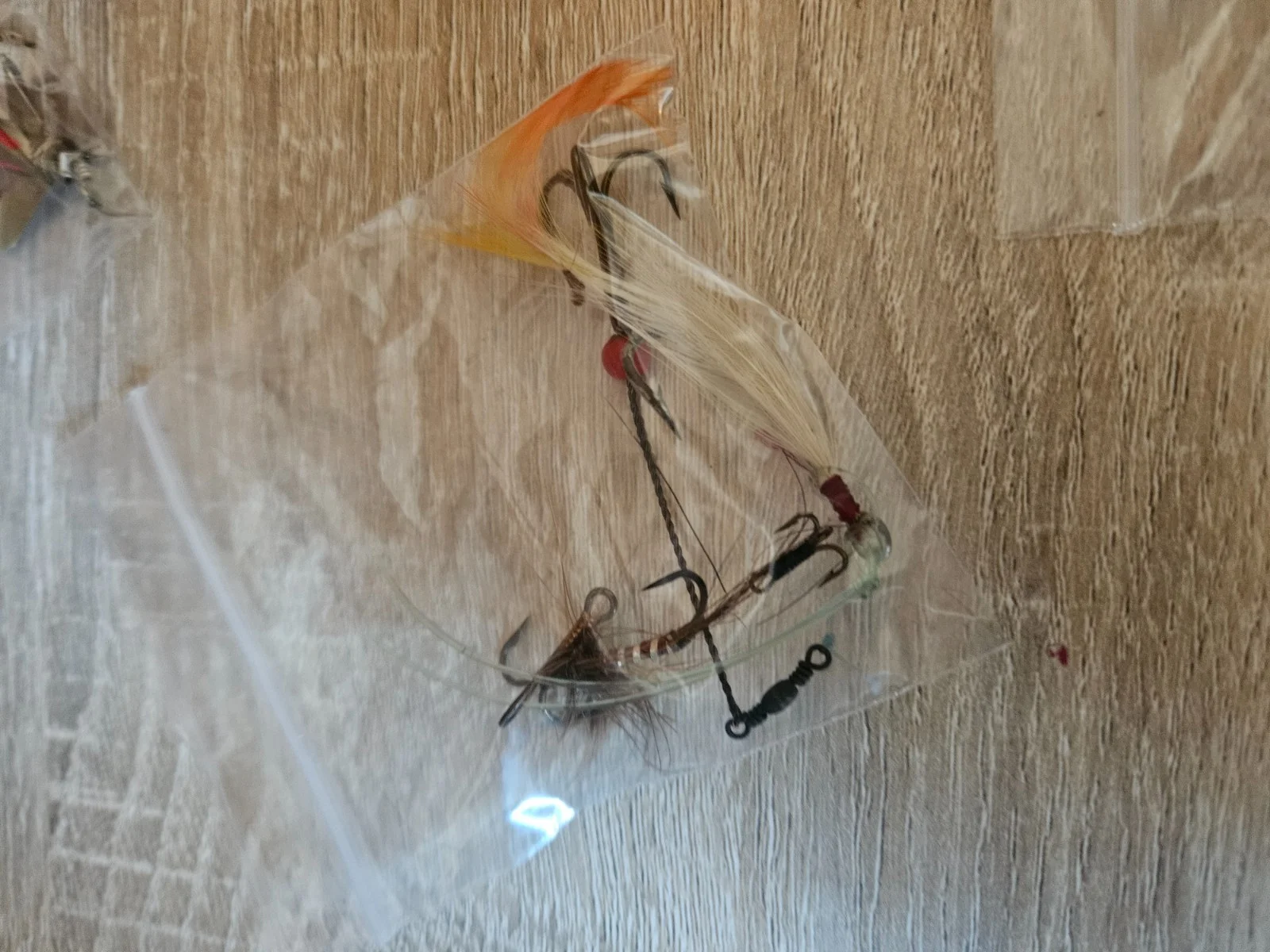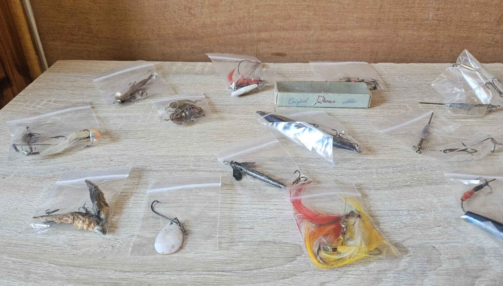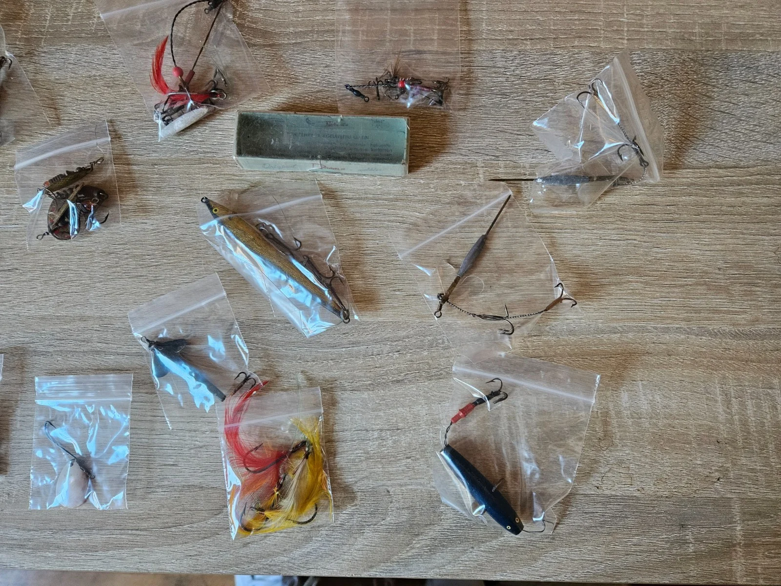 Job Lot Vintage Mixed Wooden / Plastic Minnor Spinner Fishing Lures, Flies & Hooks inc. Mepp's & Rapala Box