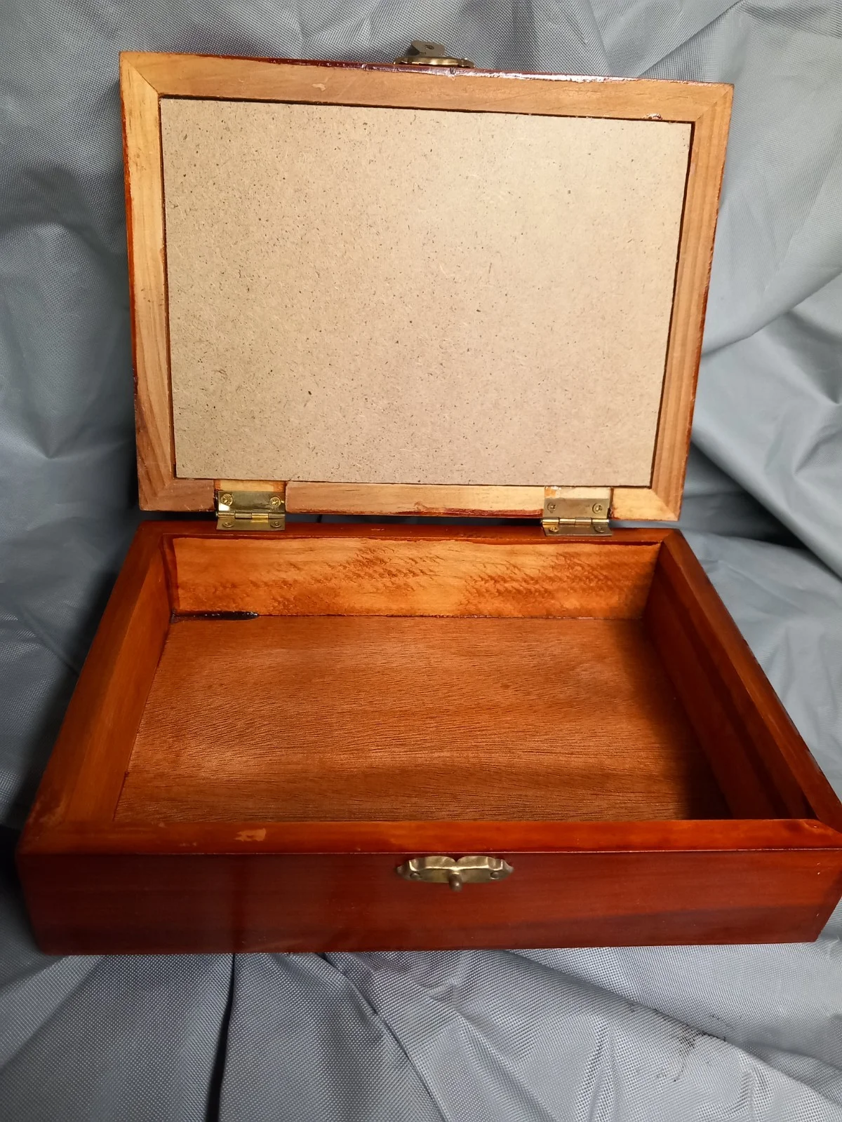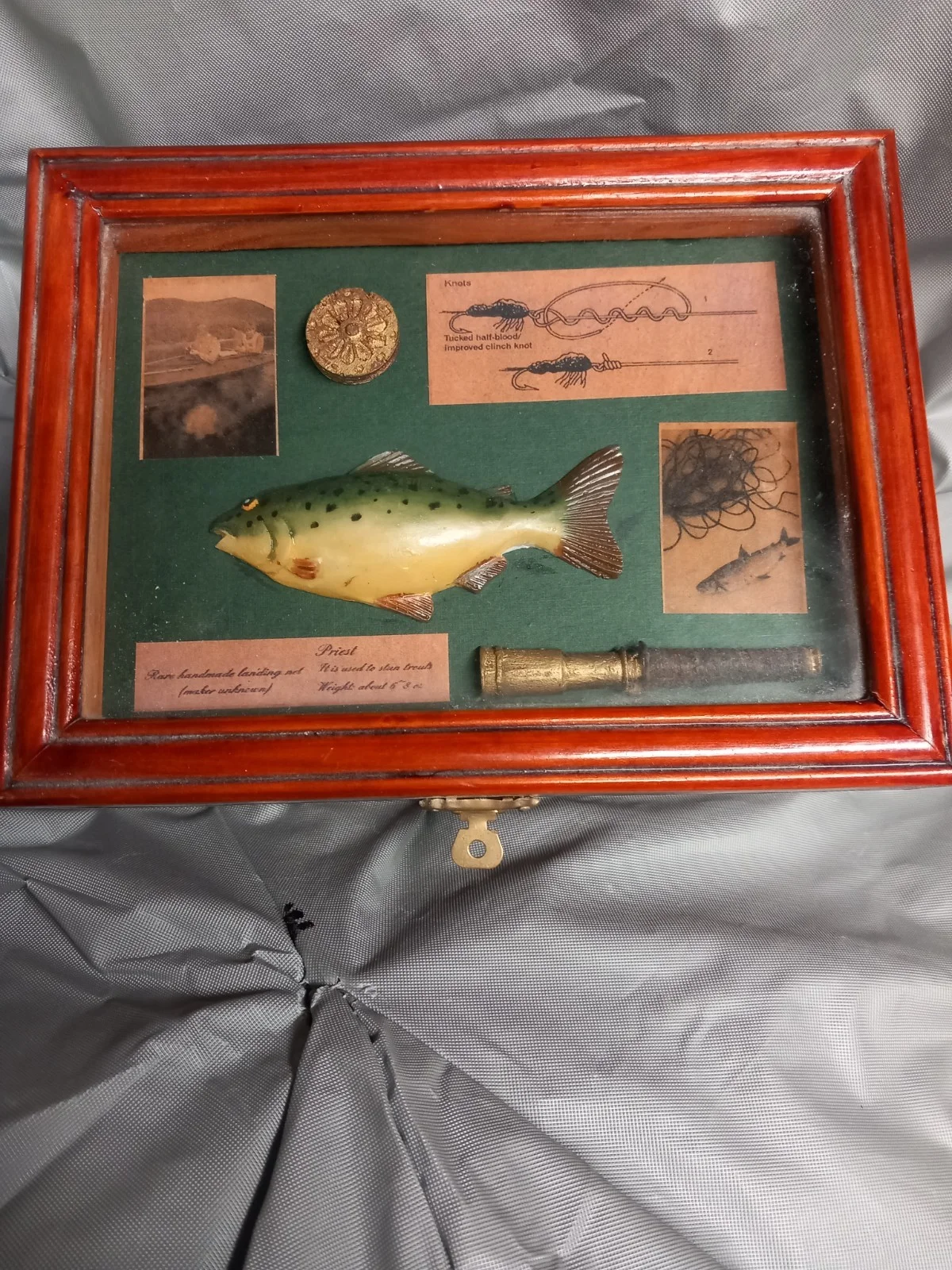 A small shadow storage box for the fishing enthusiast . It measures 20cms long x 15cms deep and 6 cms high. Please study the pictures as they form the description.