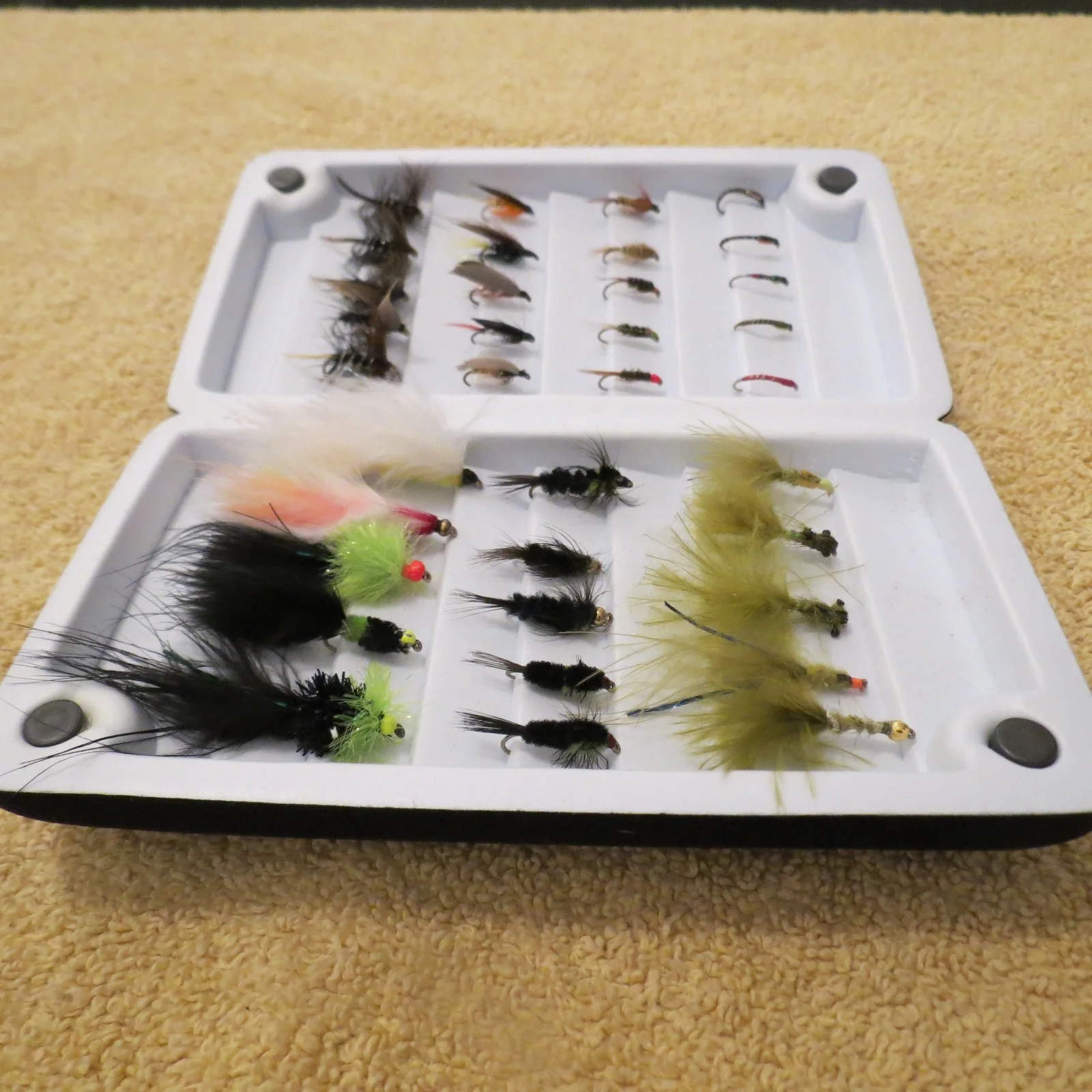 A BRAND NEW STONEFLY MAGNECTIC CLOSING FLY BOX WITH AN ASSORTMENT OF NEW TROUT FLIES 5) BUZZERS. 5) NYMPHS. 5) WETS. 5) DRIES. ON ONE SIDE THE OTHER SIDE IT HAS 5) DAMSELS. 5) MONTANAS. AND 5) LURES 35 NEW TROUT FLIES