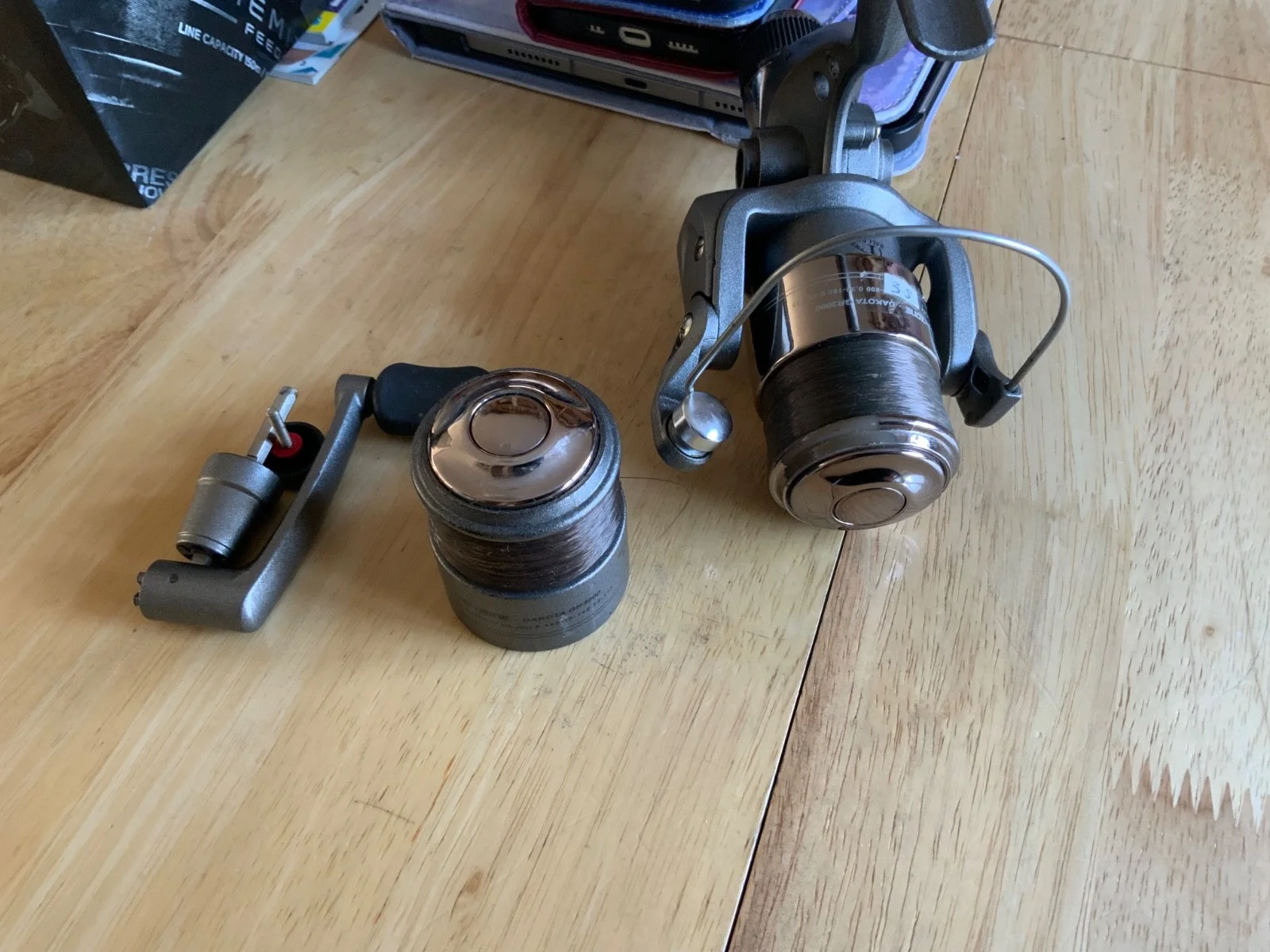 Hi here we have a FISHZONE Dakota gr3000 with spare spool can be left or right handed the drug is at the rear has push button quick release the line on the spools is as follows 3.5lb one one the other 6lb this will be a good starter reel if just starting out noning special please study the pictures as this is part of the description.If you have any questions about the said item please email me and thanks for looking.With ref to postage will be sent out via Royal Mail I do not use Evri as they are crap and untrustworthy when it come to Delv. Or you are welcome to pick up item just let me know.Thank you