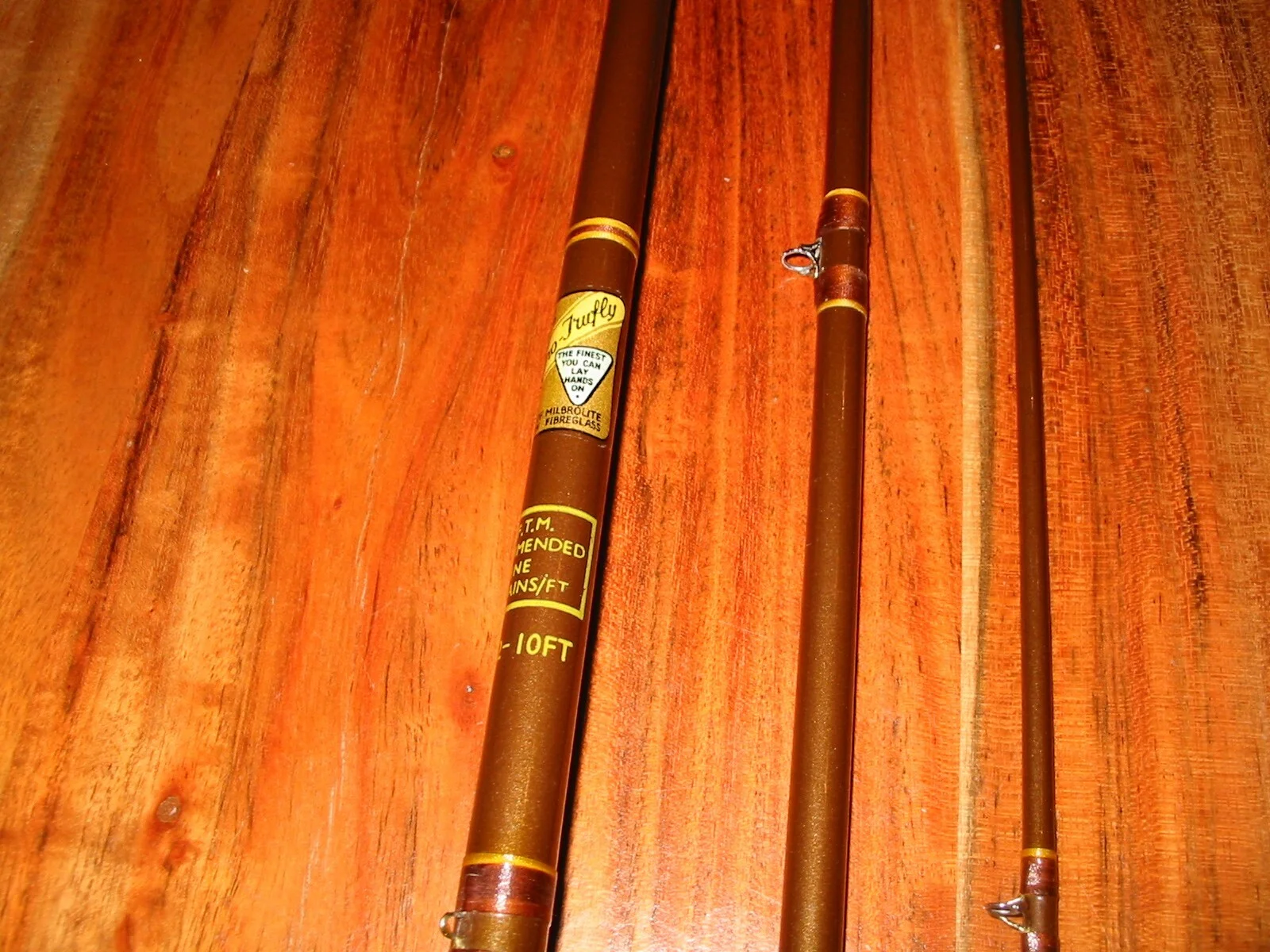 An old / vintage Milbro Scotland Trufly F86/2-10ft Three piece fly fishing rod.Serial No. 864 AFTM recommended line is 6 grains per foot so to my working out # 6 - 7Three piece Milbrolite hollow fibreglass construction. Total weight is approx 8.5oz (242g) Gloss brown blank, Gold tipped deep red whippings. Nine eyes including the red agate tip & butt rings. A hook keeper ring just above the ten inch cork handle.Bronze coloured aluminium screw winch reel fitting. Sadly no bag.Condition:-In excellent, lightly used condition. Scratch free blank. Rings, whippings and corks are all sound. Decals are all in excellent condition, clear and readable. Plenty of life left in the brass ferrules. Winner will not be disappointed.Please see all the photographs as these do form part of the listing description.--------------------------------------------------------------------------------------------------------------Please note I always allow my auctions to run full term, so no "Buy it now".---------------------------------------------------------------------------------------------------------------I do try to provide good photographs and describe the items I list to the best of my ability. I'm not an expert in any particular field so please do ask if you have any questions or require clarification with regards to any listing.In the unlikely event that you encounter a problem with any purchase please do contact me in the first instance.Thank you for viewing this item, please also view the other items I have listed and good luck if you are placing a bid.--------------------------------------------------------------------------------------------------------------------------------------------------------------