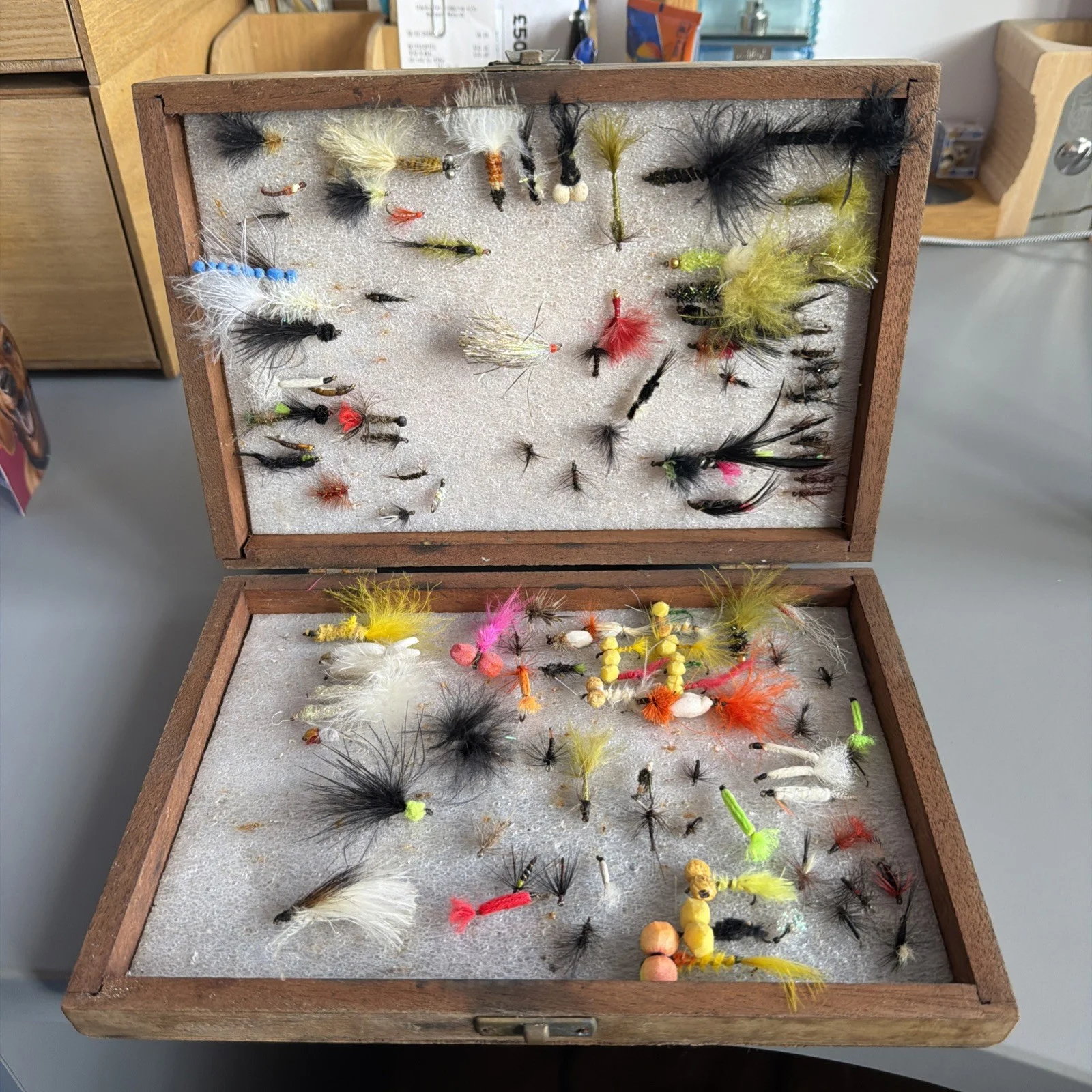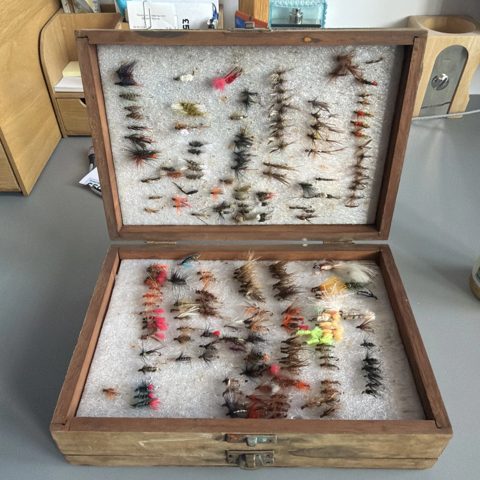 See pictures loads of fliesMy late Dad fished for 50+ years and this was his trusted box of fliesMoney going towards granddaughter holiday.