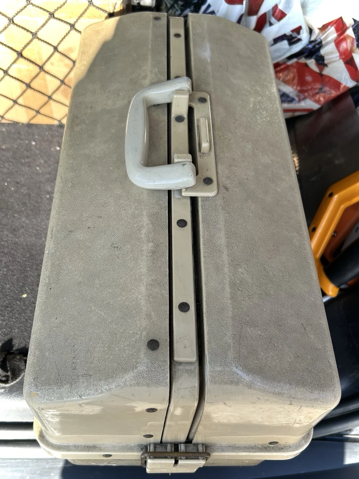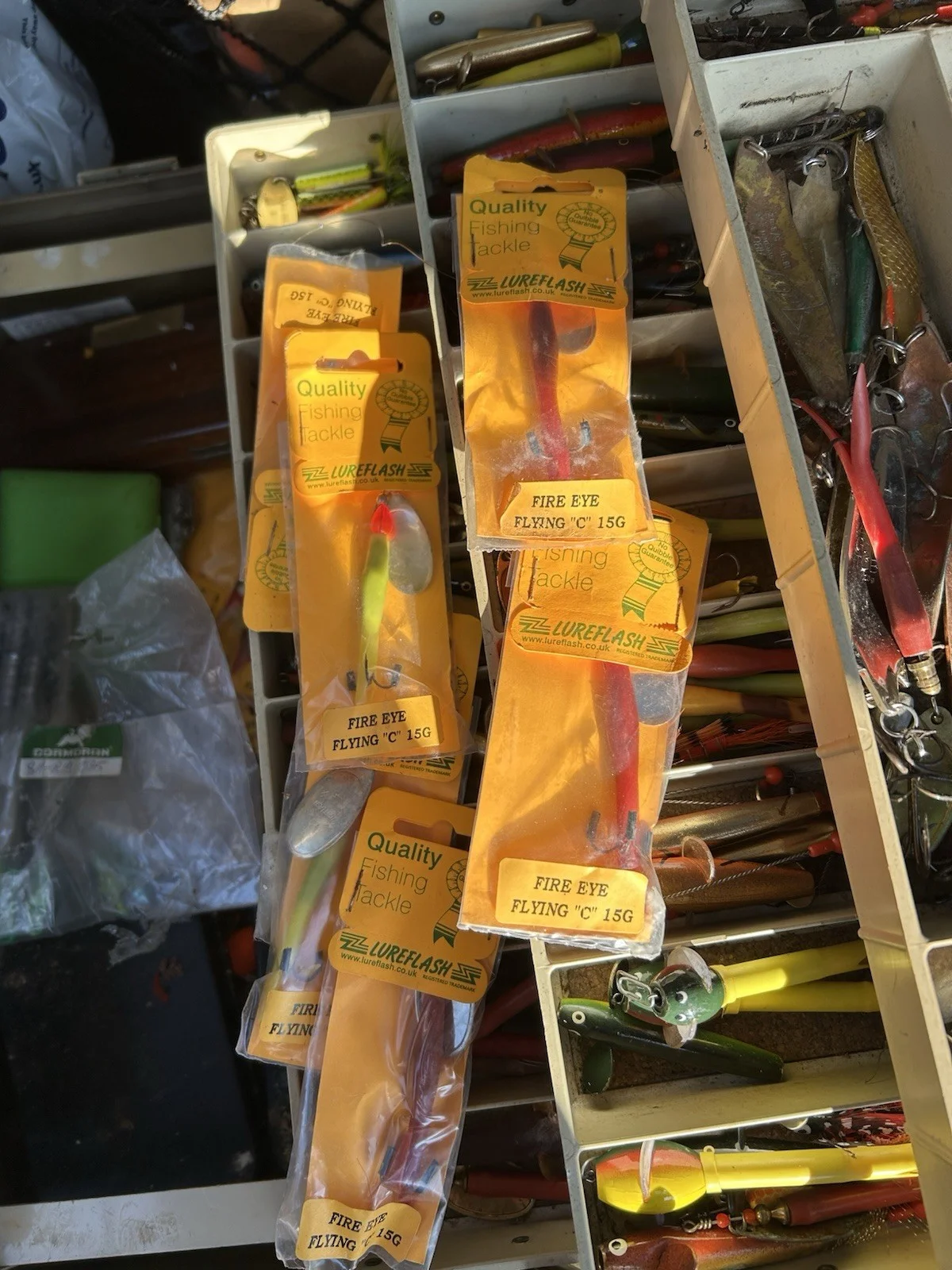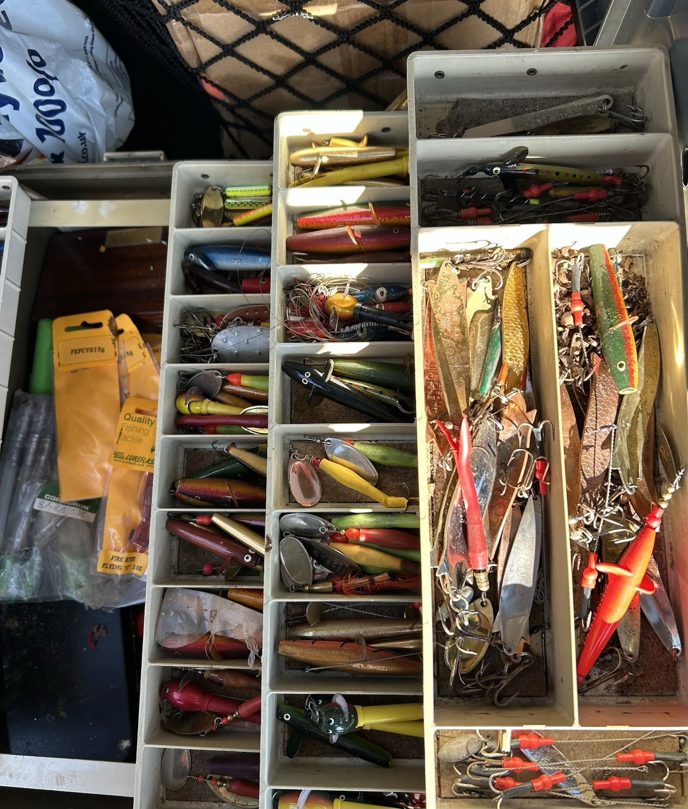 Plano tackle box for. Salmon & pike fishing with vast amount of salmon tube flies, mepps spinners,pike spinners (Abu) salmon flies,trebles spiral leads, traces fly boxes etc
