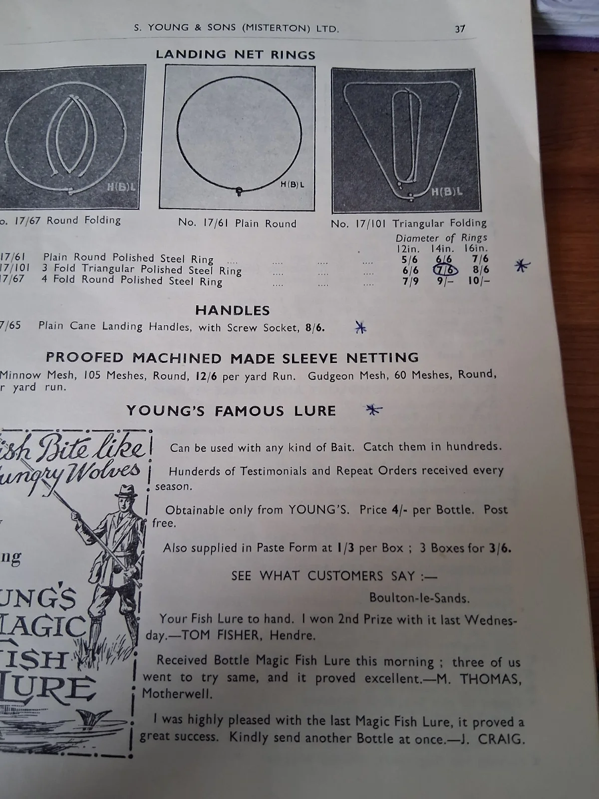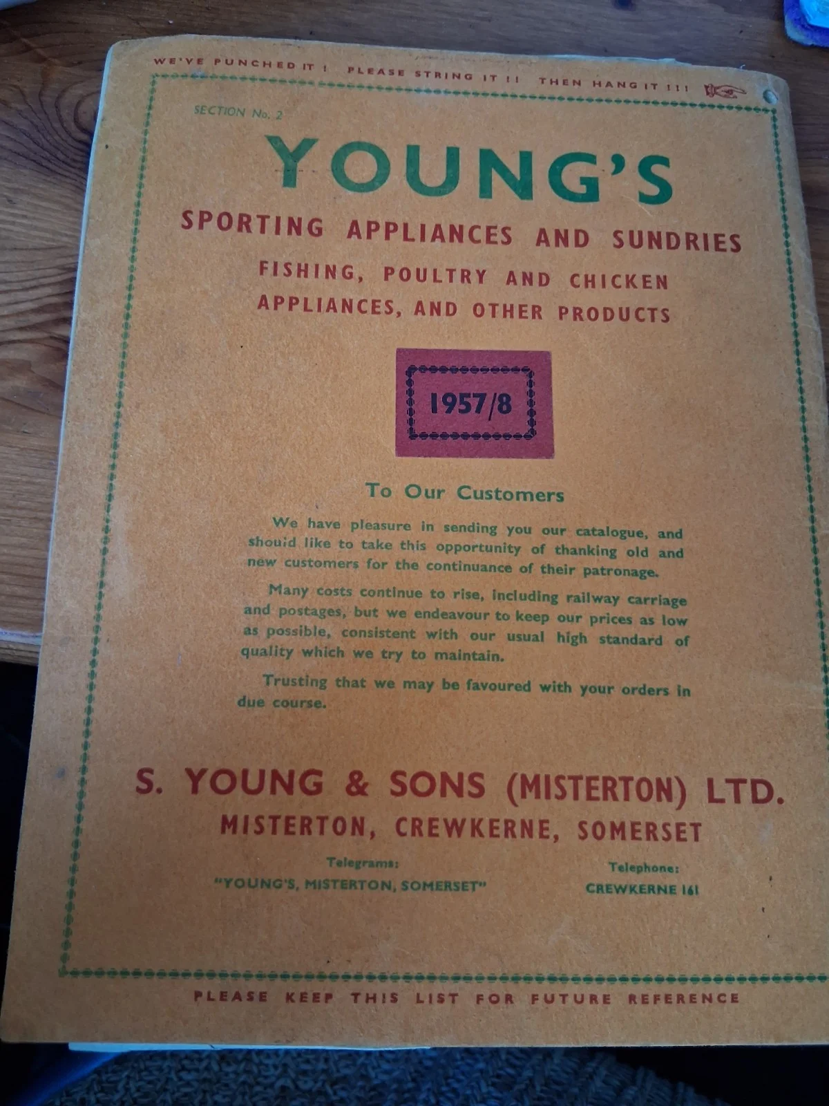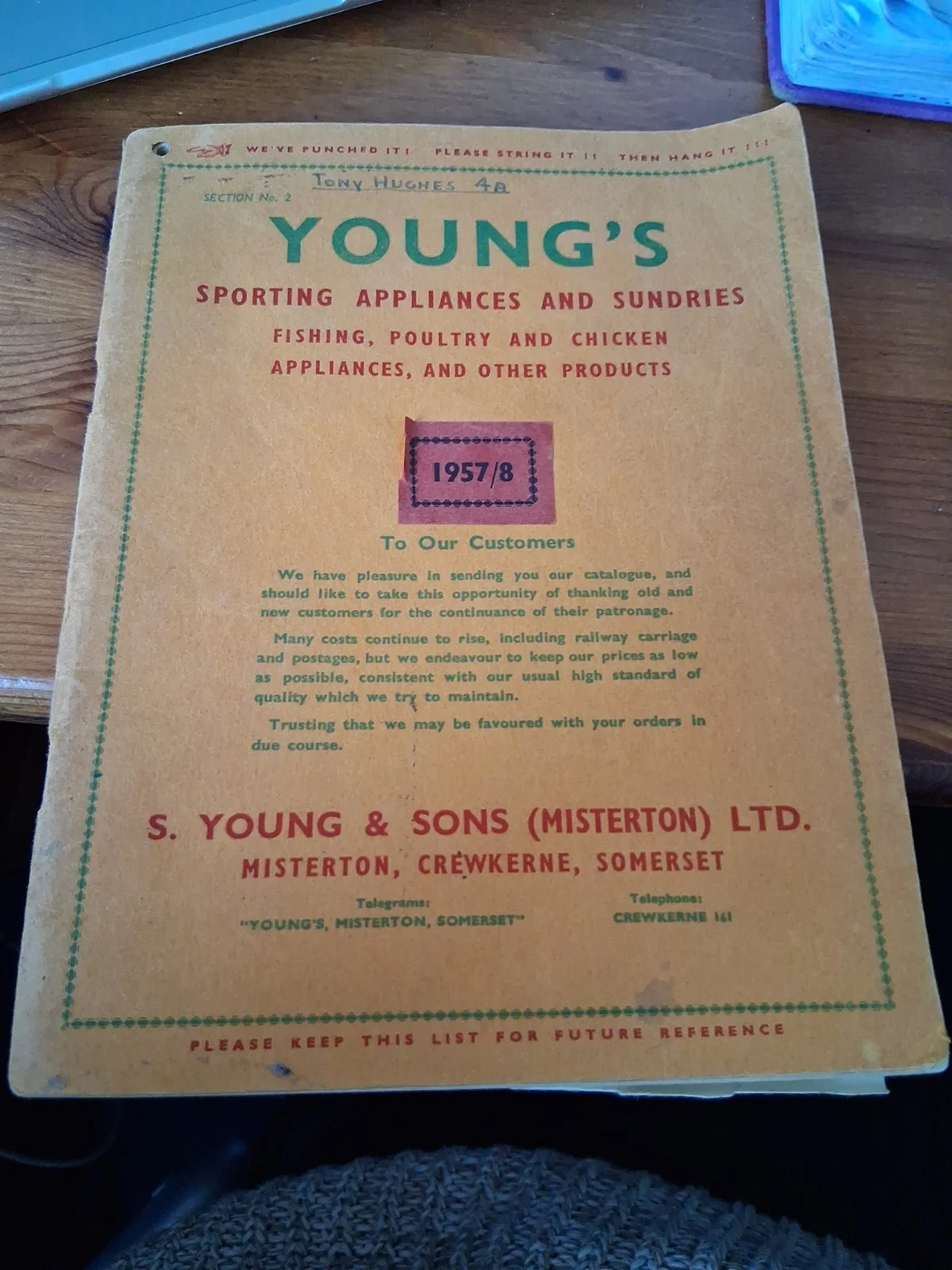 Vintage original 1957/58 catalogue from S. Young & Sons (Misterton) Ltd, Somerset.A lovely piece of mid-century ephemera featuring sporting goods, fishing equipment, poultry and chicken appliances, and other rural products.This is an authentic period catalogue and would make a great addition for collectors of:Vintage fishing memorabiliaAgricultural / farming historyPaper ephemera collectionsRetro advertisingCondition:Used vintage conditionSome signs of age, marks, and light wear as expectedName written on the front cover (see photos) and an asterisc on page 37Pages appear intactOverall a charming and collectible item with great nostalgic appeal.