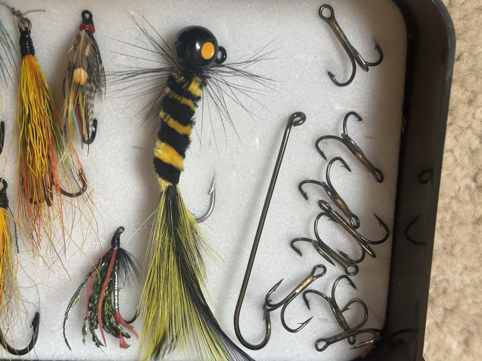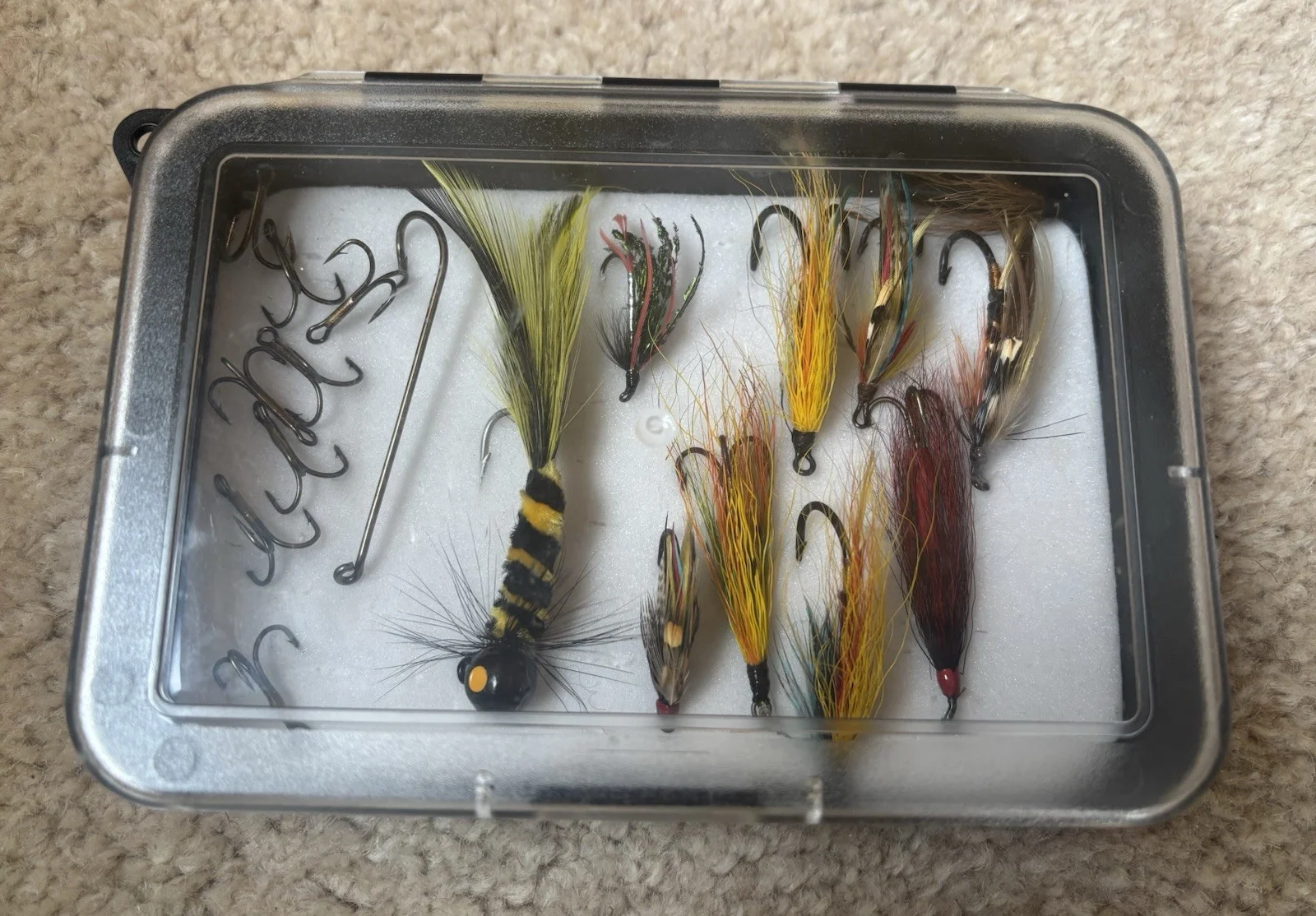 10 beautiful assorted Salmon flies . 5 single hook, 1 tube and 4 double hook. 8 triple hooks and 1 tube hook. All in a plastic sponge lined box 14x10x3 cm. They look new but may have been used.