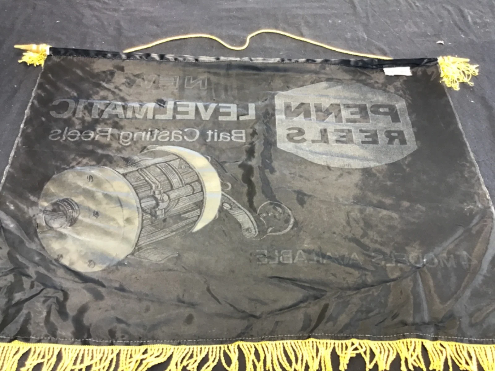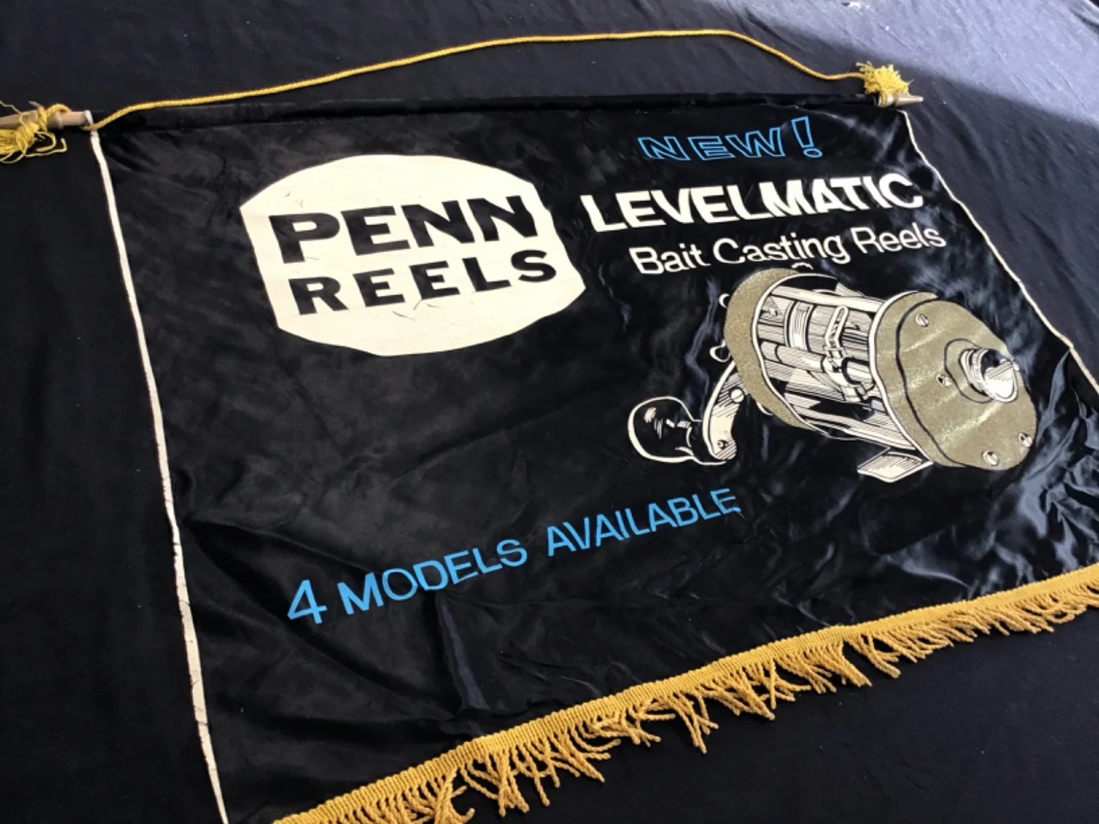A genuine mid-20th century tackle shop point-of-sale display promoting the Penn Levelmatic series. These banners were supplied to fishing tackle dealers when the Levelmatic reels were introduced. Details: • Brand: Penn Reels, made by Hollywood Banners. • Product advertised: Levelmatic Bait Casting Reels • Era: Circa late 1950s – early/mid 1960s • Material: Satin/nylon type fabric with screen-printed graphics • Trim: Gold fringe to lower edge • Mounting: Original cord and wooden end dowels • Text reads: “NEW! Levelmatic Bait Casting Reels – 4 Models Available” The gold reel illustration has a metallic/glitter effect typical of the period and displays very well. Condition Good vintage condition overall. • Colours strong and unfaded • Some creasing from storage • Light age-related marks • Fringe intact with minor wear • Cord and wooden mounts original No major tears or repairs noted. A very displayable piece of classic fishing tackle advertising.Measures 29” x 22”