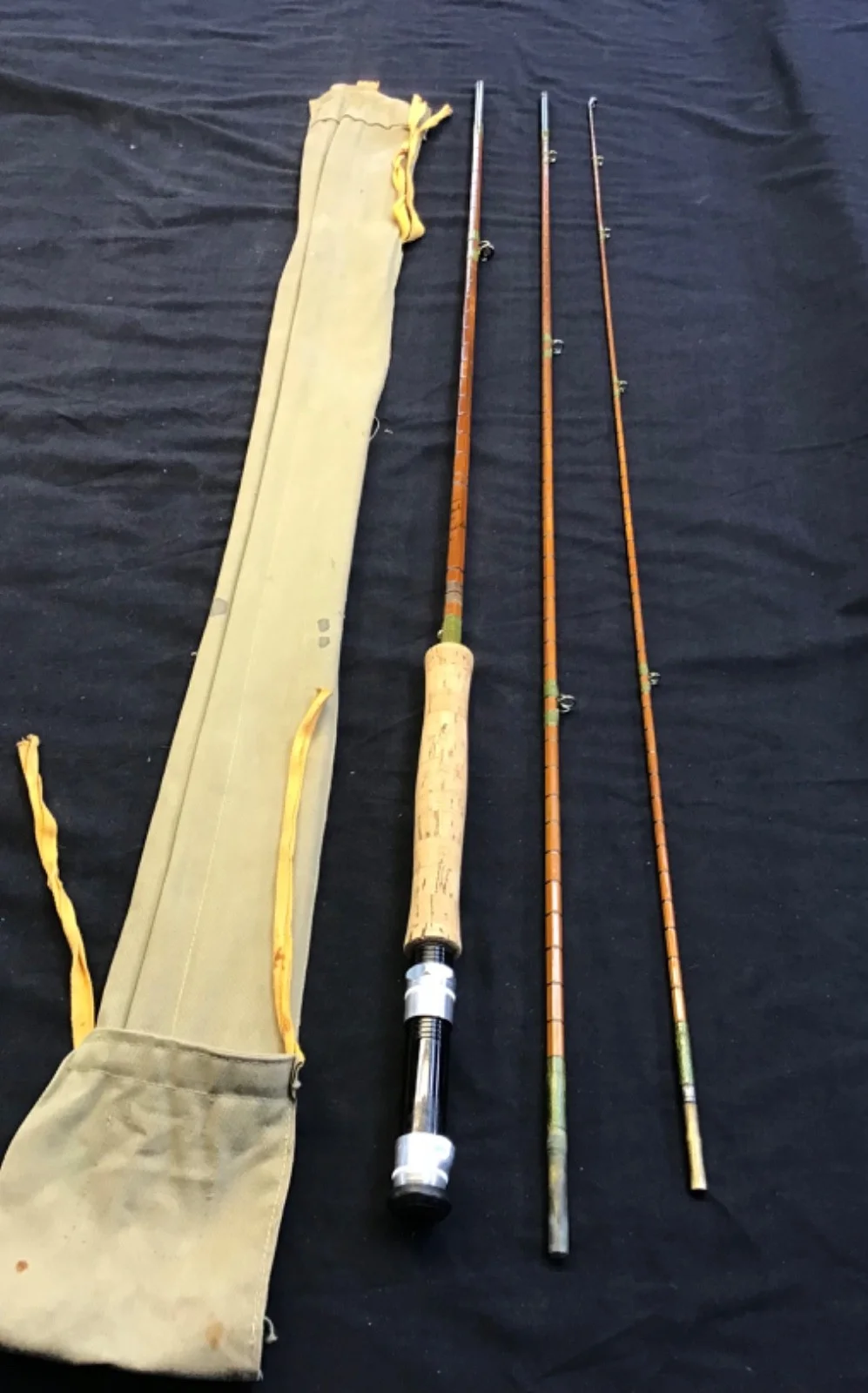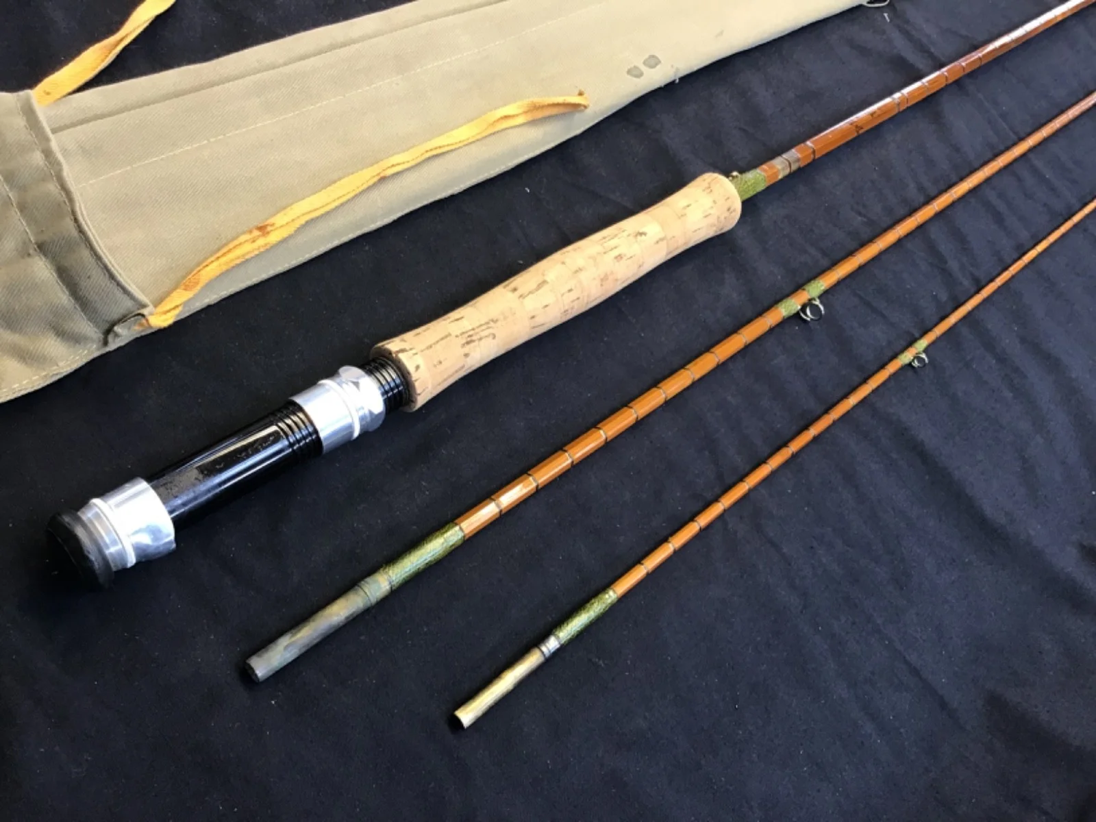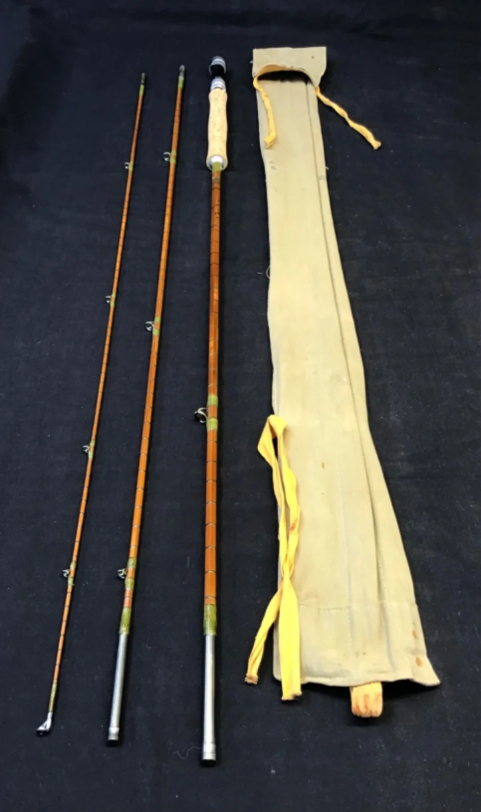 Rare vintage Jas Aspindale “The Testdale De Luxe” 9ft 6” 3 piece split cane Fly Rod in excellent condition. Bronzed brass suction ferrule, tiger whipped eyes, green intermediate whippings, agate lined butt and tip rings, and a cork handle with down locking reel seat. The rod comes with an unbranded 3 pocket khaki cloth bag.Un-assembled length 103cm. (412)