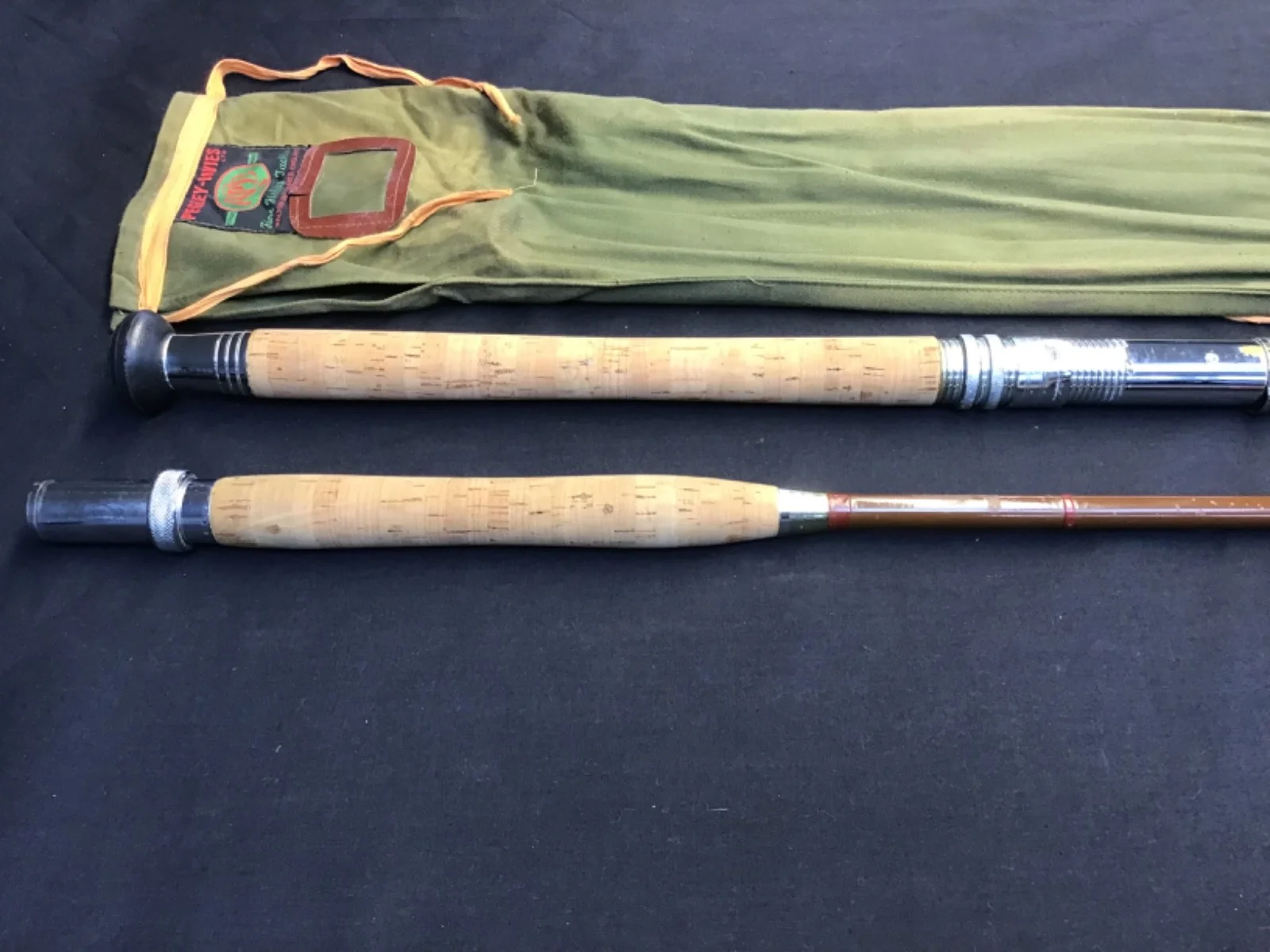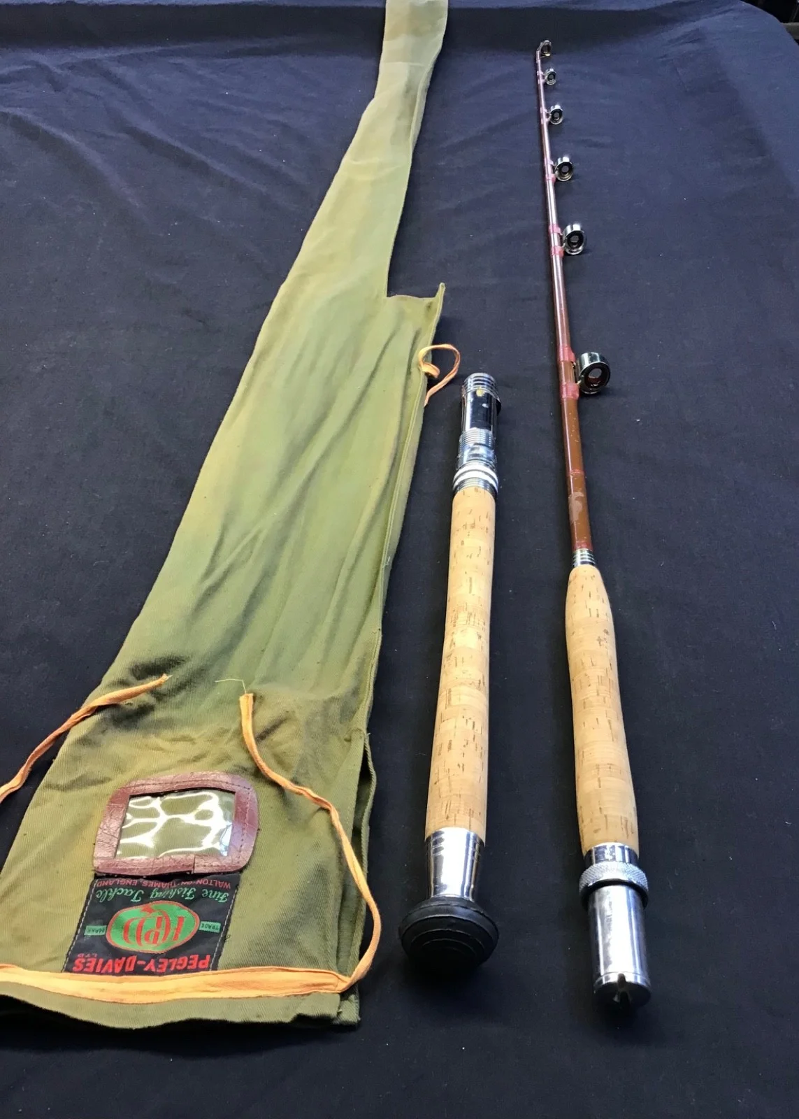 Rare vintage and early Pegley Davies Rod 6ft 6” (with detachable handle) fibreglass Boat Rod in very good condition. Brown blanks, red whipped eyes, red agate “double lined” eyes throughout, and a 29” (when assembled) cork handle with a twin lock ring chrome plated up-locking reel seat. This rod comes in its original Pegley Davies purpose made twin pocket khaki cloth bag. 371