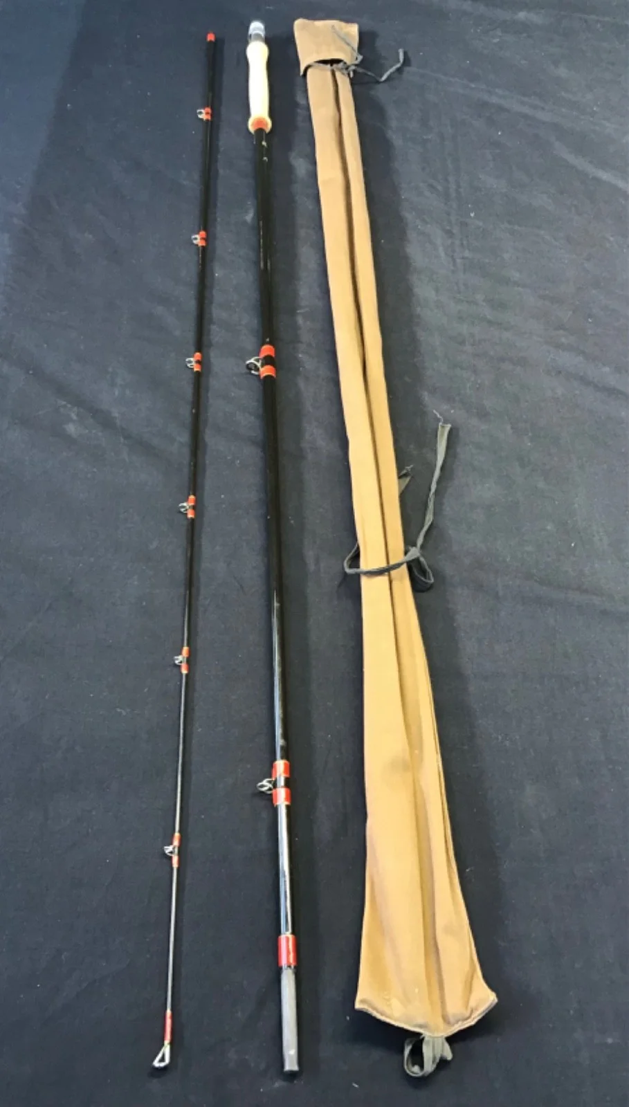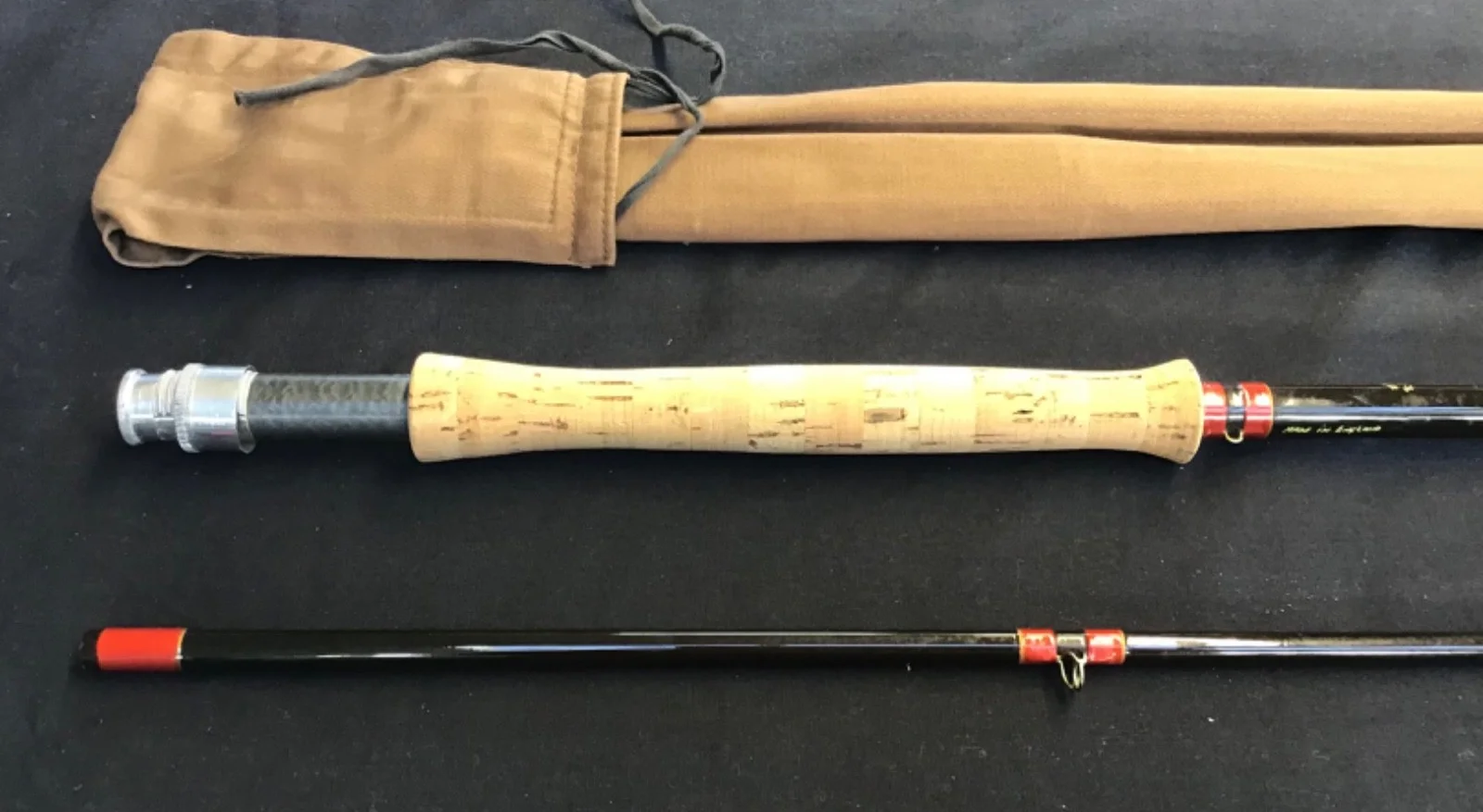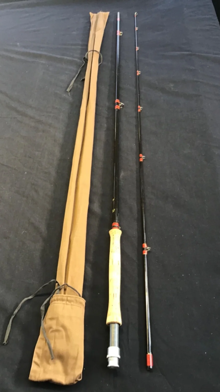 Vintage Fosters of Ashbourne “The Glasslyn” 9ft 3” #7, 2 piece fibreglass Fly Rod in very good condition. Black blanks, golden tipped red eye whipping, agate lined butt and tip ring, and a cork handle with alloy up-locking reel seat. This original rod comes in a quality twin pocket brown cloth bag. Un-assembled length 144cm321