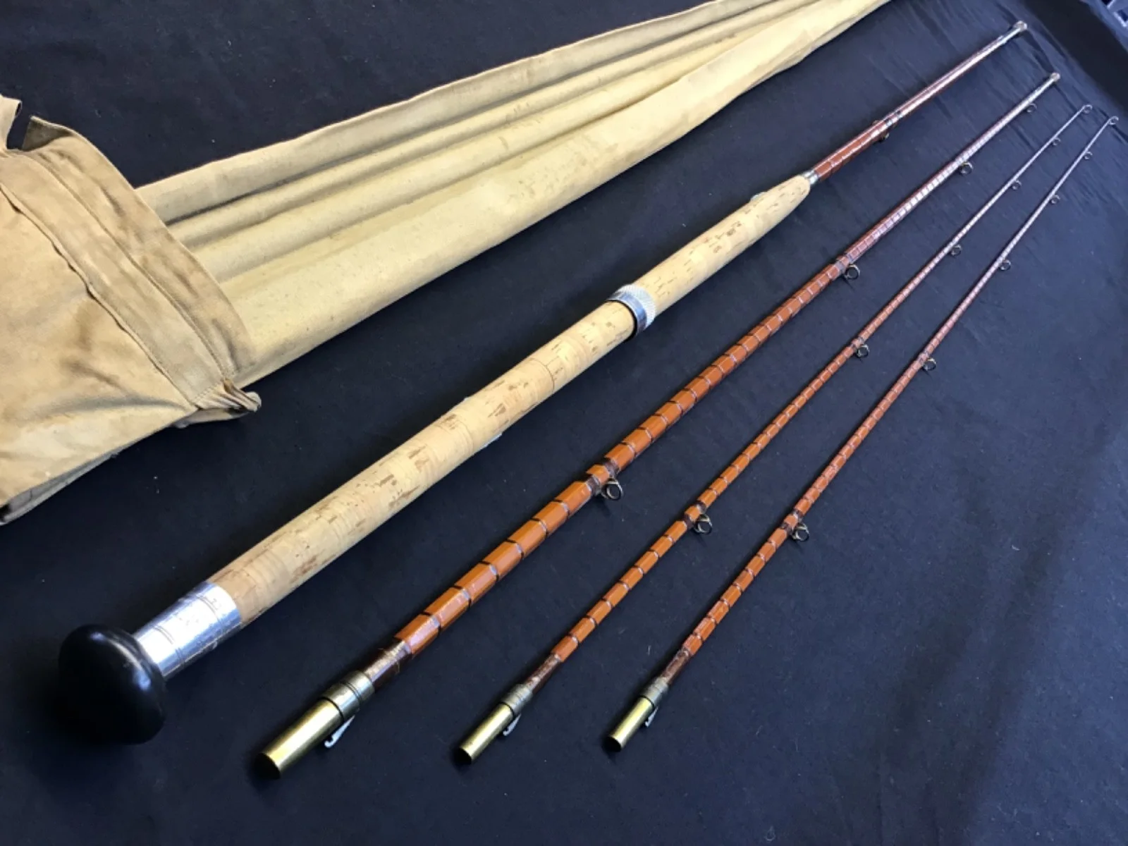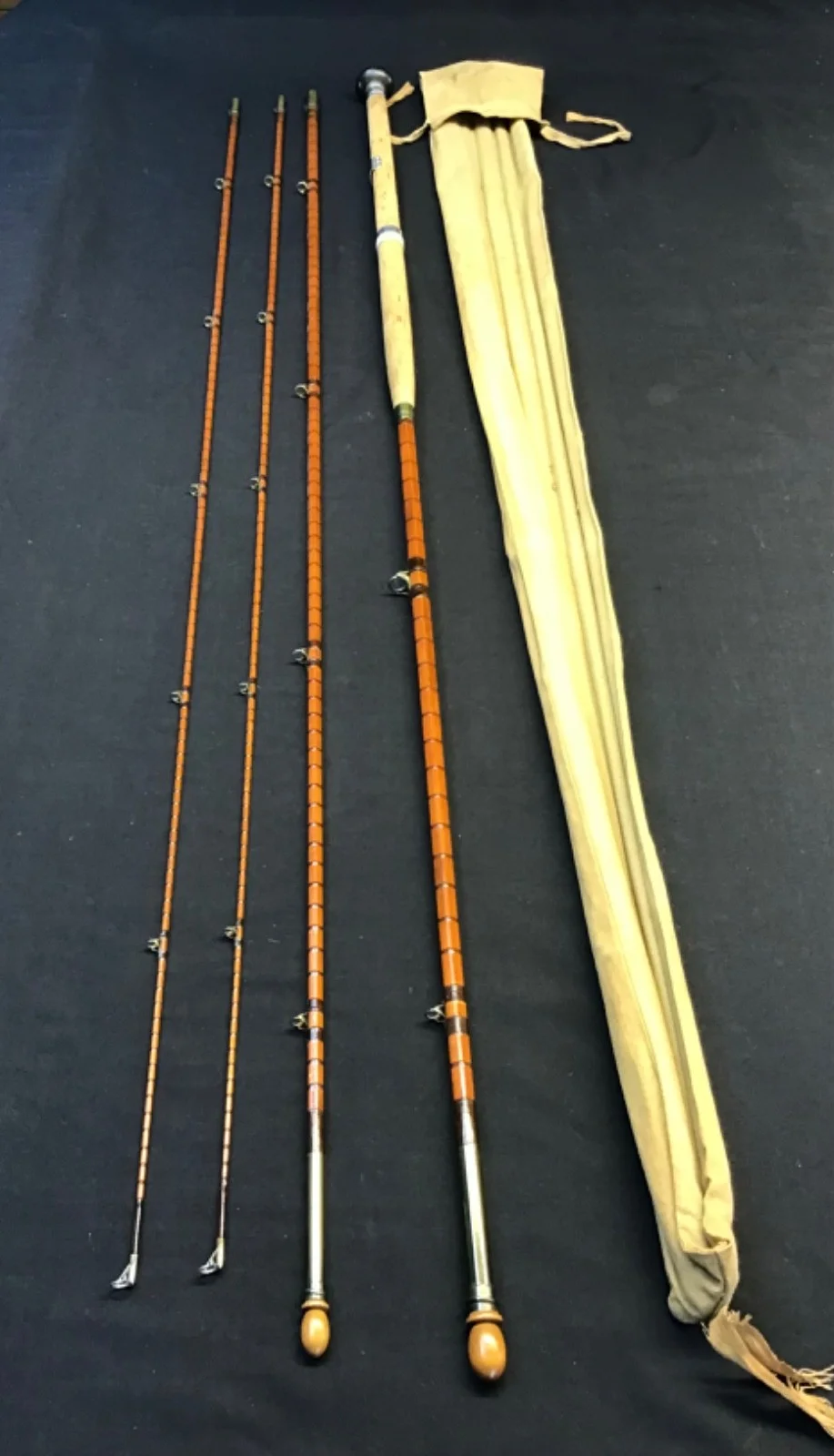 Rare vintage J J S Walker “Salmon Rod” 13ft 3 piece (plus spare tip) split cane Fly Rod in excellent condition. Lock fast ferrules, burgundy eye and intermediate whippings, and cork handle with single alloy slip ring reel seat. This very original twin tip rod, built in Alnwick and stamped 17738 (1947) comes complete with turned hardwood stoppers and its 4 pocket cloth bagUn - assembled length 140cm. 540