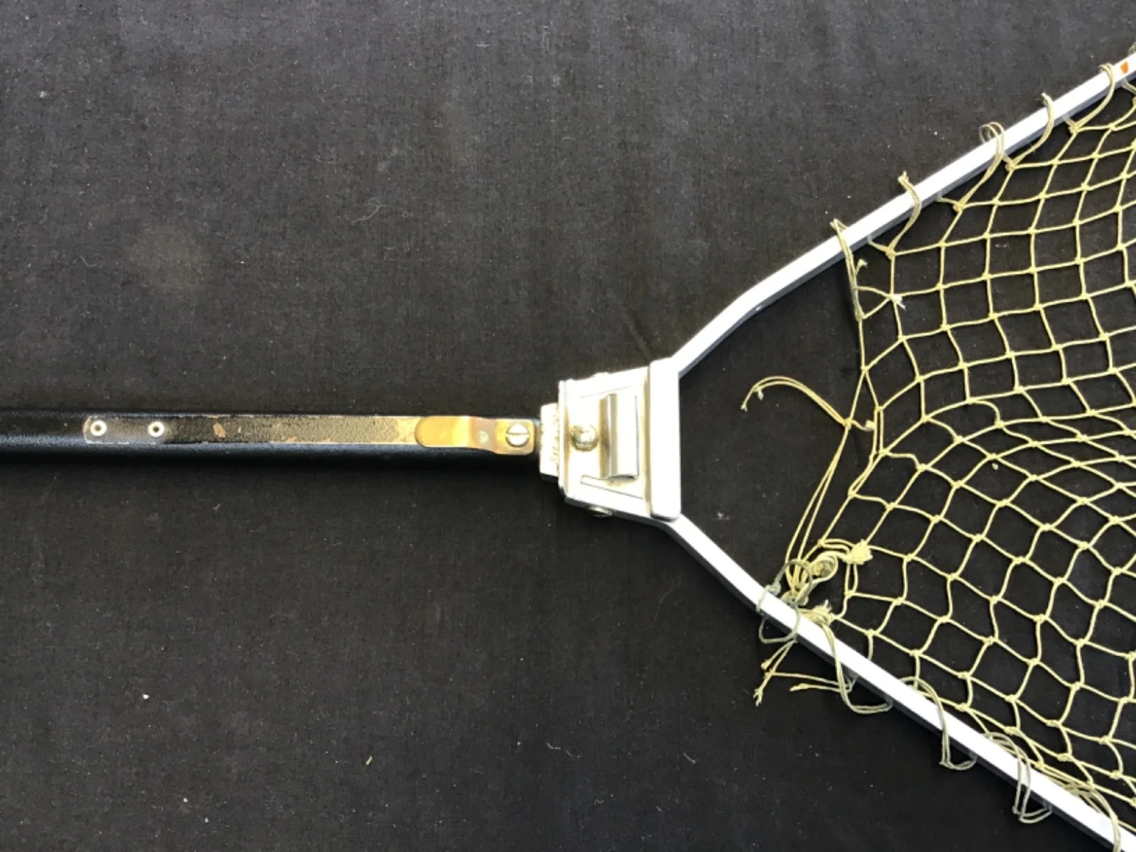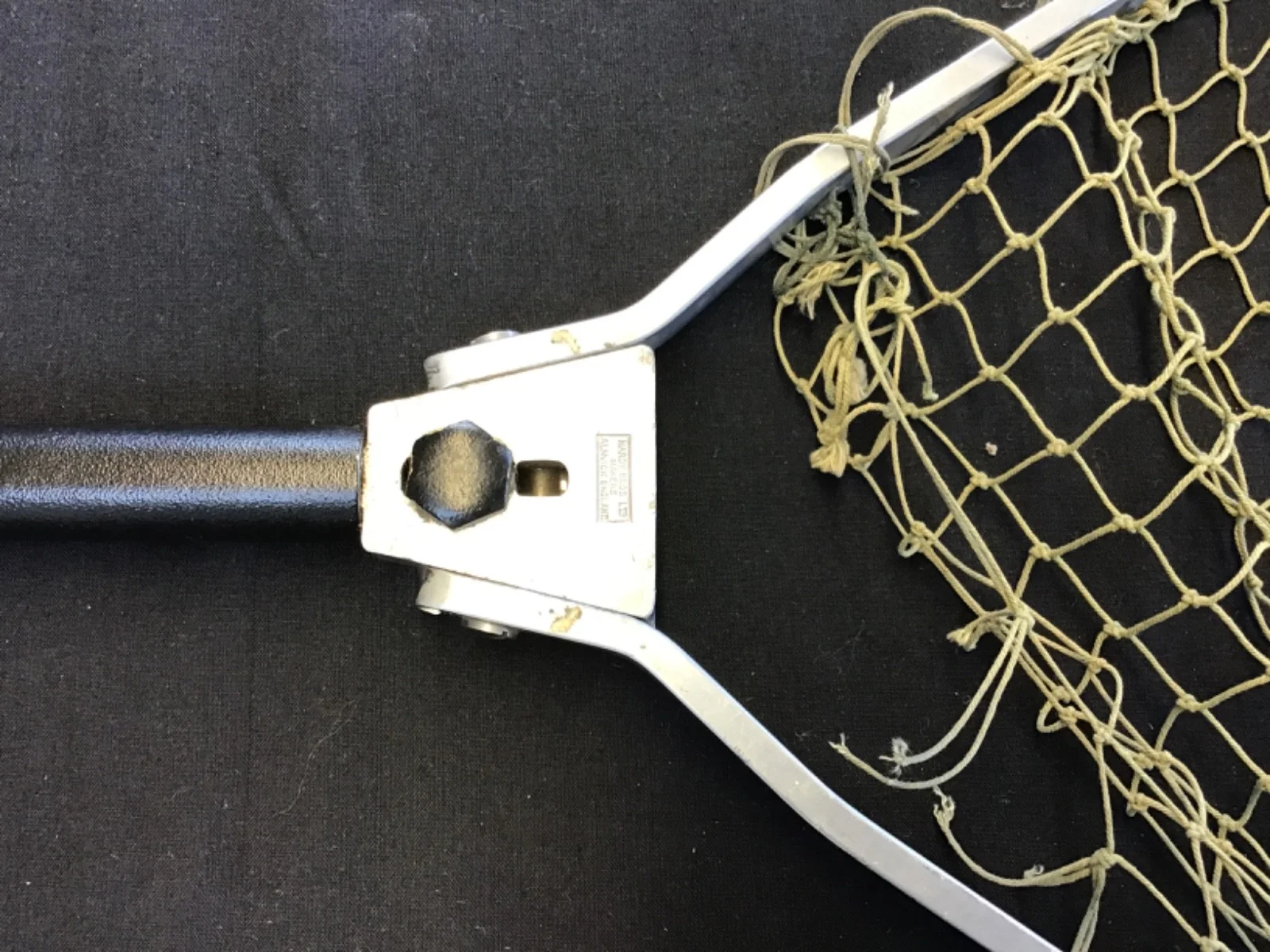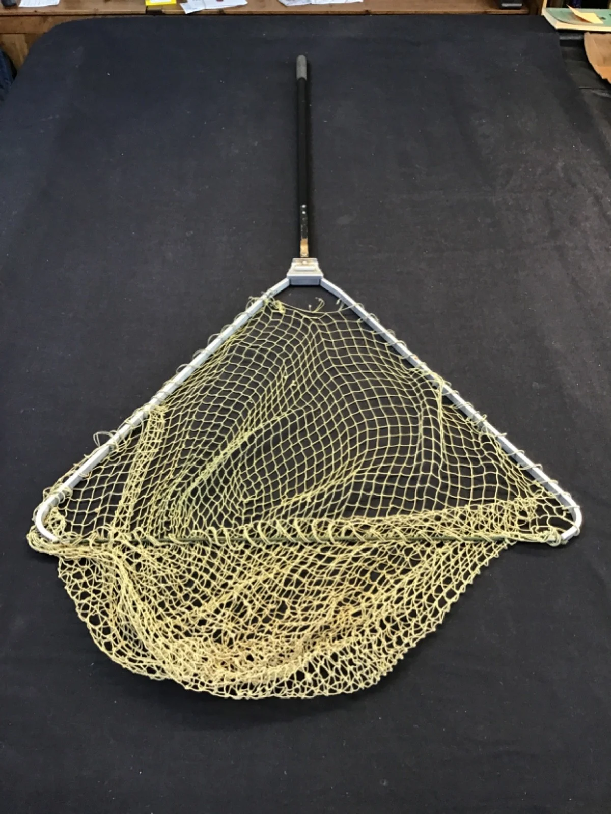 Vintage Hardy Bros folding landing net made by Hardy Bros Ltd, Alnwick England. Circa 1975 - 1990 Classic Hardy aluminium triangular frame landing net with folding mechanism and original knotted cord mesh. The hinge block is clearly stamped “Hardy Bros Ltd – Alnwick Makers – England”. A practical and collectible Hardy fishing accessory suitable for trout or salmon fishing. Good used condition with light signs of age and use. The folding mechanism works correctly and the frame is straight. The original netting is intact with some age-related wear. Measures 51” long (32” collapsed) 25” wide and 30” metal handle. • Aluminium folding triangular frame • Hardy stamped hinge block • Original cord mesh net • Rubber handle grip • Folds for easy transport A nice vintage Hardy landing net. Note although complete the net requires reattaching to the frame at the handle end.
