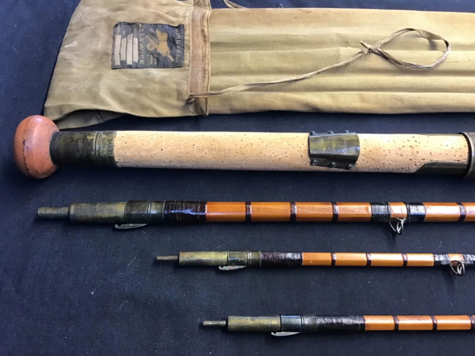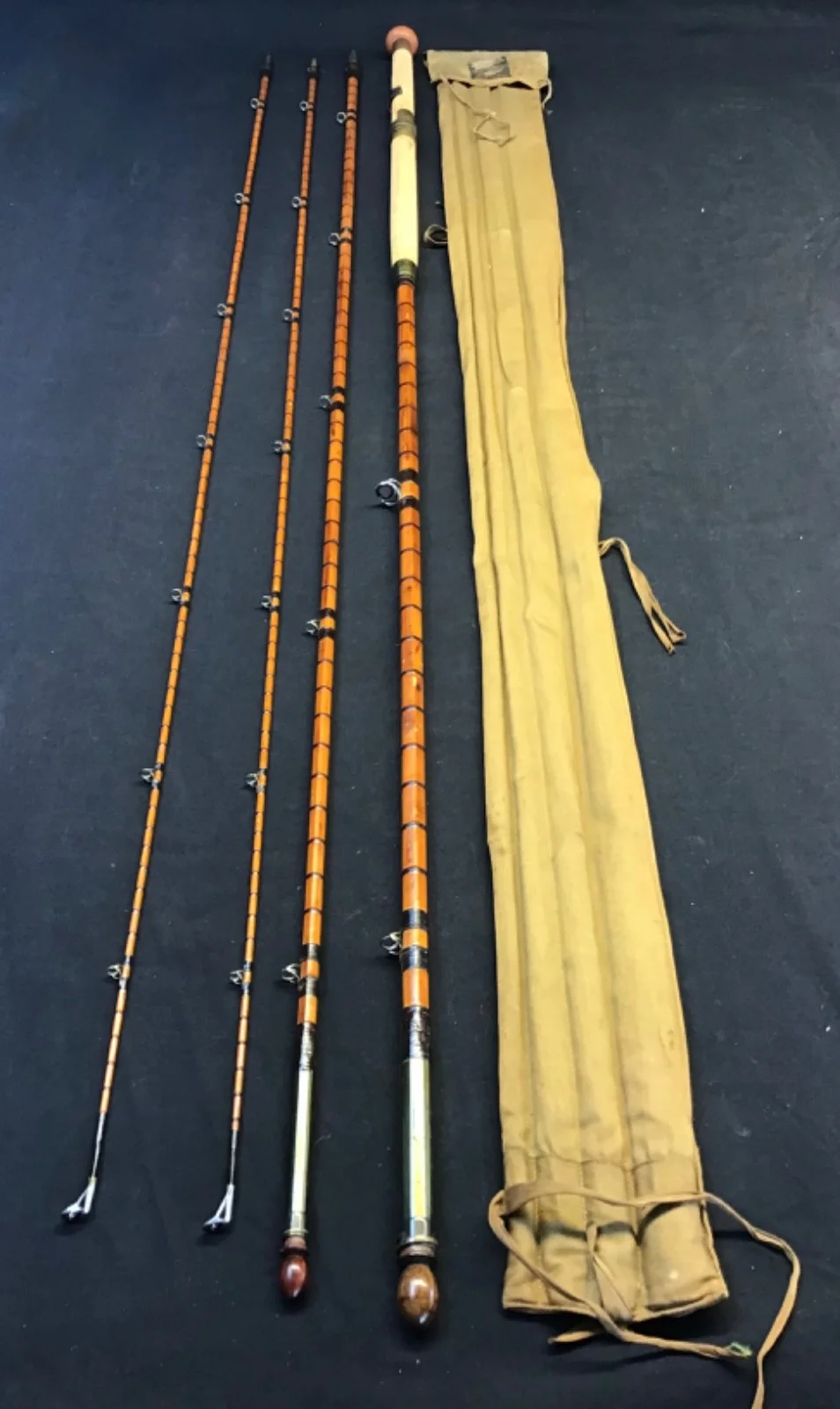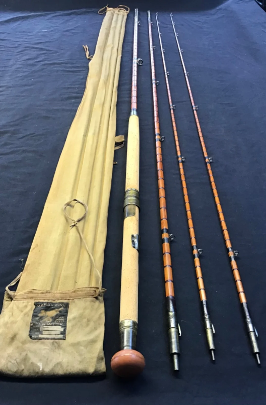 Rare vintage and early Hardy “The Gold Medal” 15ft 3 piece (plus spare tip) Salmon Fly Rod in very good condition. Lockfast joints, burgundy eye and intermediate whippings, lined butt and tip rings, and a 26” cork handle with single bronze sliding ring reel seat. This 125 year old twin tip rod marked 49014 (1899) comes complete with turned hardwood stoppers and Hardy “rod and hand” 4 pocket khaki cloth. Note, butt ring may not be original.510
