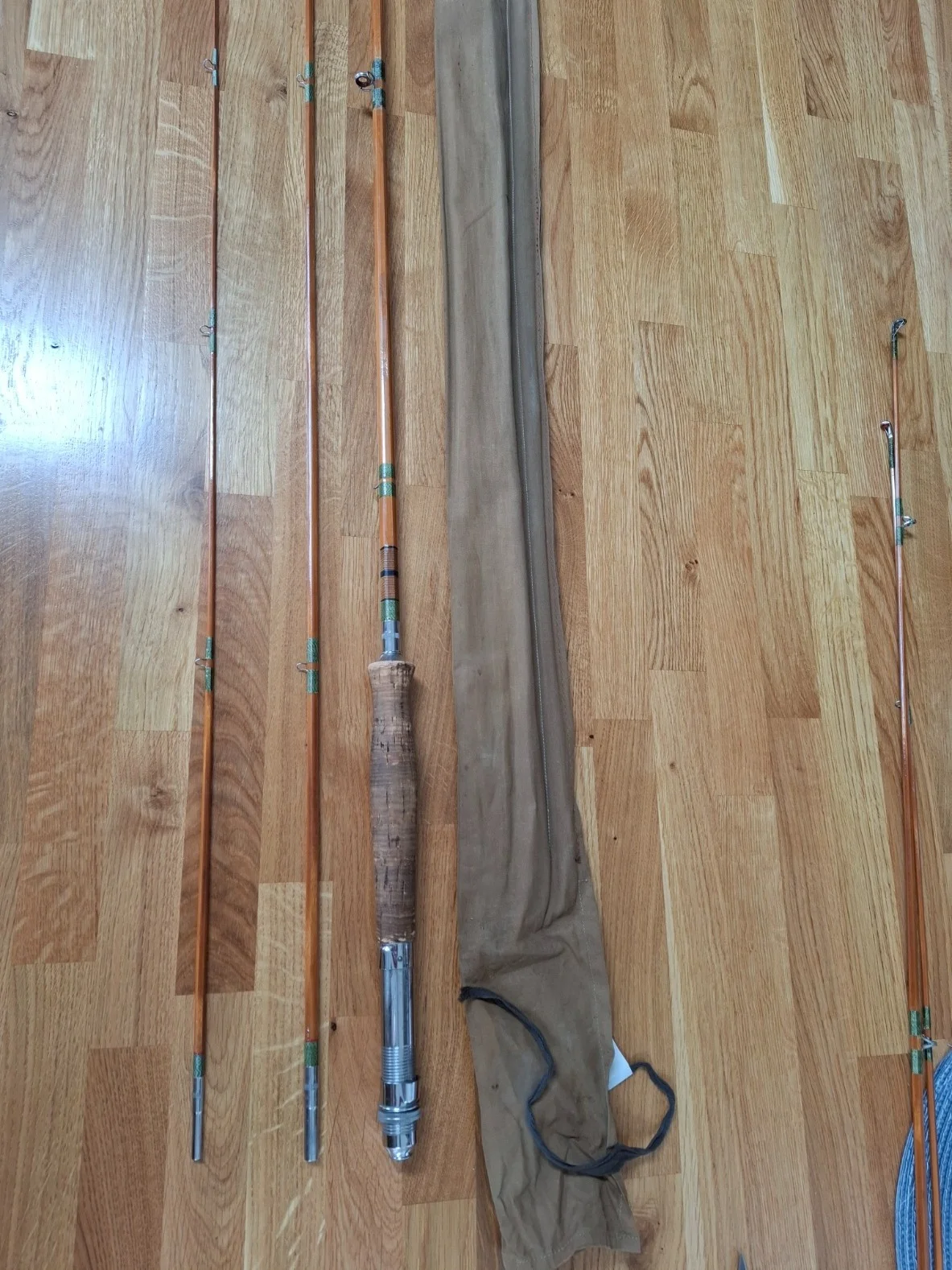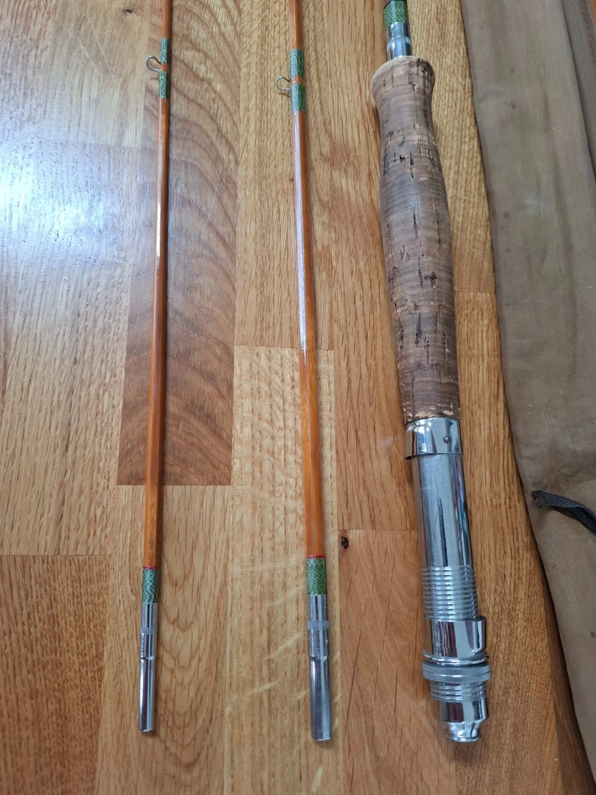 Dual function split cane fishing rod. Handle section is reversible so you can have a fly rod or spinning rod.Multiple tip sections for different weight and use.Complete with bag
