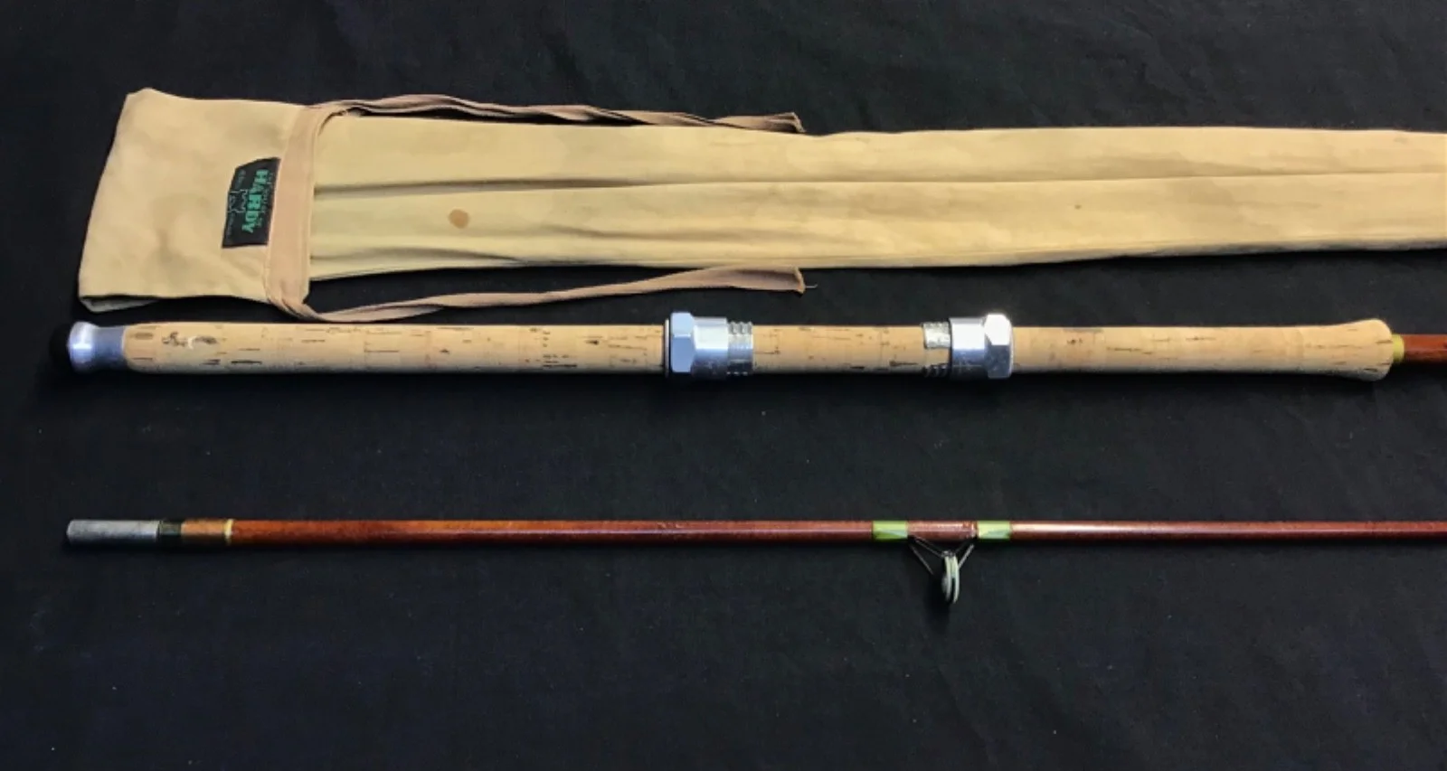 Rare vintage Hardy “The Glaskona County” 8ft 6” 2 piece fibreglass Spinning Rod in very good condition. Natural blanks, copper whipped suction ferrule, green whipped fuji eyes throughout and a 22” cork handle with twin adjustable alloy lock ring reel fittings. This original rod (transition from traditional split cane to fibreglass) is marked Trevaldwyn The Rectory Meeth Oakhampton and comes in a Hardy twin pocket cloth bag. Note there is some damage to one of the reel fittings but doesn’t affect its operation, please study photos.Un - assembled length 135mm (471)