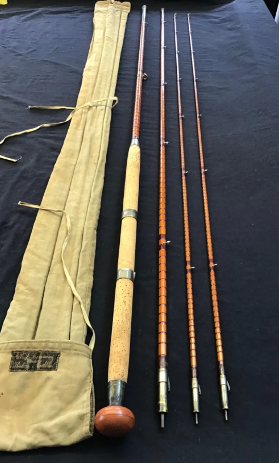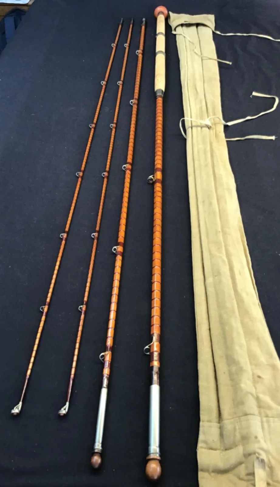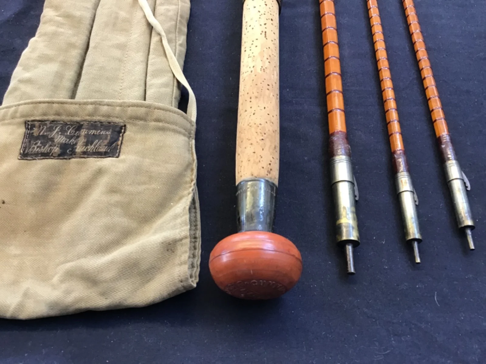 Rare vintage W J Cummins of Bishop Auckland” Anglo American” 15ft 3 piece (plus spare tip) split cane Fly Rod in excellent condition. Lock fast ferrules, burgundy eye and intermediate whippings, red agate lined butt and tip rings, and a 25” cork handle with bronzed brass single slip ring reel seat. This rare twin tip rod comes complete with matching turned hardwood stoppers, original rubber butt cap and W J Cummins 4 pocket khaki cloth bag.Un - assembled length 165cm. 595