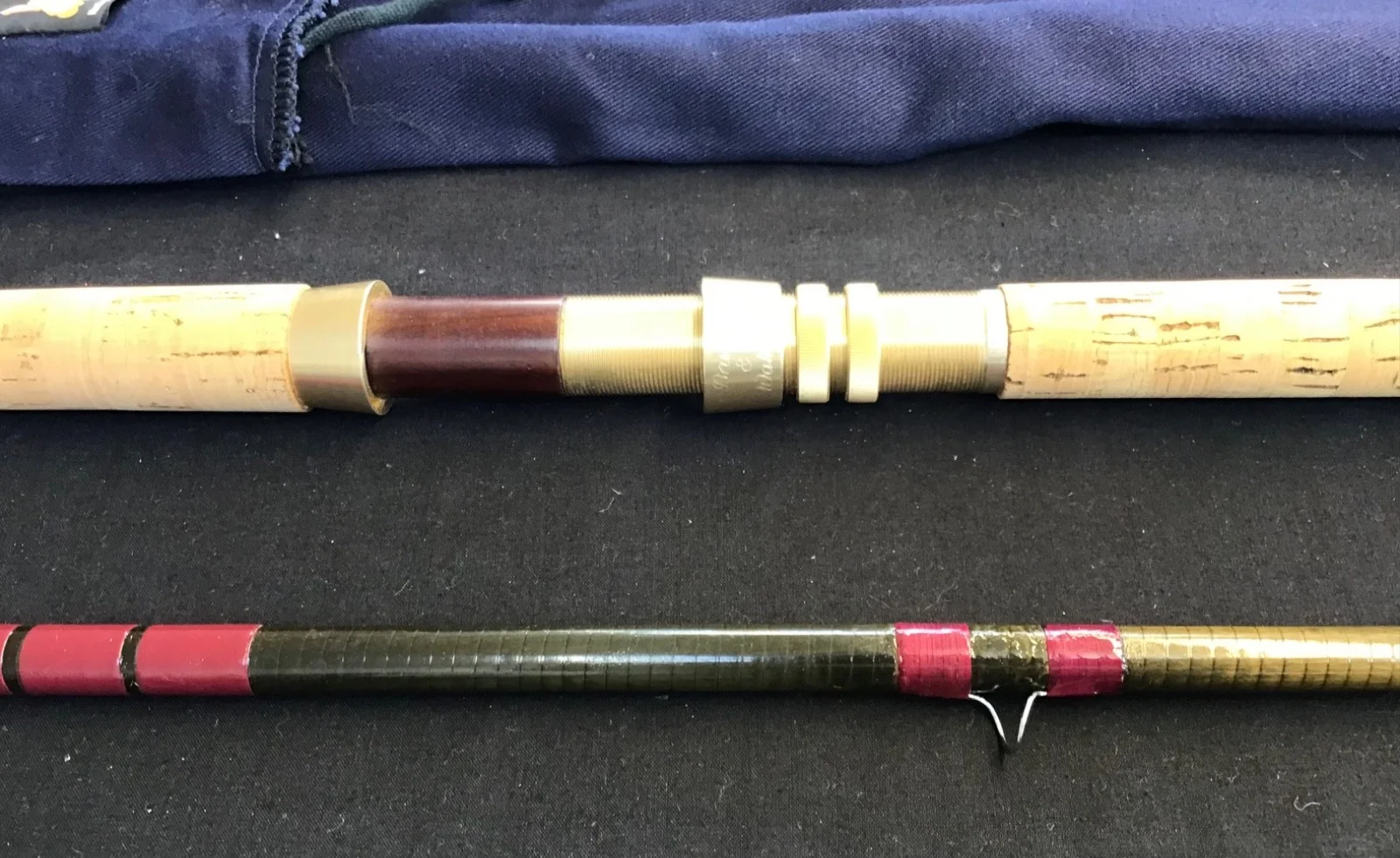 Vintage Bruce and Walker “Expert Carbon” 15ft #9/10, 3 piece carbon fibre Fly Rod in excellent original condition. Dark olive blanks, cerise red snake eye whipping, 2 lined rings and a 24” double handed cork handle with gold anodised down locking reel seat. This very original rod comes in its Bruce and Walker 3 pocket blue cloth bag.Un -assembled length 163cm. 596