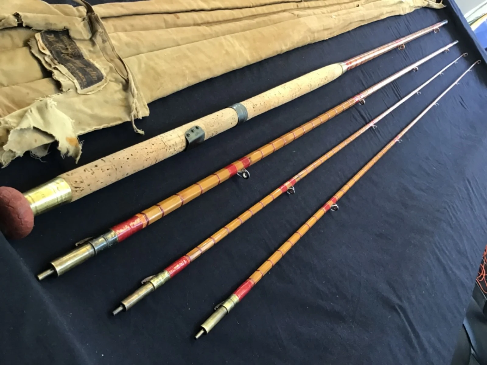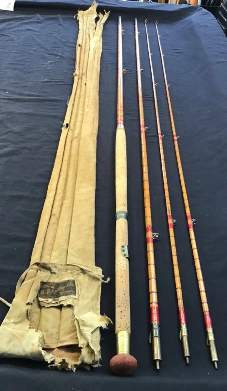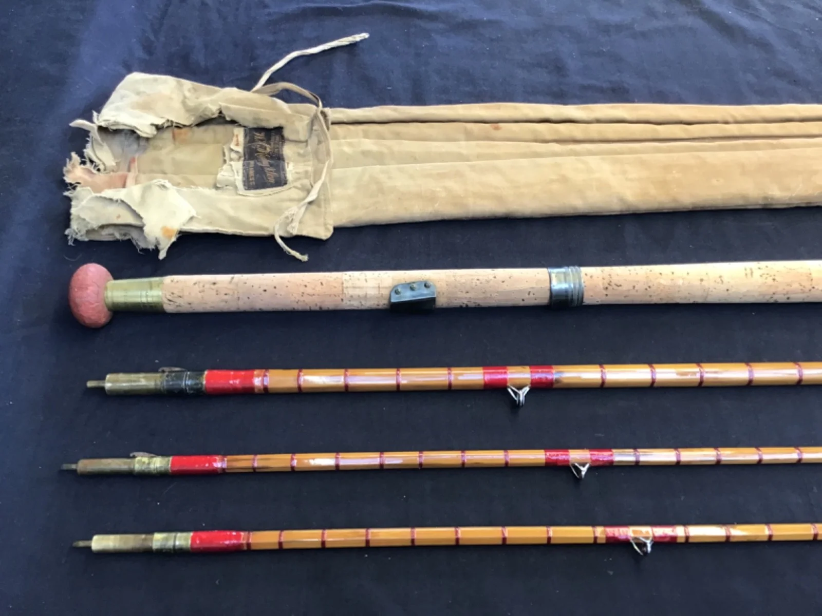 Rare vintage and early W A Macleay and Son Salmon Rod” 16ft 3 piece (plus spare tip) steel centred split cane Fly Rod in very good condition. Bronzed brass lock fast ferrules, red eye and intermediate whippings, lined rings throughout on butt and centre sections, snake eyes on tip sections and a 27” cork handle with single brass slip ring reel seat. The twin tip rod comes in its original, very tatty, W A Macleay 4 pocket khaki cloth bag. Note, the replacement eye on the centre section is not the correct type. Please study the photos.Un - assembled length 171cm. 531