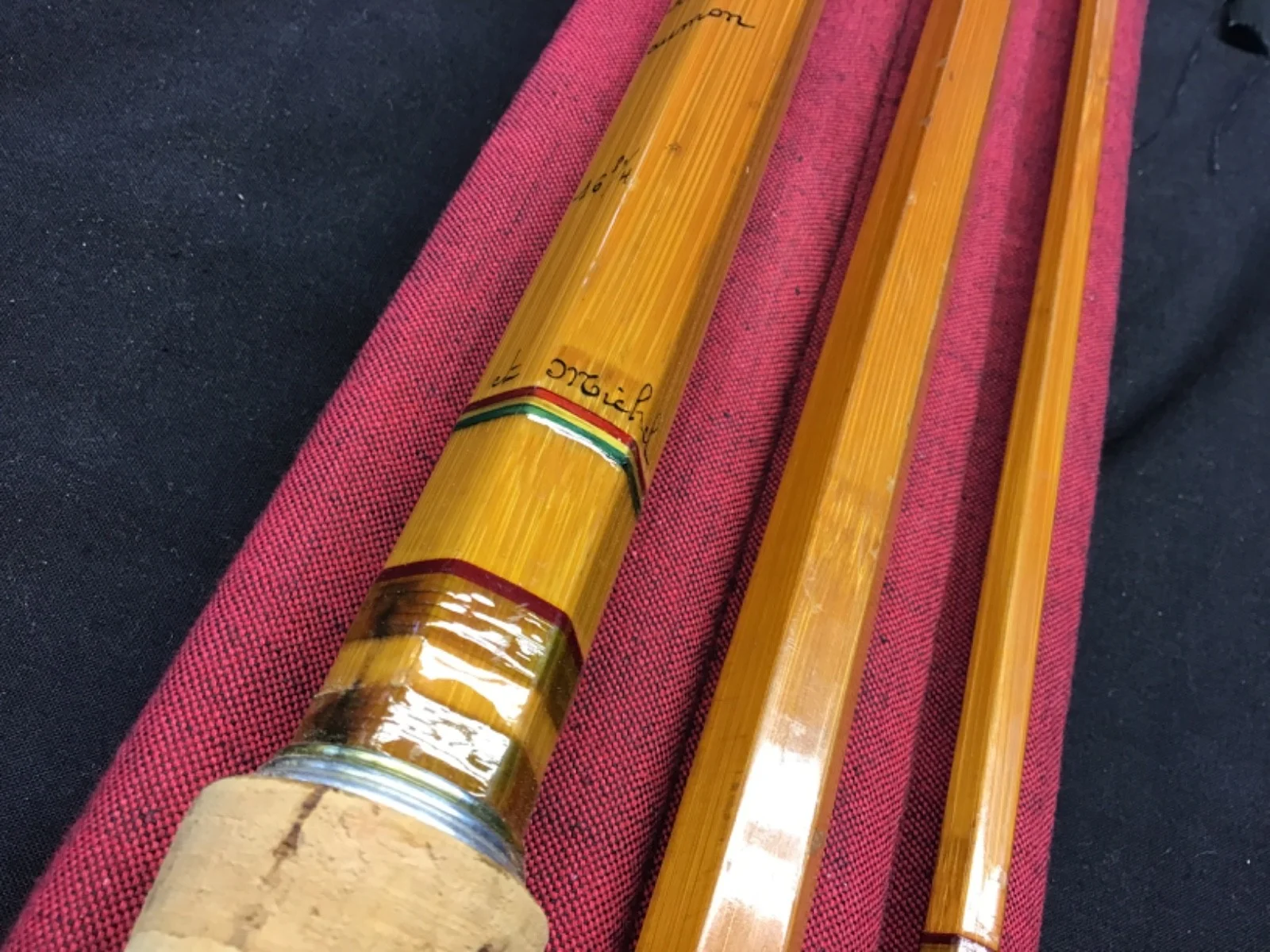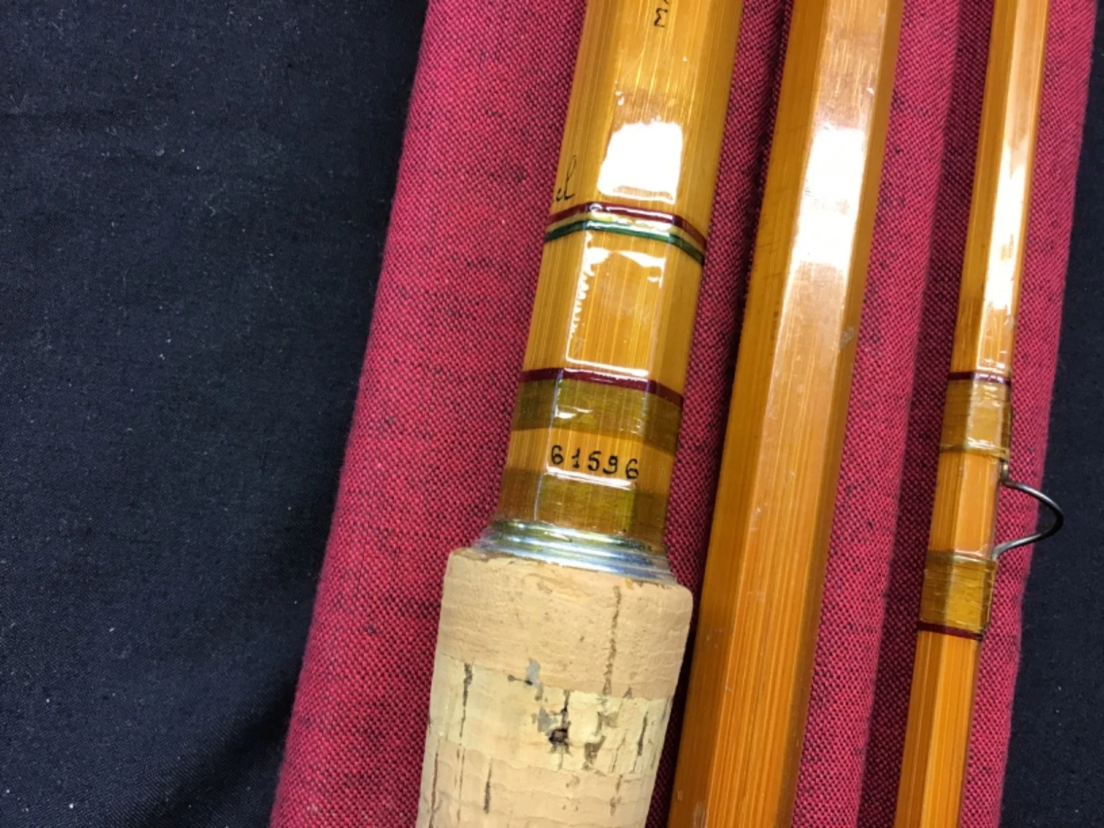 Rare vintage and early Pezon et Michel “Parabolic Saumon” 16ft 9” 3 piece split cane Salmon Fly Rod in excellent condition. Whipped suction ferrules, red tipped yellow snake eye whippings, red agate lined butt ring and a 34” cork handle with twin alloy sliding ring reel fittings. This rod, marked 61596 (1961) is original apart from two eyes that have been professionally re whipped, please study the photos. The rod comes in an unbranded 3 pocket red cloth bag.Un - assembled length 174cm. 519