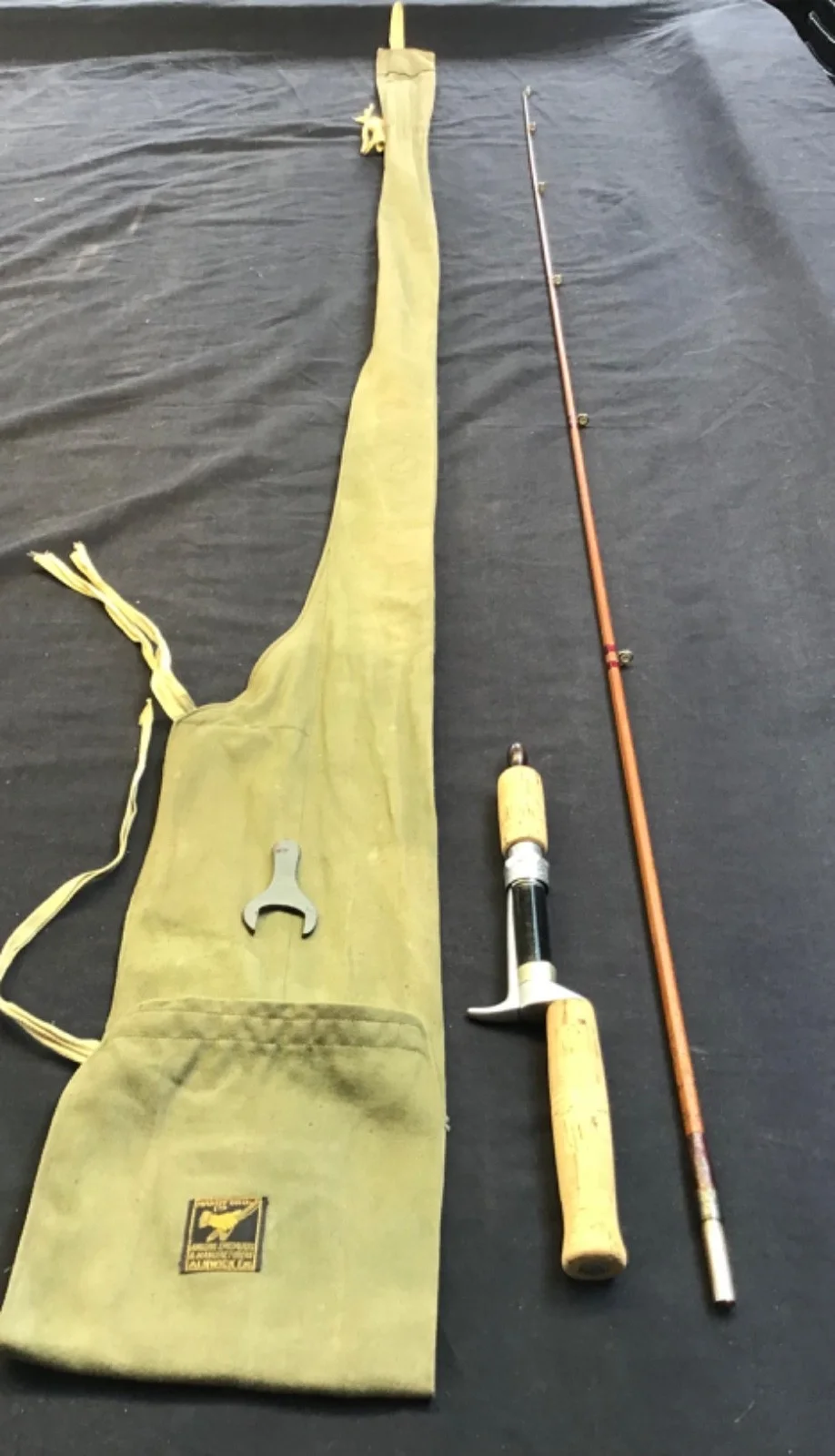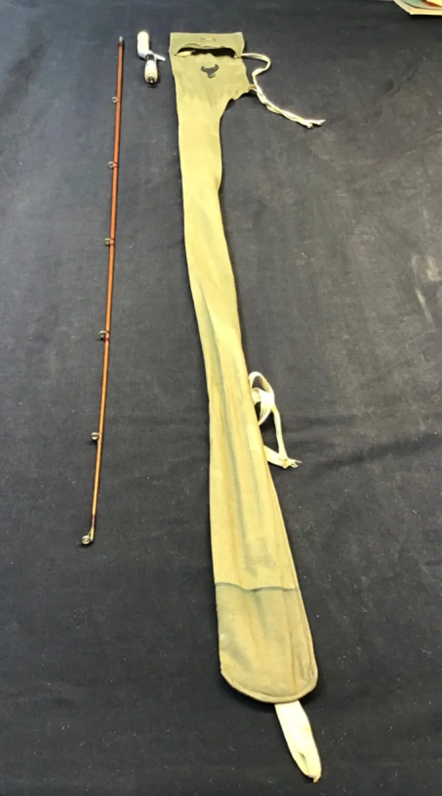 Rare vintage and early Hardy (Hardy-Jock Scott) 5ft 6” split cane Spinning9 Rod with detachable handle in good condition. White metal ferrule, burgundy whipped eyes, lined eyes throughout and a detachable cork handle with alloy “Screw-Grip” and housing. This rod stamped E 89349 (1953) comes complete with spanner, turned hardwood stopper and its original Hardy “rod and hand” purpose made bag. Note, there is some aging to the lacquer surface. The Hardy catalogue is for reference only and not included in this sale.Un - assembled length 145cm. 520
