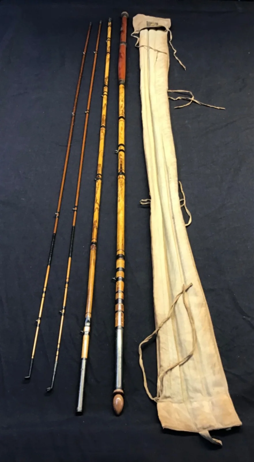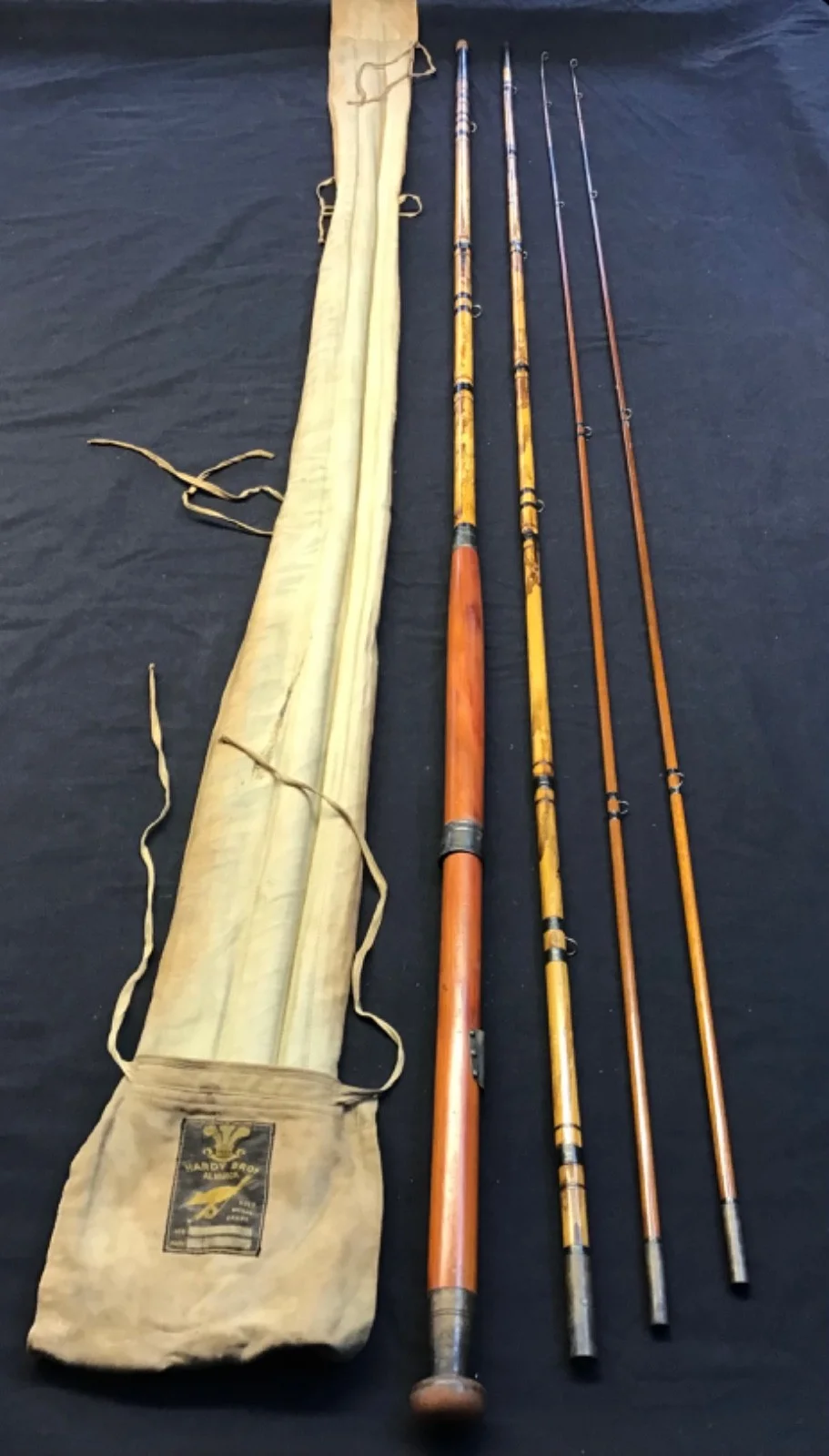 Rare vintage and early Hardy “Gold Medal” 16ft 3 piece (plus spare tip) Fly Rod in very good condition with bamboo butt and centre section and greenheart twin tips. Bronzed brass suction ferrules, black whipped snake eyes and a 25” wooden handle with single bronze sliding ring reel seat. This 120 year old twin tip rod marked A13637 (1906) comes in its Hardy “rod and hand” 4 pocket khaki cloth.501