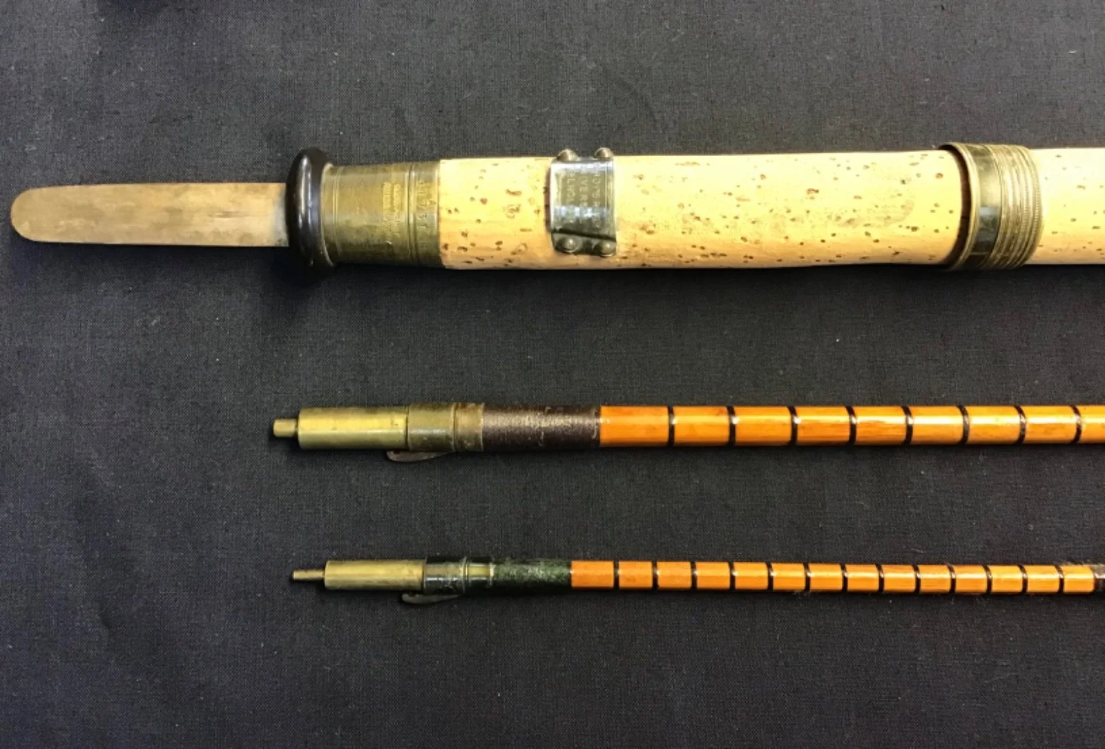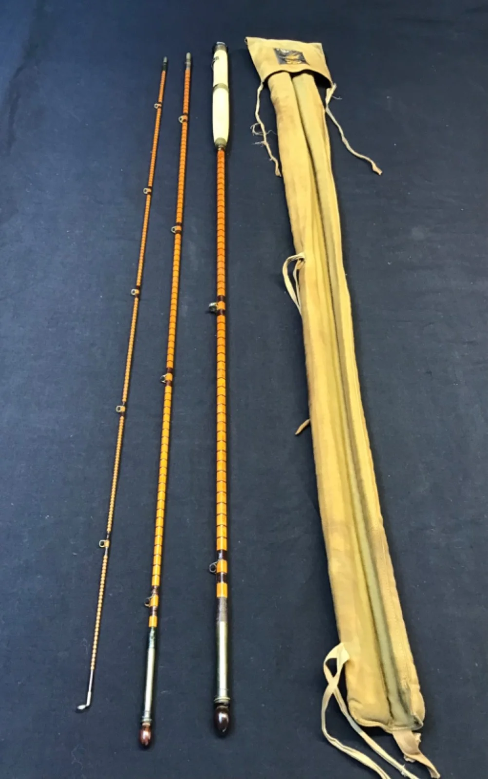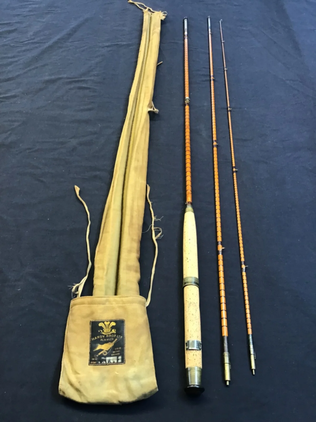 Rare vintage and early Hardy “The Houghton” 10ft 6” 3 piece palakona split cane Fly Rod in excellent original condition. Lockfast joints, burgundy whipped intermediate rings, burgundy intermediate whippings, lined butt ring and a 12” cork handle with single brass slip ring reel seat. This very original rod, stamped A41731 (1909) comes complete with turned hardwood stoppers, spear and Hardy “rod and hand” 3 pocket khaki cloth bad.503