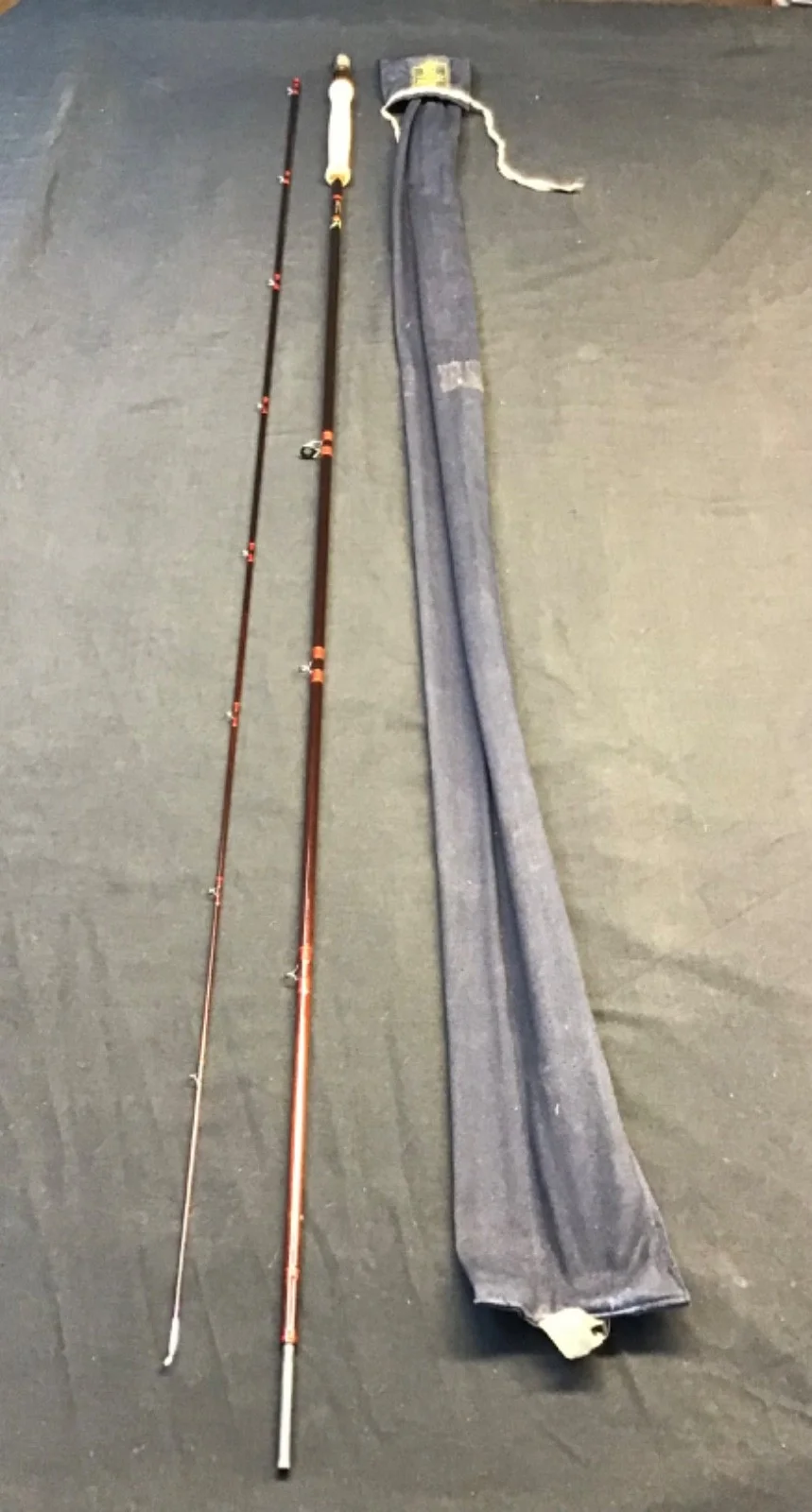 Vintage Hardy “Graphite De luxe” 10ft 6” #7, 2 piece carbon fibre Fly Rod in very good condition. Maroon blanks, burgundy whipped snake eyes, lined butt ring and a cork handle with up-locking reel seat. The rod comes with a Hardy twin pocket blue cloth bag.Un - assembled length 167cm. 505