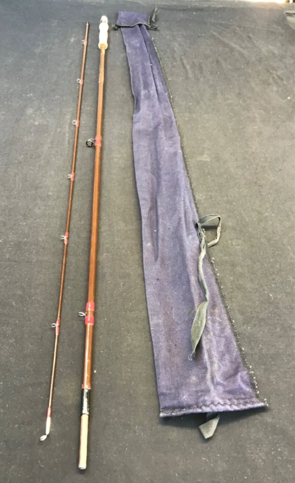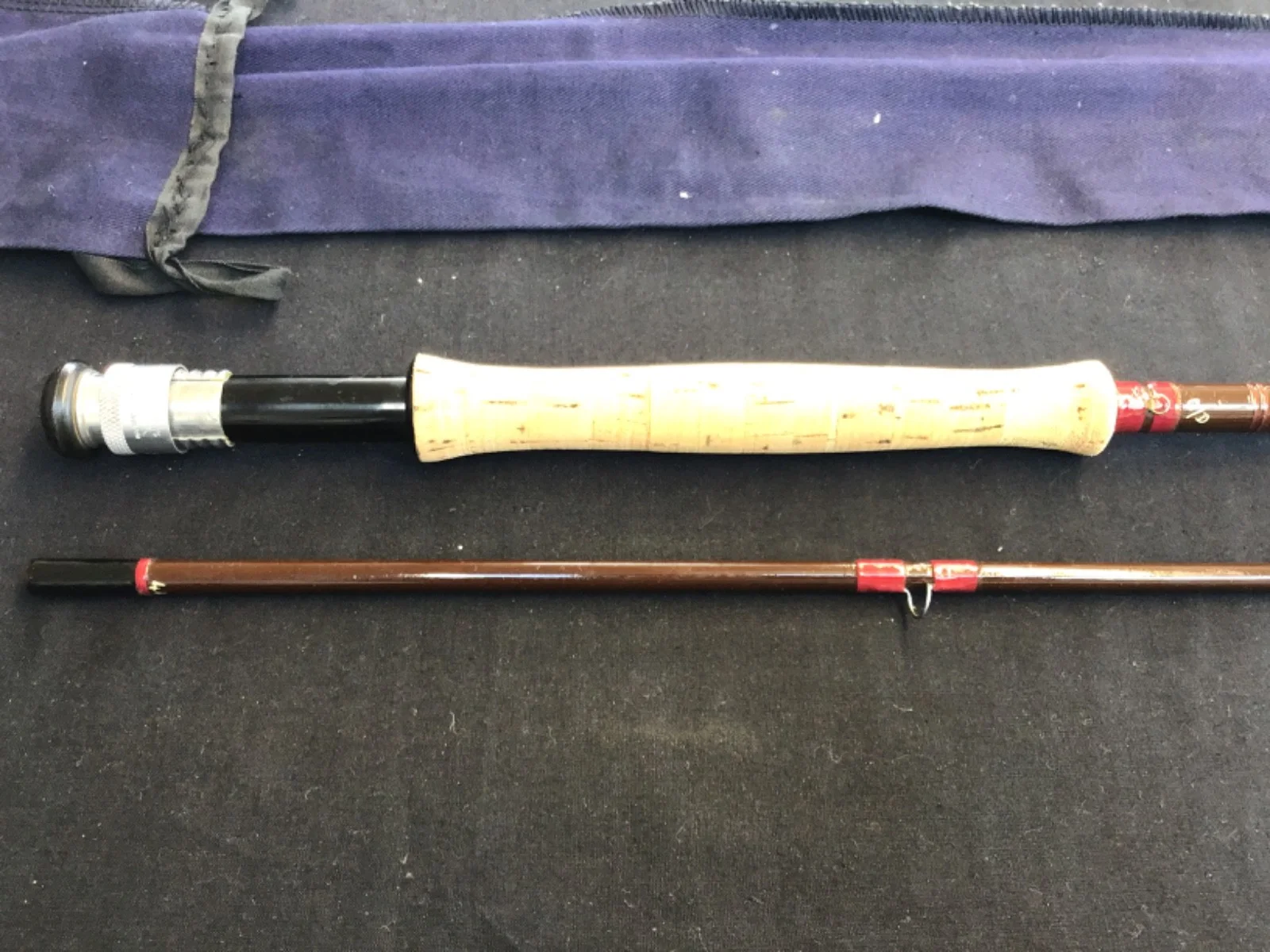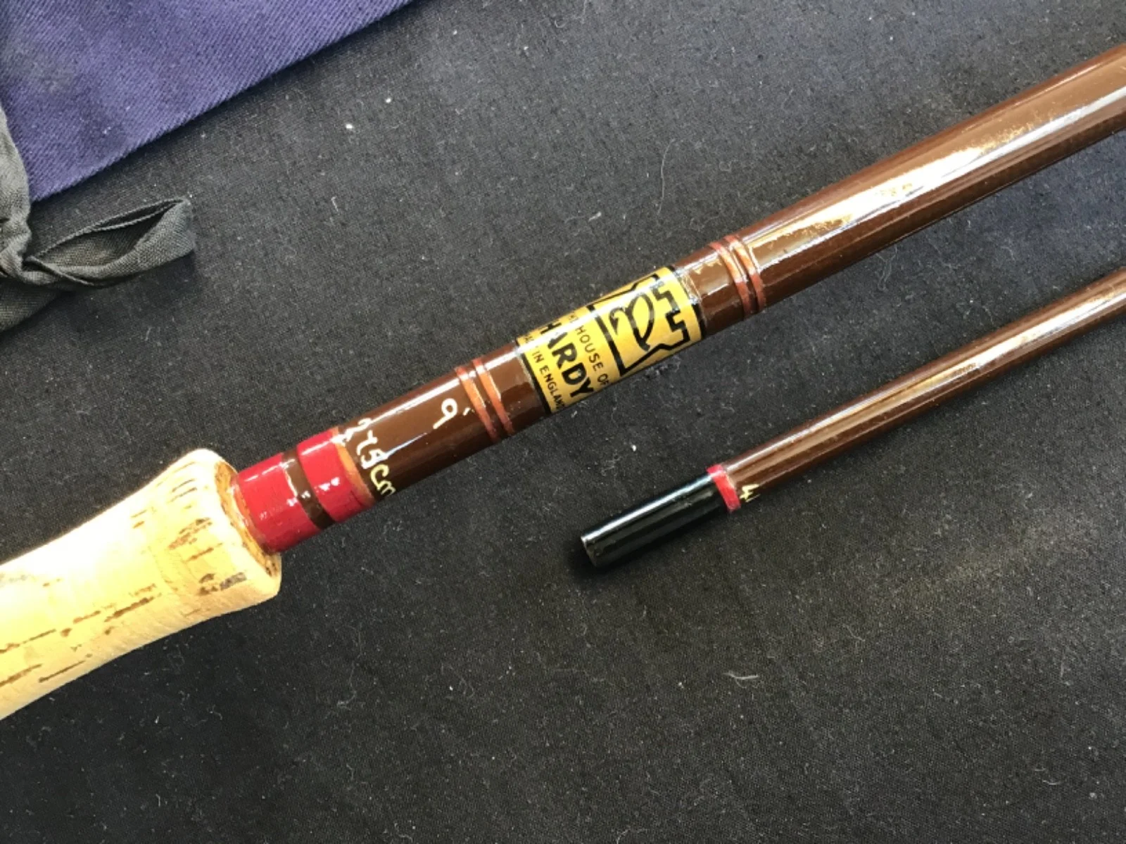 Vintage Hardy “Fibalite” 9ft #7, 2 piece fibreglass Fly Rod in good condition. Brown blanks, maroon whipped snake eyes, 1 lined ring and a cork handle with up-locking reel seat. This rod comes with an unbranded blue cloth bag.Un - assembled length 143cm. 599