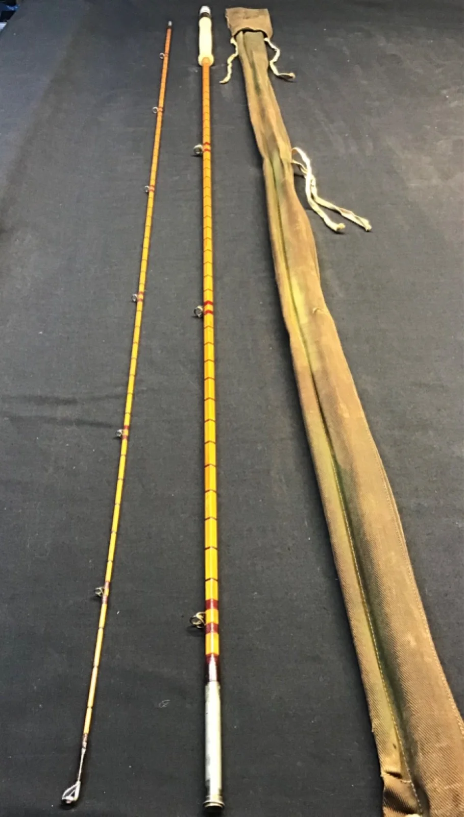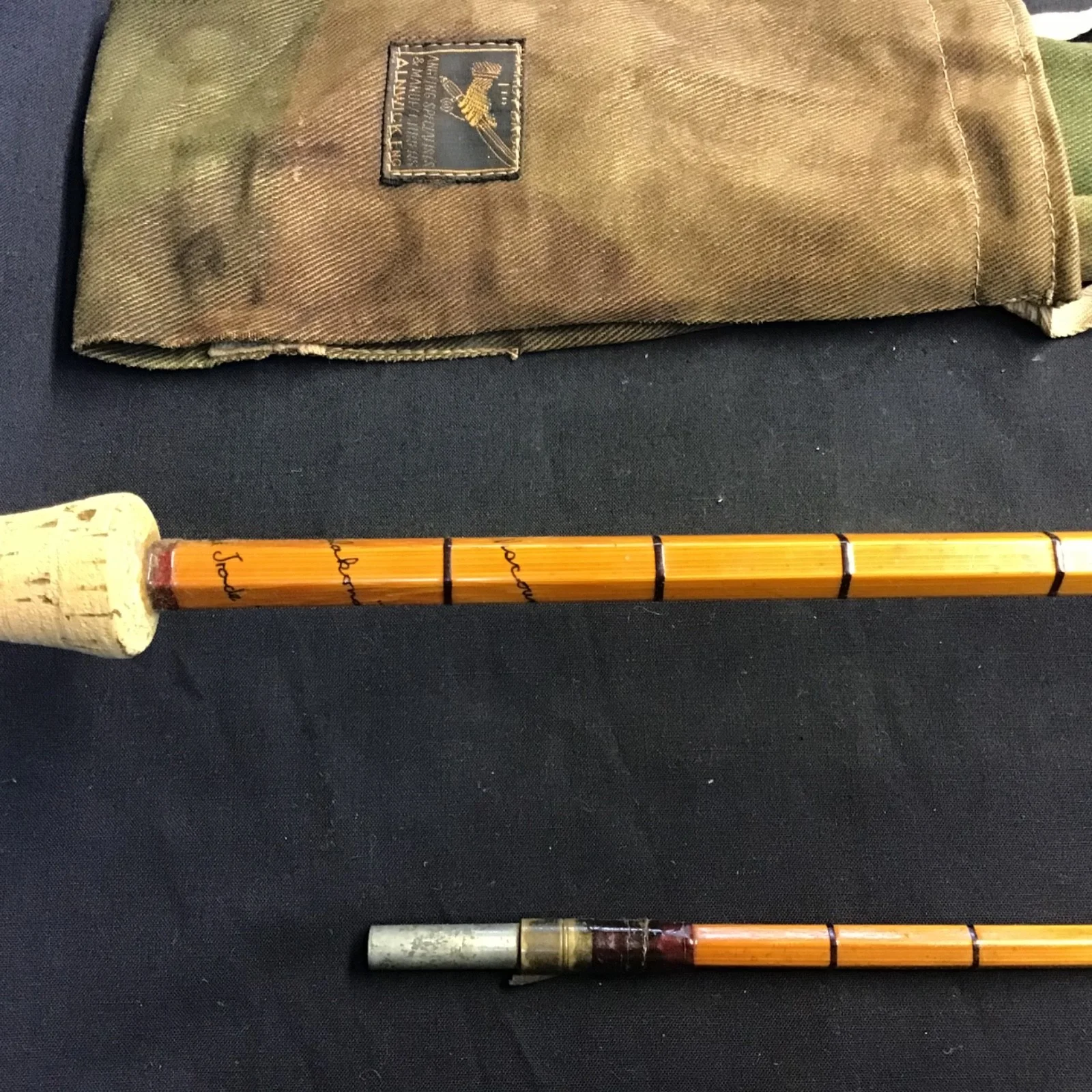 Rare Hardy “The Viscount Grey” 10ft 4” 2 piece Palakona split cane Dry Fly Rod in very good condition. Lockfast joint, red eye and intermediate whippings, lined butt and tip rings, and a 13 1/2” cork handle with up-locking reel seat. This vintage rod, stamped H3010 (1955) comes in its rare Hardy (rod and hand) camouflage design twin pocket cloth bag. Note, slight damage to cork.Un - assembled length 163cm. (461)