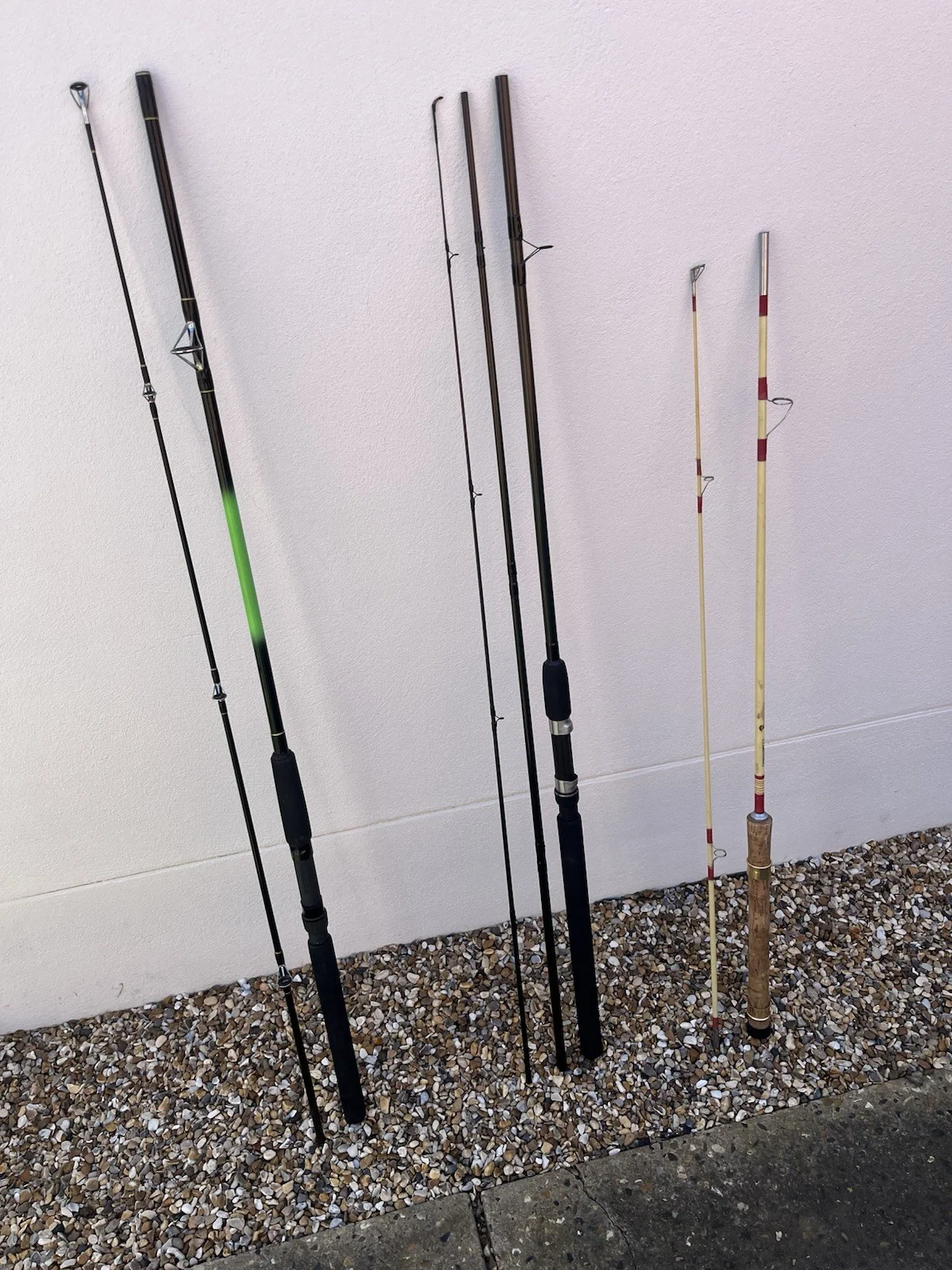 Fresh water fishing gear for 2 people 3x rods2x reelsBait box, net, floats, weights, swivels, line Everything you need for 2 people