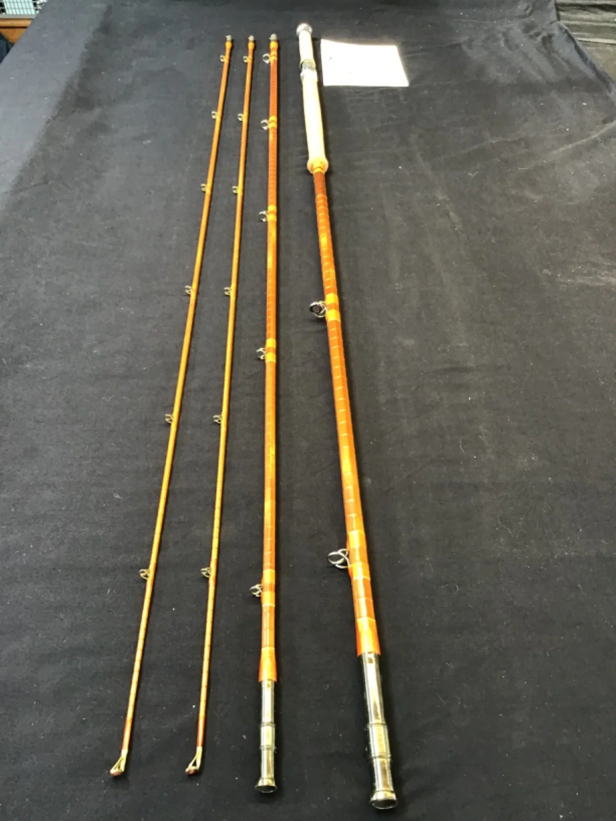 Rare vintage Oliver’s of Knebworth “Salmon Fly Rod” 14ft 3 piece (plus spare tip) split cane Twin Tip Fly Rodd in excellent condition. Pin lock joints, yellow tipped orange eye whippings, orange intermediate whipping, red agate lined butt and tip rings, and a 24” double handed cork handle with down locking reel seat. This original and desirable hand built rod has been maintained to a very high standard; it comes complete with a copy of an Oliver’s catalogue and an unbranded 4 pocket khaki cloth bag.Un - assembled length 148cm. 614