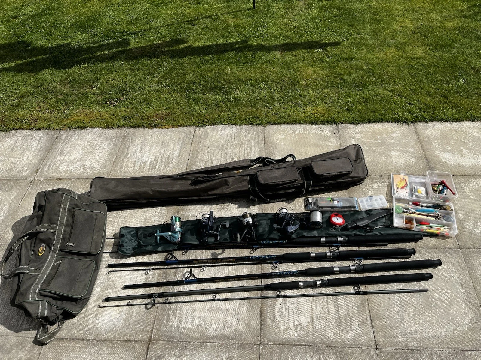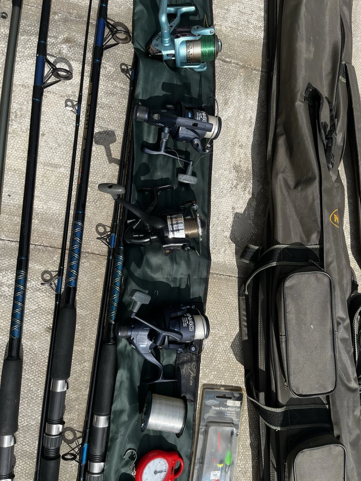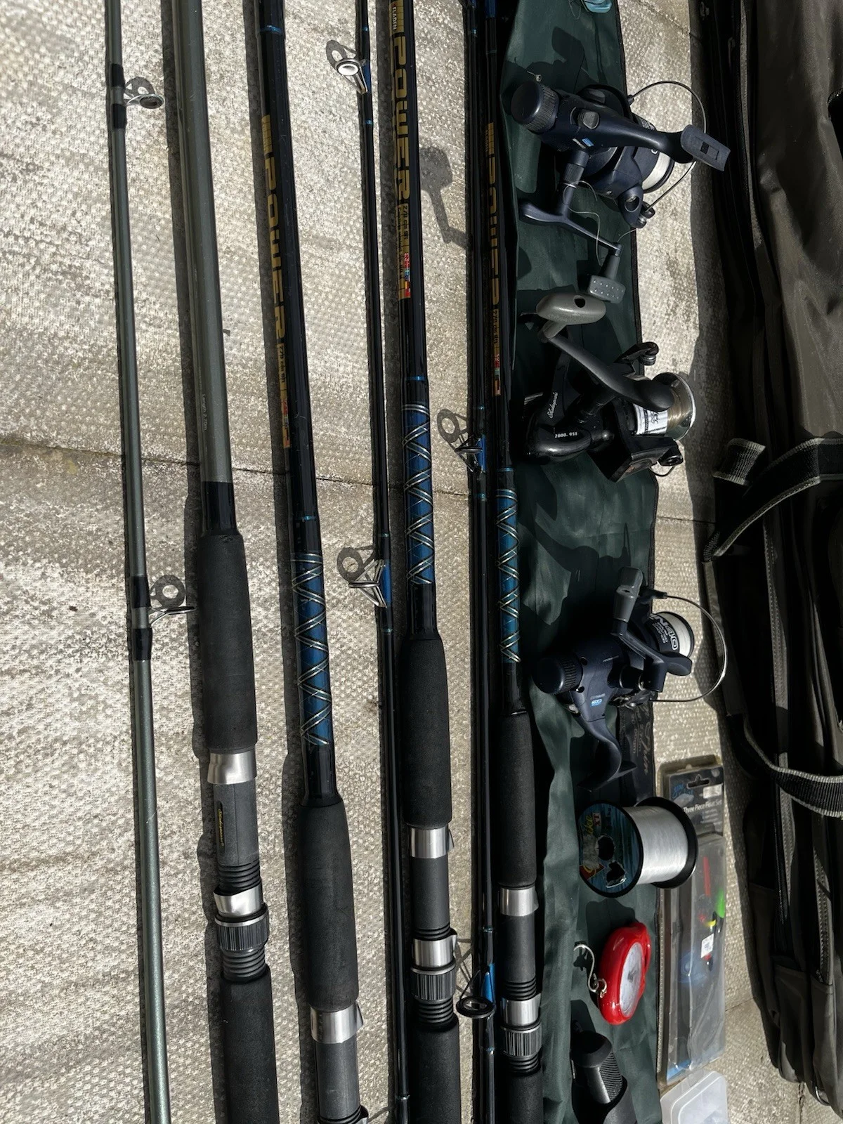 4 rods and reels Shakespeare and Fladin. 4 Reels. Carry bags and other fishing bits. Good condition
