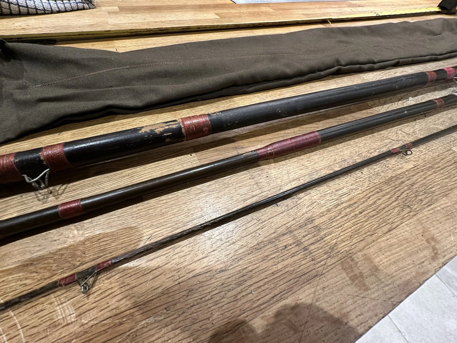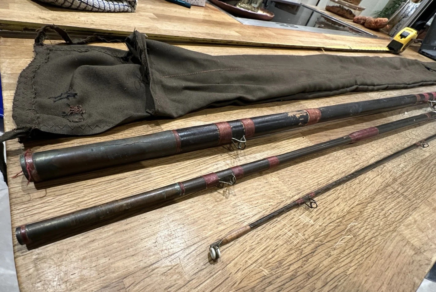This is a very rare Sealey & Sons of Birmingham vintage split cane 3-piece fishing rod with cork handle - 14'6" overall.14'6" Split Cane 3-Piece 500g fishing rod - almost certainly a salmon fly / spinning rod in its day. Ultra lightweight at less than 500g.Unfortunately it has one eyelet missing and would benefit from some tlc - the bag is also showing its age and is not be original but holds it all together.Might simply be there for display or renovation - its a lovely piece - cork handle and aluminium reel fittings. High-quality rod though with minor damage.Hopefully the pictures describe it –- I’ll answer any questions I can but viewing is recommended – I am no expert. Collection and any trial (WR6 – halfway between Hereford and Worcester) is welcome – happy to post with Parcelforce in a rigid tube (1kg) and I can deliver locally if that helps.Please check my other listings which include a variety of other working tools and odds and ends – I am happy to combine to reduce postage cost and arrange shipment anywhere - thanks for looking.