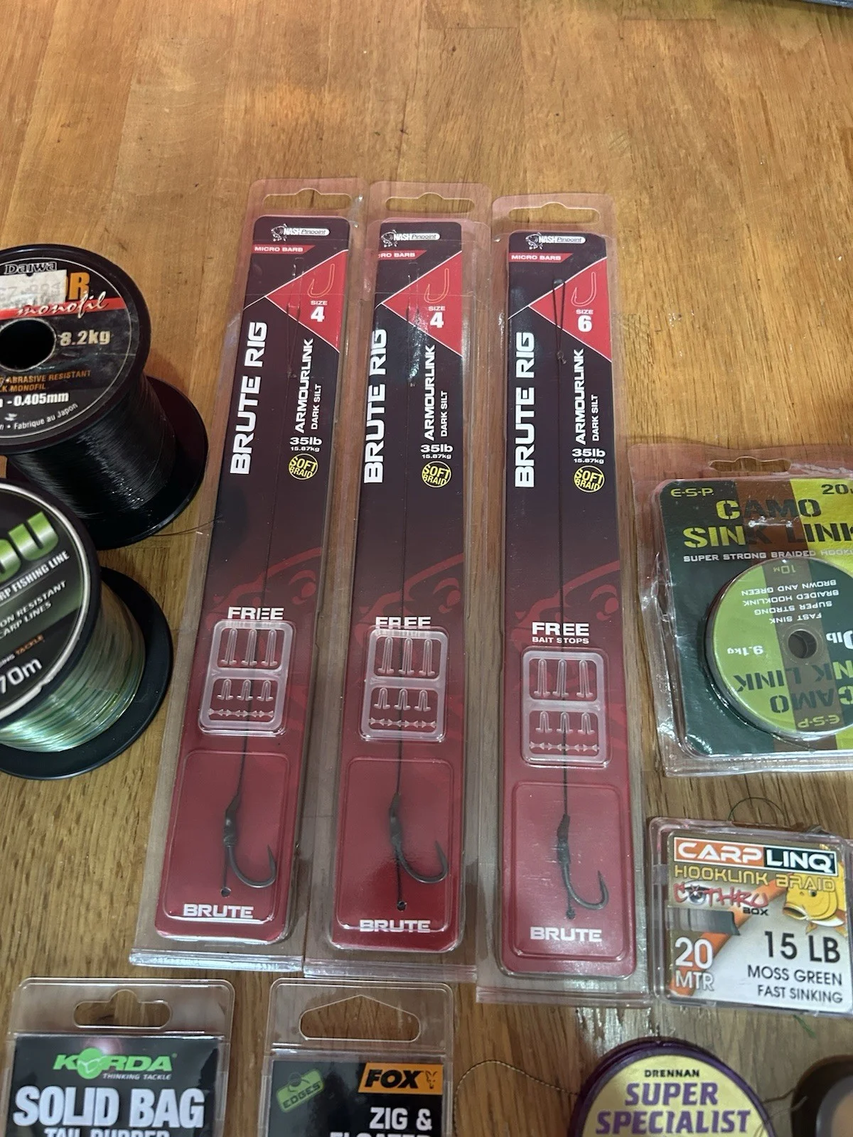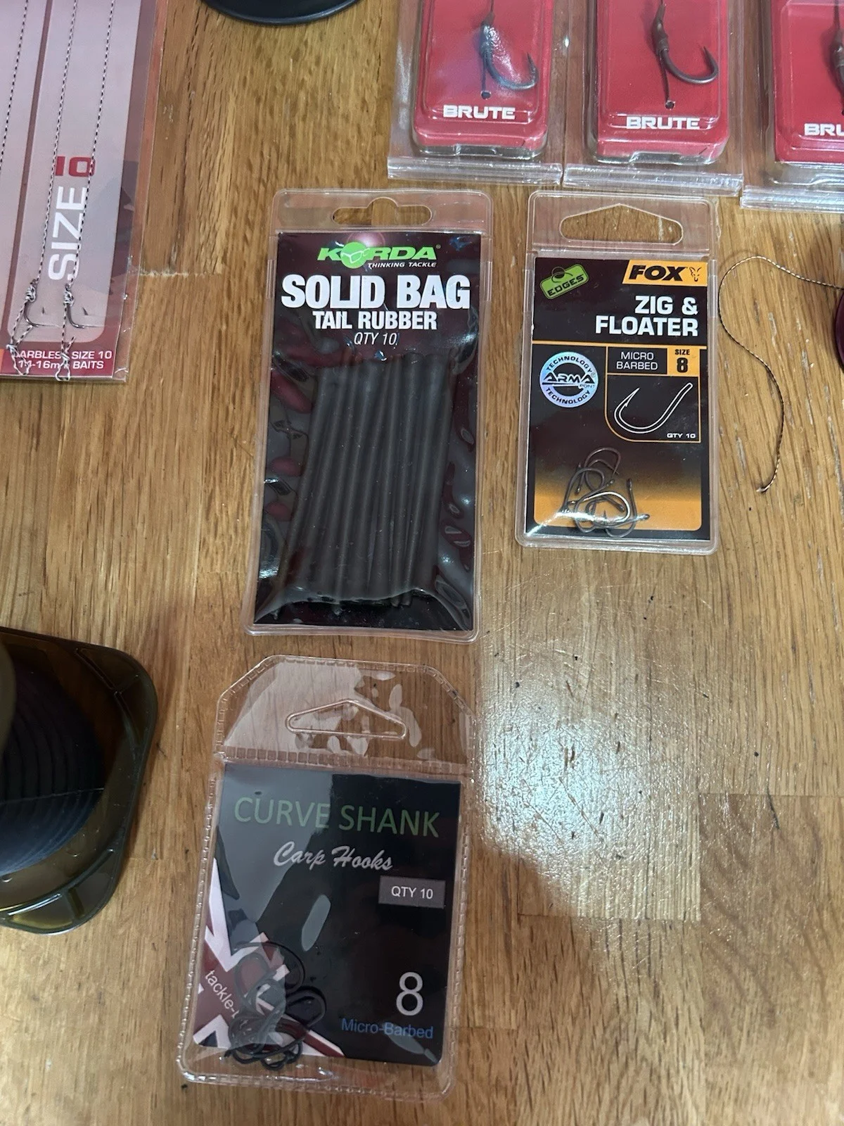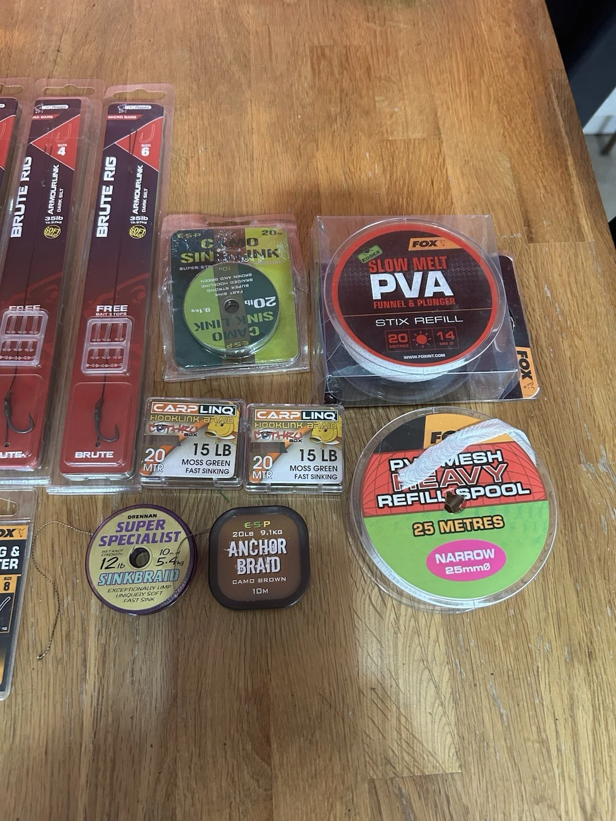 For sale carp end tackle bundle including Fox , Nash , Esp and others . Mixed bundle of items some used some unused included are Unopened Nash rigs , Fox pva webbing , an assortment of braided hooklink 2x Korum rig blox . See pictures for what’s included some items are quite expensive new so grab a bargain . Any questions just ask .