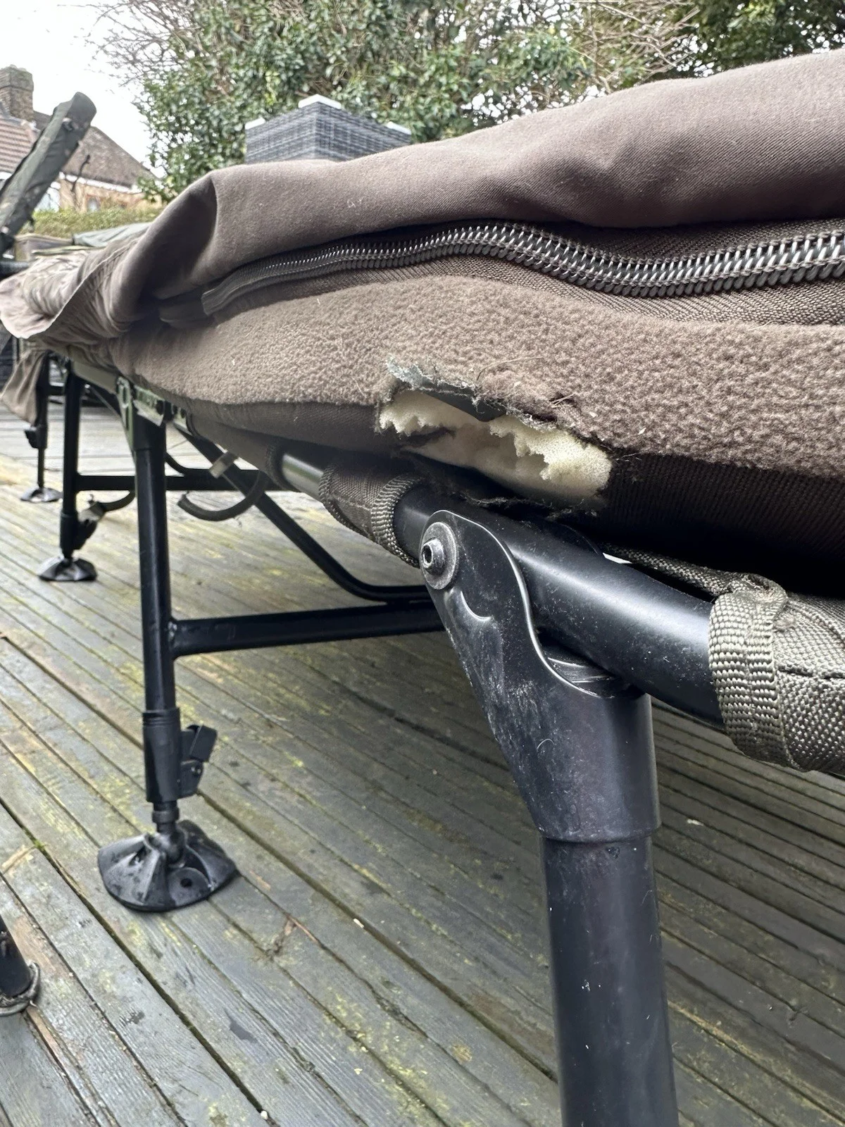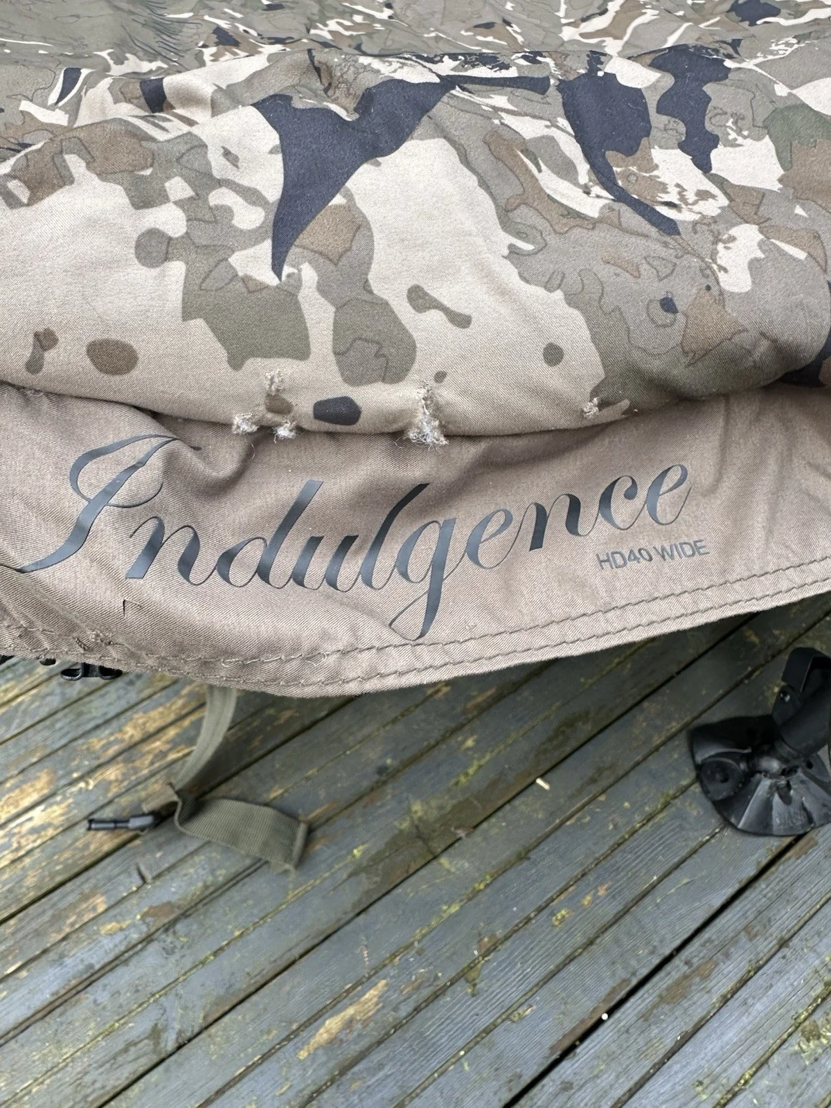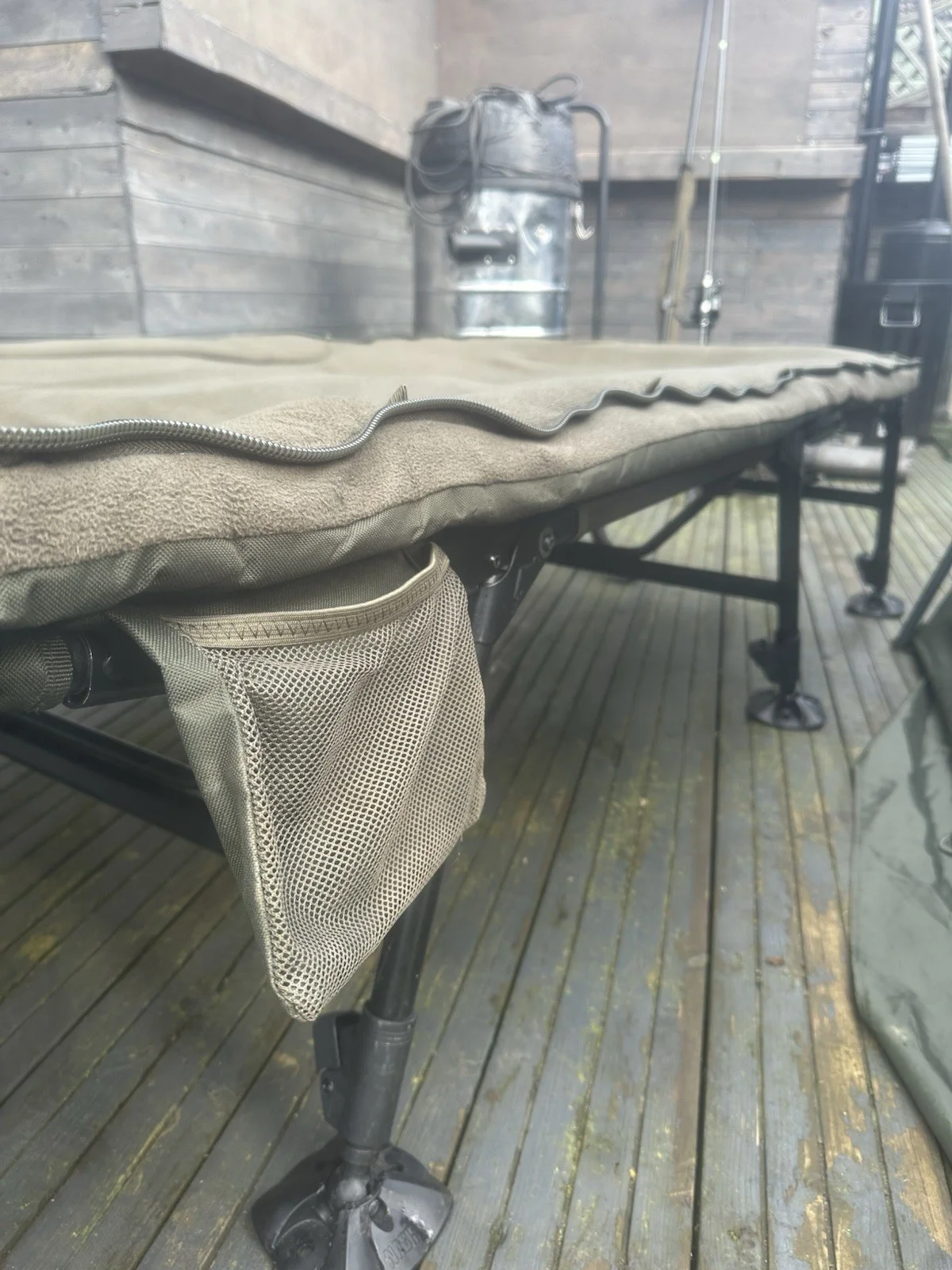 The Nash Indulgence HD40 8 Leg Wide Camo Sleep System is a premium carp fishing bedchair designed for comfort. Small tear along this side as seen in picture, no other issues with this.