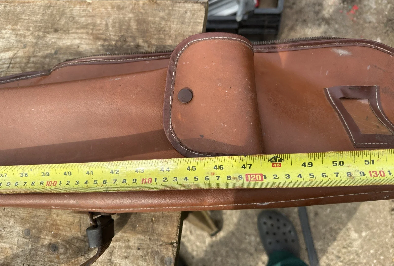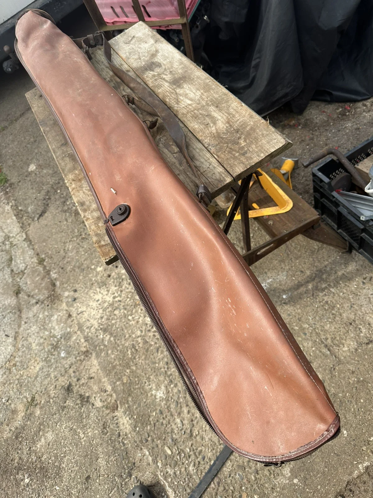 This is a used bag that came to me with fishing rods - but could as likely be a gun bag or even a golf bag. It has two pockets - the main case being 1.4m long with a leather end cap which has become rigid and would need some tlc to resoften I guess. It once had a suitcase style handle - now broken but it does have a good leather shoulder strap and has a rigid spine to kee it all straight.I think the main bag is plasticised material the straps and boot are leather and the top zi is brass. No makers marks on it but it does make a decent rod bag for a number of rods / stands etc.Hopefully the pictures describe it –- I’ll answer any questions I can but viewing is recommended – I am no expert. Collection and any trial (WR6 – halfway between Hereford and Worcester) is welcome – too long to post with anyone except Parcelforce - but I can deliver locally if that helps.Please check my other listings which include a variety of other working tools and odds and ends – I am happy to combine to reduce postage cost and arrange shipment anywhere - thanks for looking.